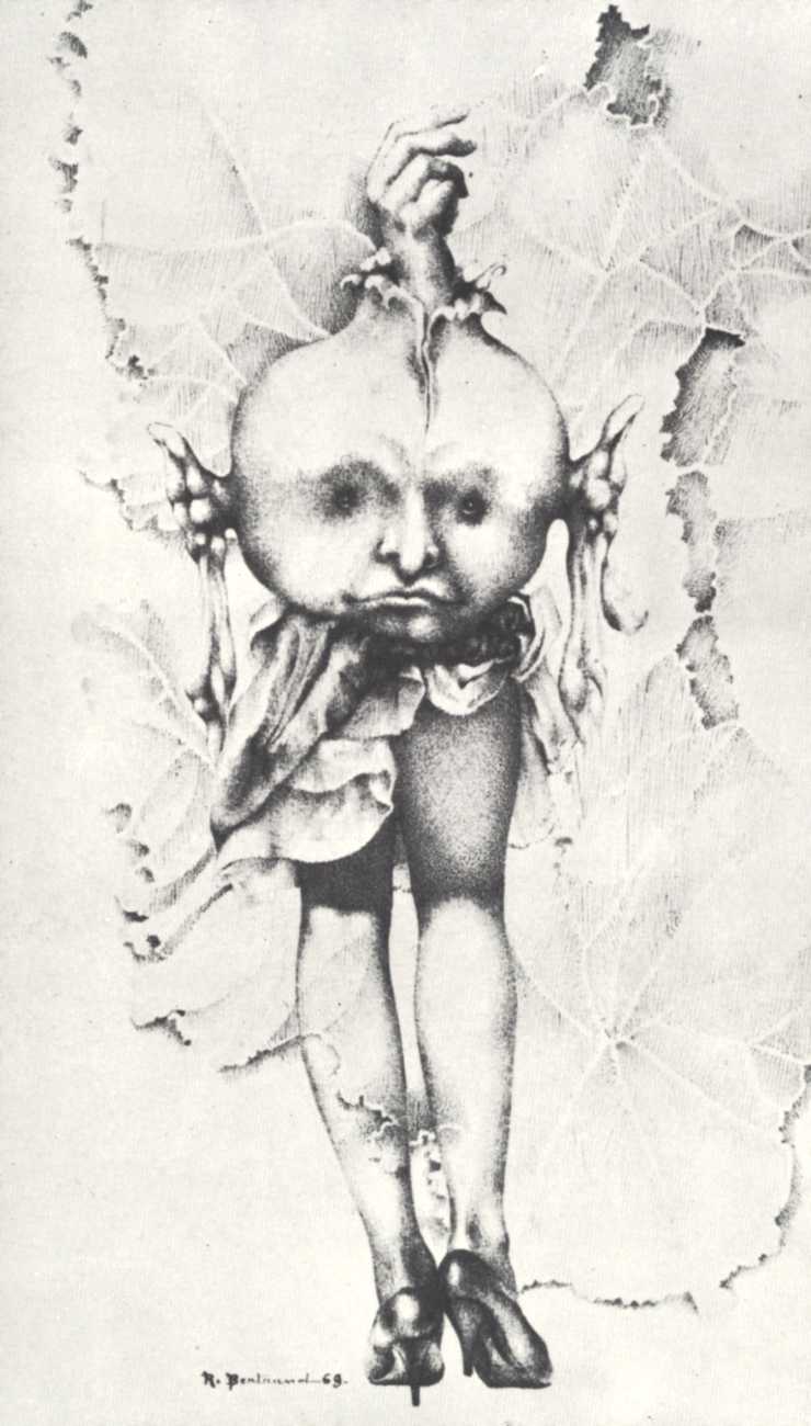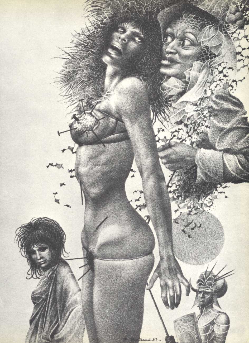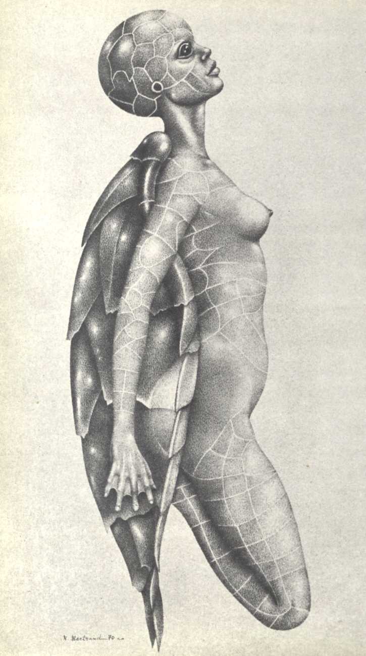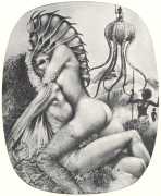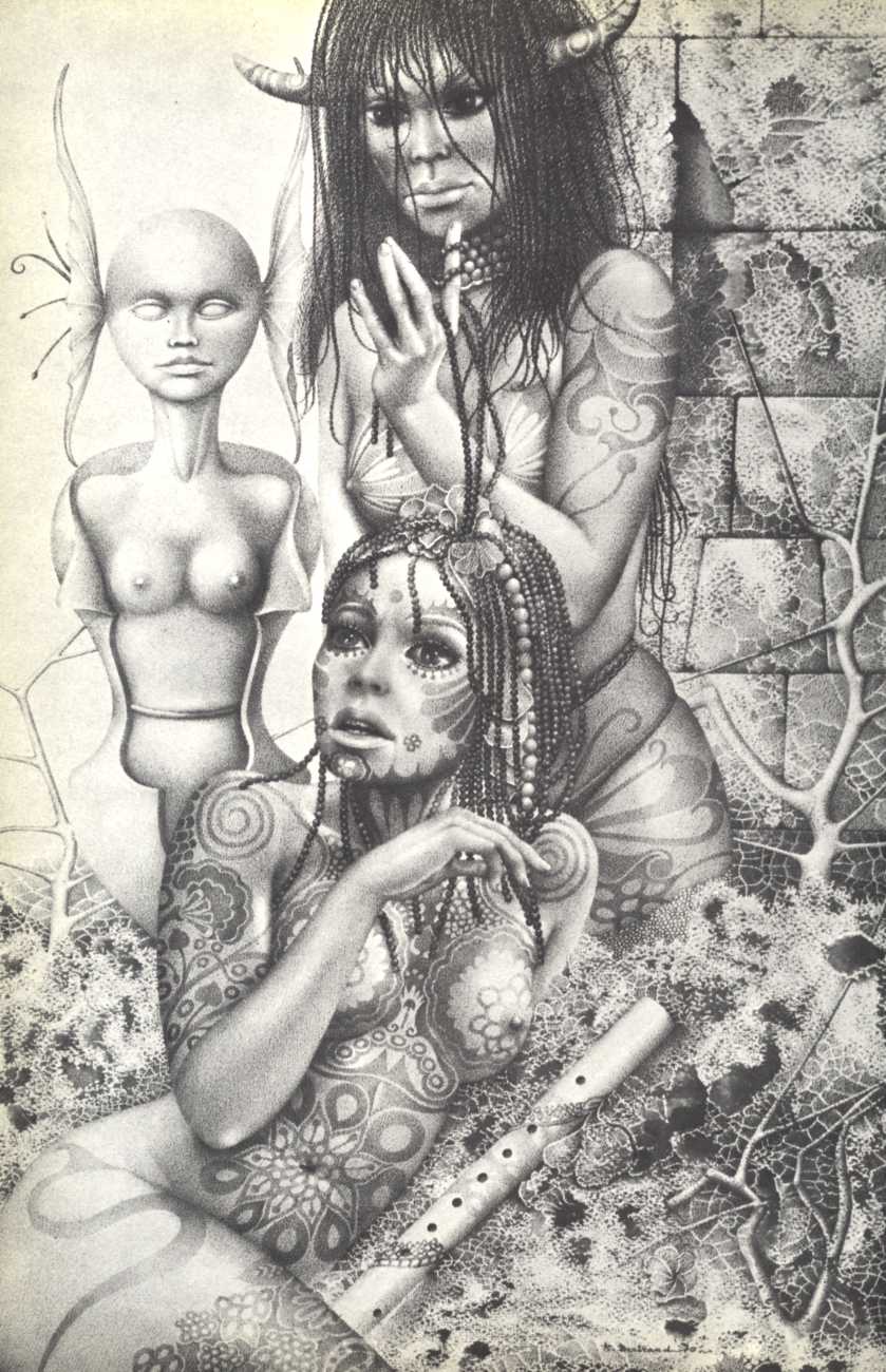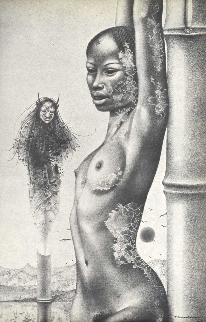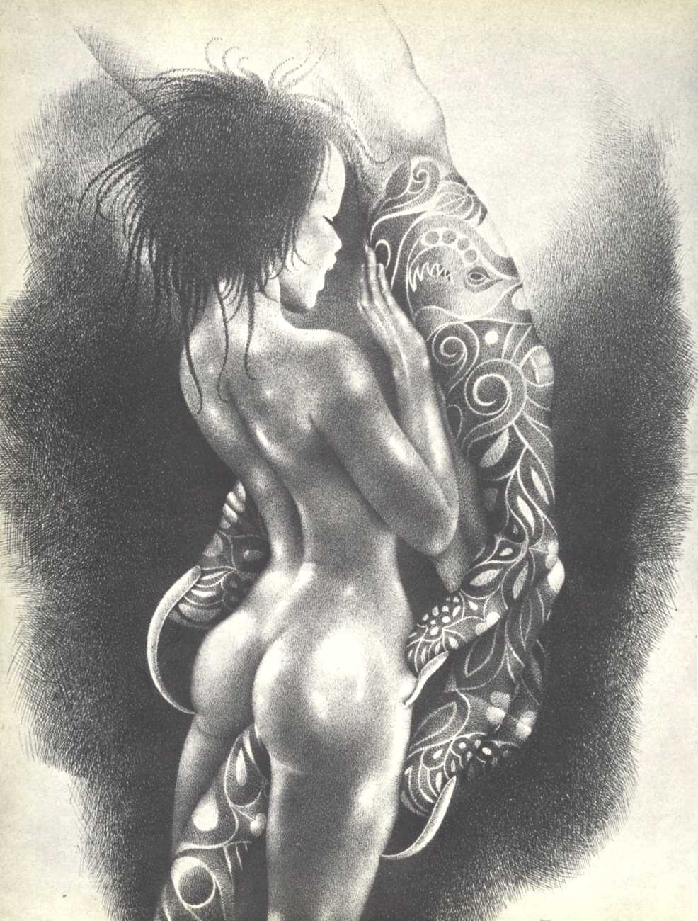 The ostentatious introduction to this second collection is by the Francophone Belgian poet, novelist, essayist and literary critic Hubert Loescher, writing under the pseudonym he often used of Hubert Juin. Its overblown style matches the artwork perfectly: ‘In the hamlet of sex we participate in peasant nuptuals, and fairs with many a young virgin. The evening brings slow caresses to the festivities. The cosy village nestles in the hips of a young woman who stretches languidly between us and the sea. Her hair is the distant forest, and the hills her breasts behind which the sun sets. Now sleeping, her back has the texture of the forest, and red berries bejewel her mouth and lips.’