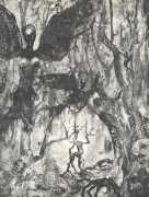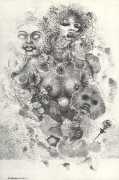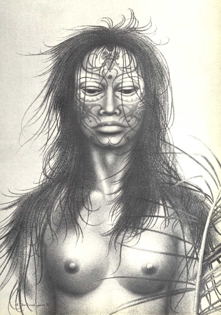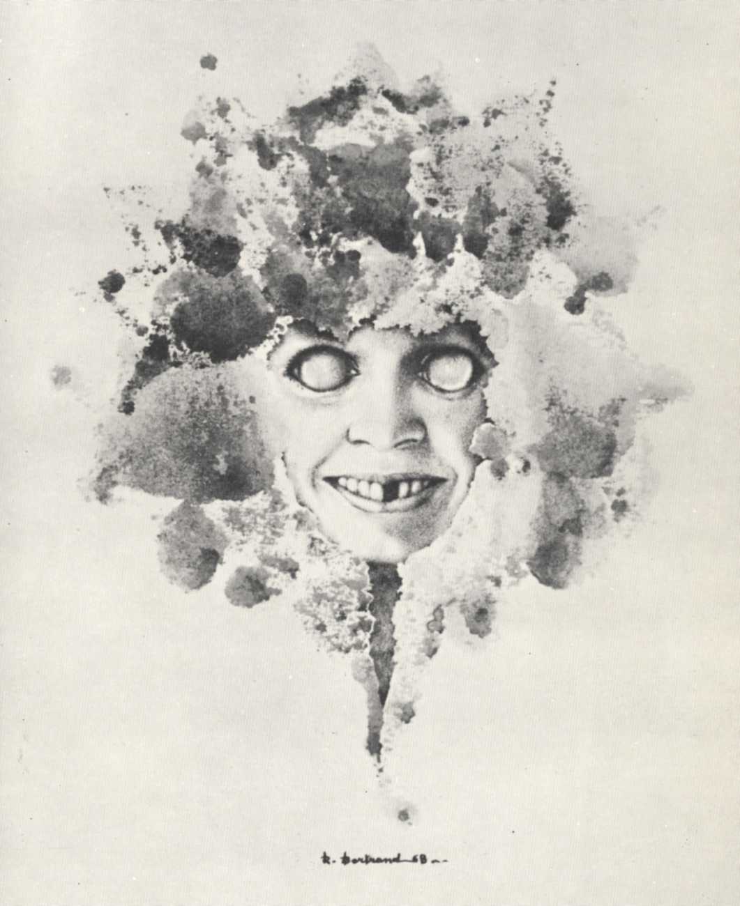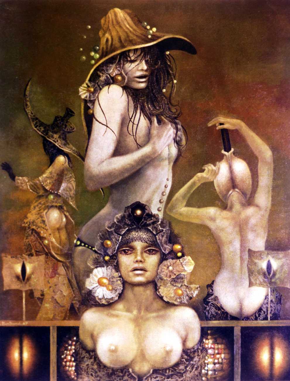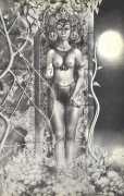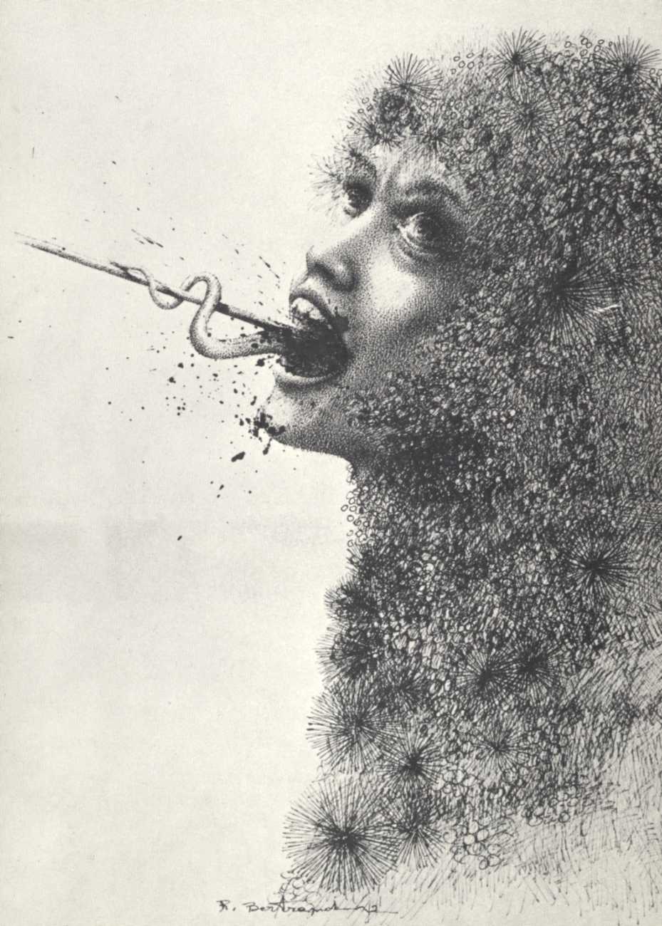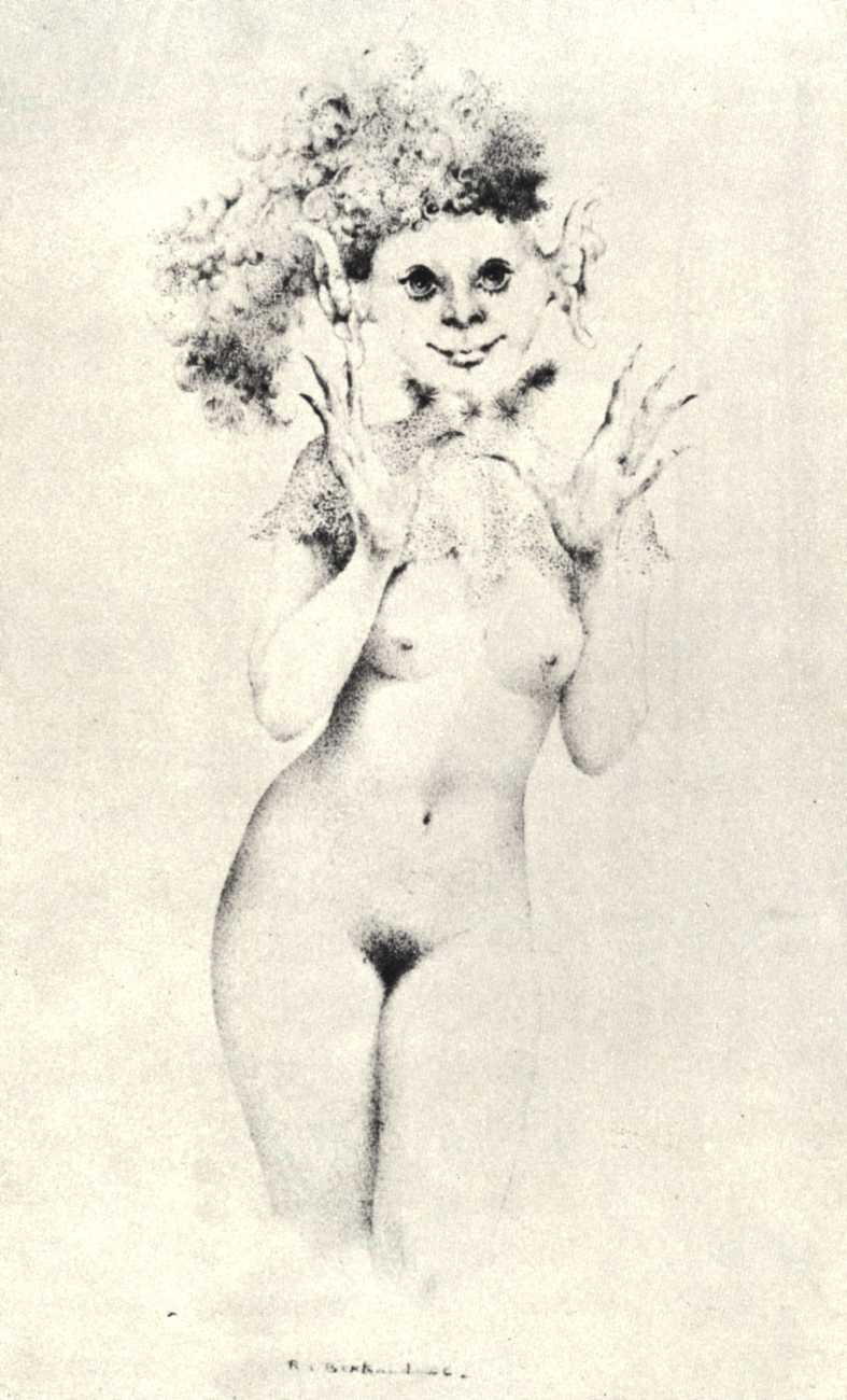 The ostentatious introduction to this second collection is by the Francophone Belgian poet, novelist, essayist and literary critic Hubert Loescher, writing under the pseudonym he often used of Hubert Juin. Its overblown style matches the artwork perfectly: ‘In the hamlet of sex we participate in peasant nuptuals, and fairs with many a young virgin. The evening brings slow caresses to the festivities. The cosy village nestles in the hips of a young woman who stretches languidly between us and the sea. Her hair is the distant forest, and the hills her breasts behind which the sun sets. Now sleeping, her back has the texture of the forest, and red berries bejewel her mouth and lips.’