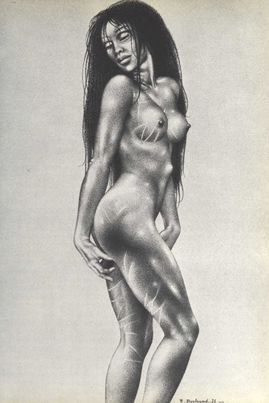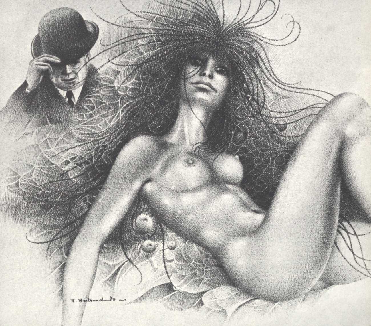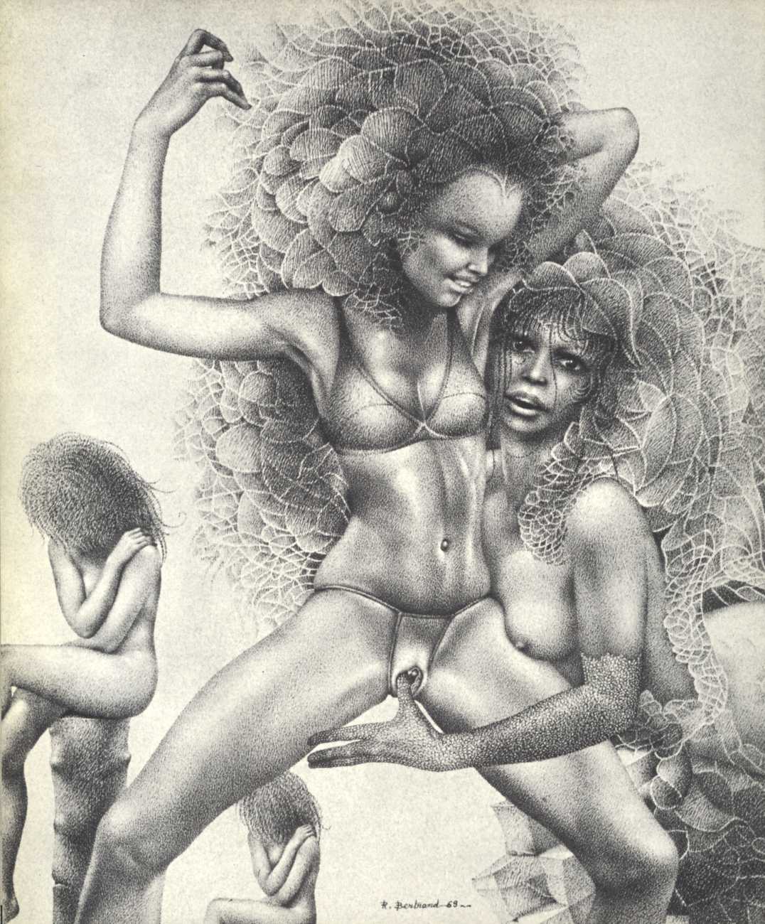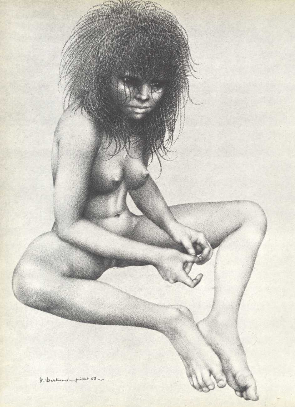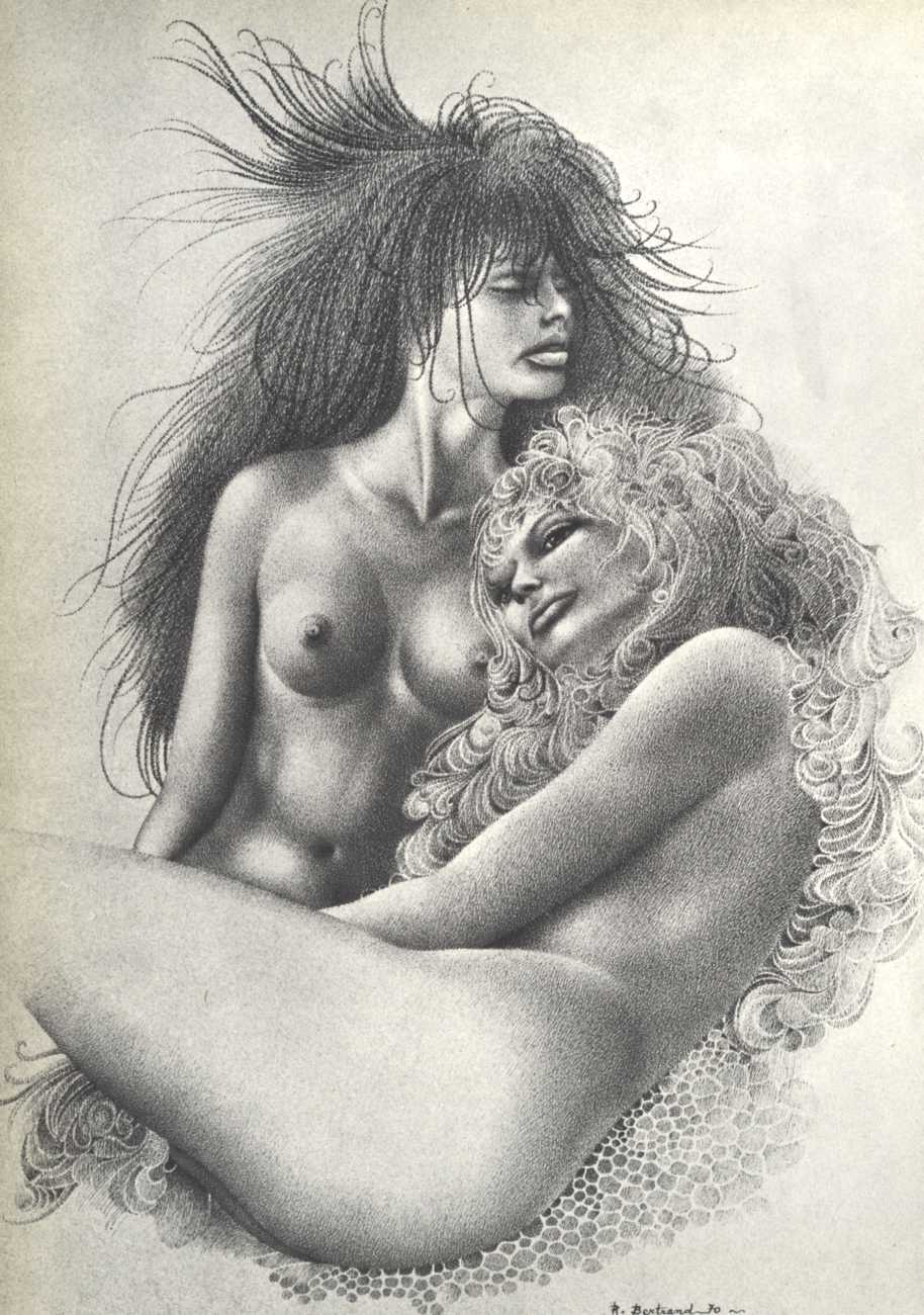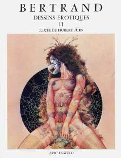 The first Losfeld portfolio of Bertrand drawings was so successful that a second volume, Dessins érotiques II, followed two years later, containing twelve full-colour paintings and 117 new drawings. The series of drawings which appears after the colour plates are more explicit than the artist’s previous published output, and include several which depict, or at least suggest, the involvement of male appendages as well as Bertrand’s ever-present female breasts and buttocks.