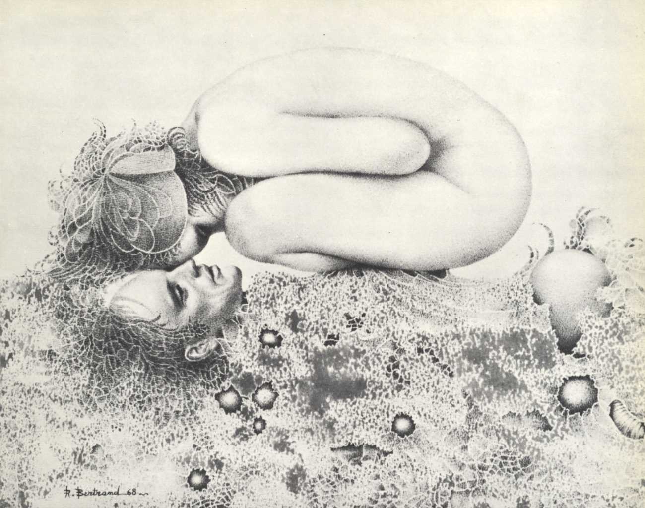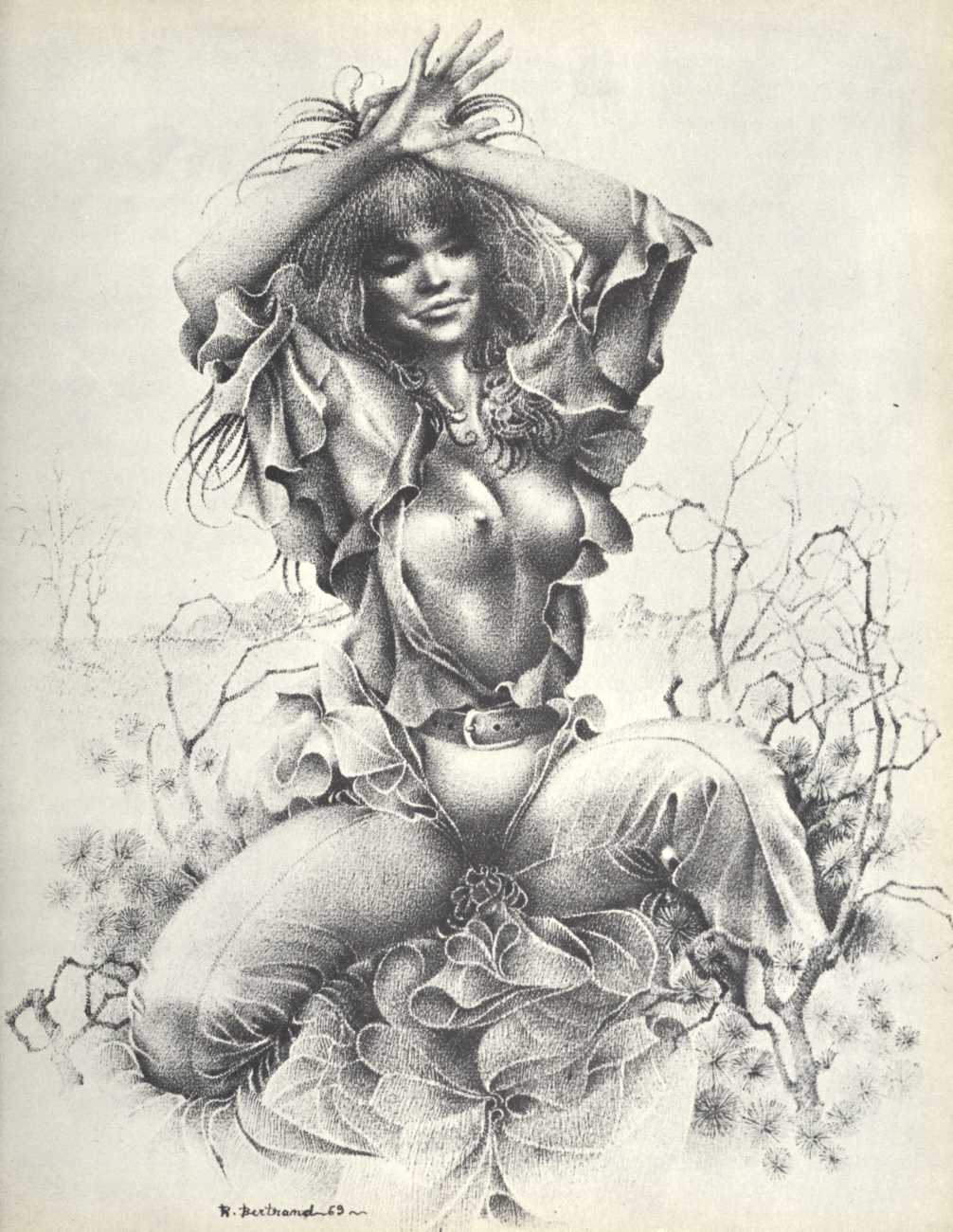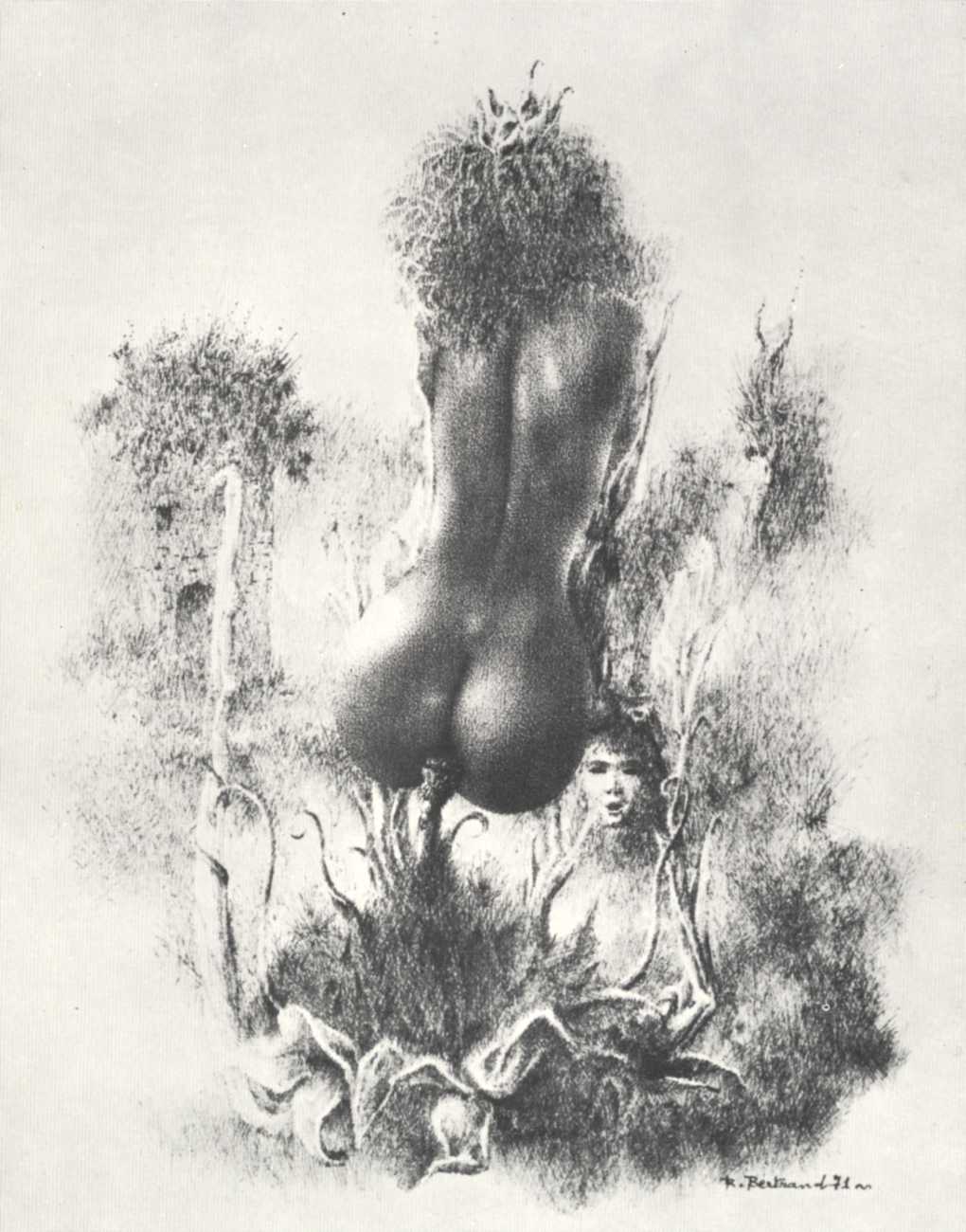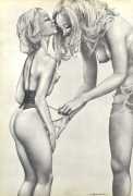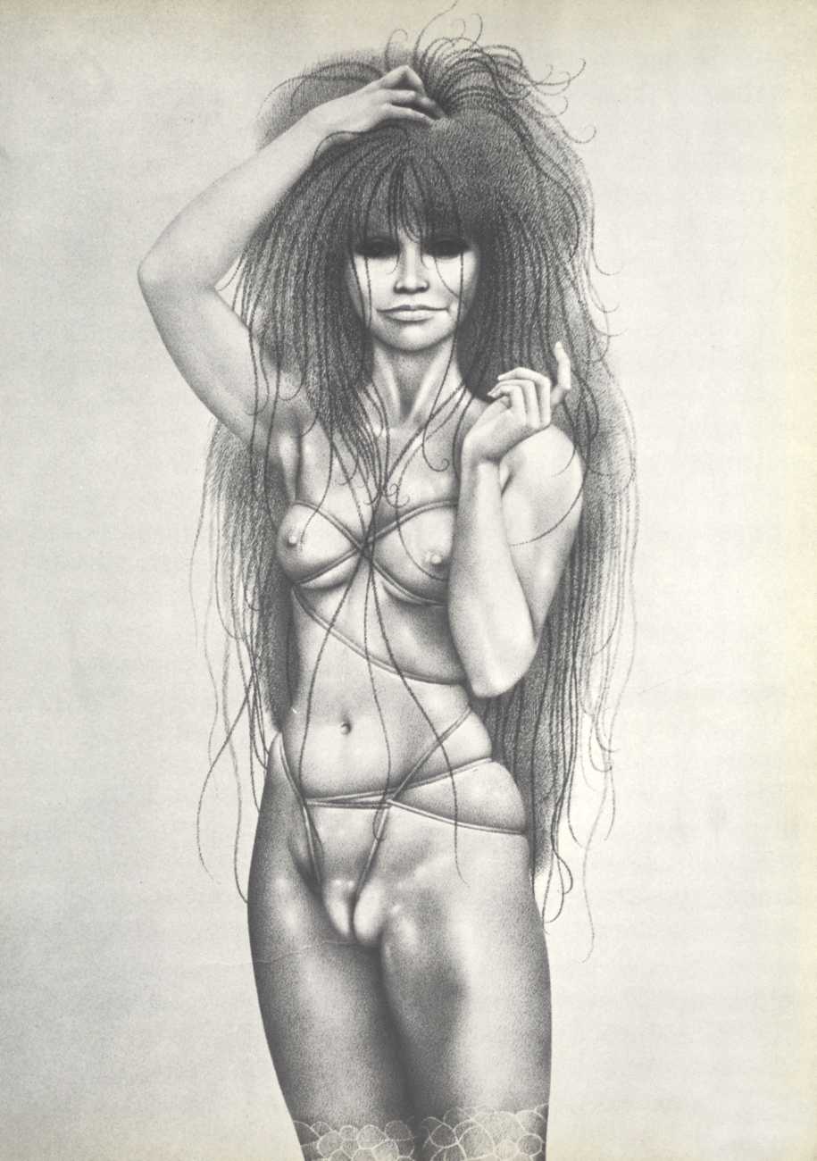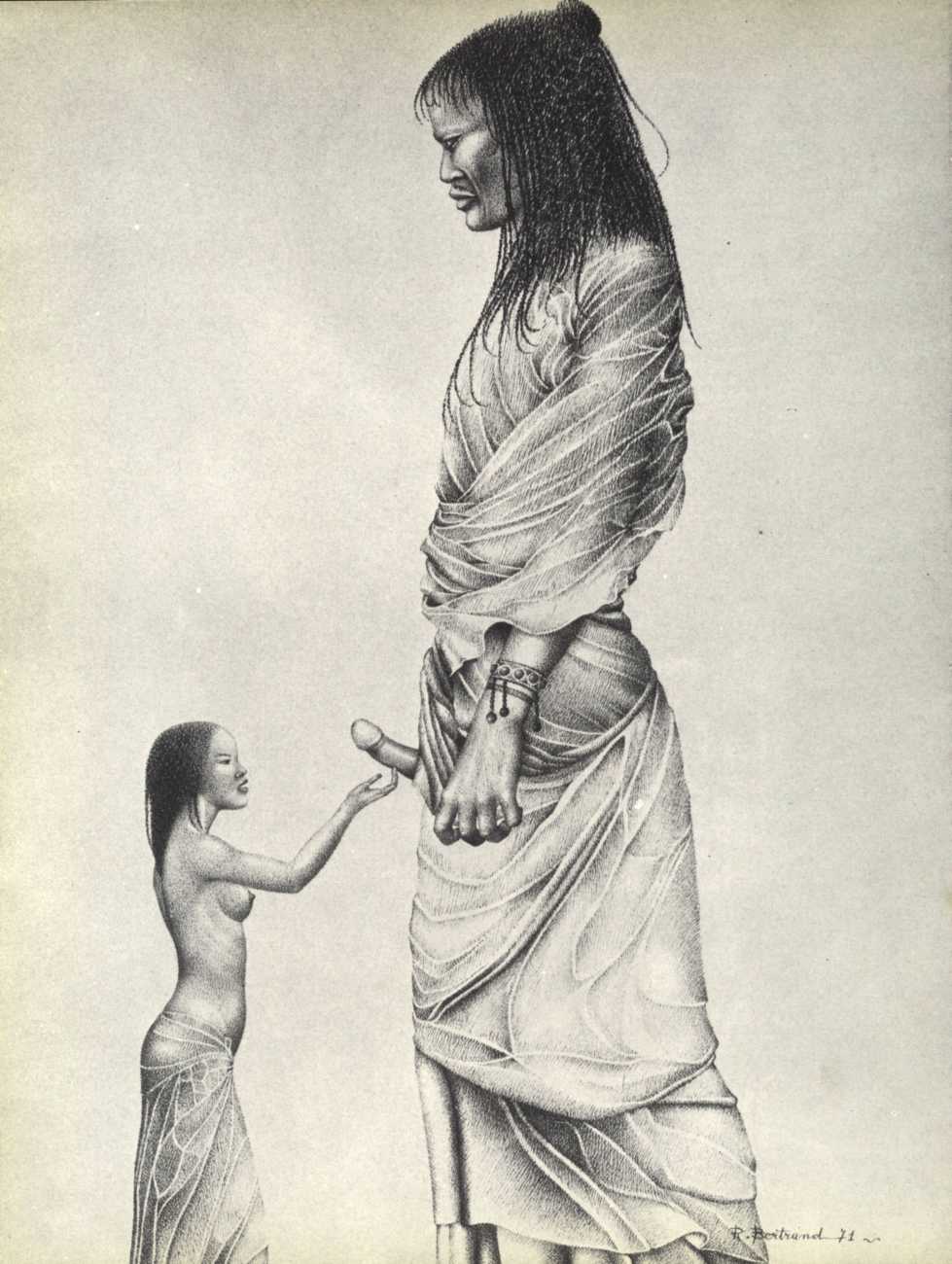 The first Losfeld portfolio of Bertrand drawings was so successful that a second volume, Dessins érotiques II, followed two years later, containing twelve full-colour paintings and 117 new drawings. The series of drawings which appears after the colour plates are more explicit than the artist’s previous published output, and include several which depict, or at least suggest, the involvement of male appendages as well as Bertrand’s ever-present female breasts and buttocks.