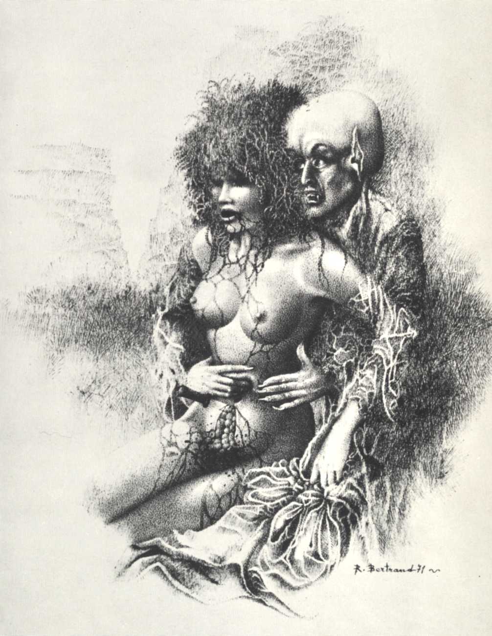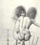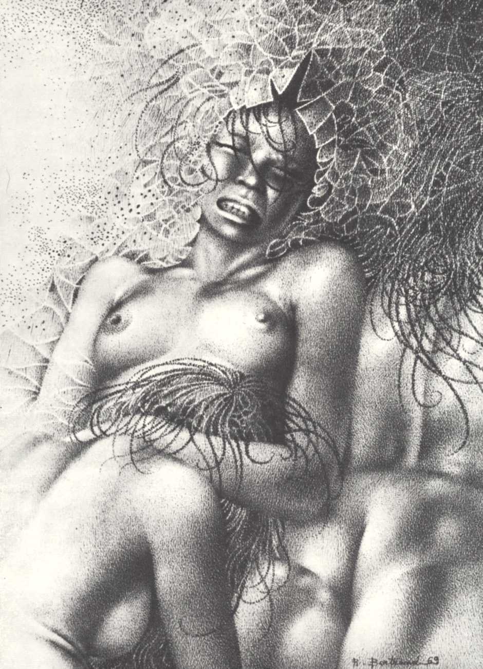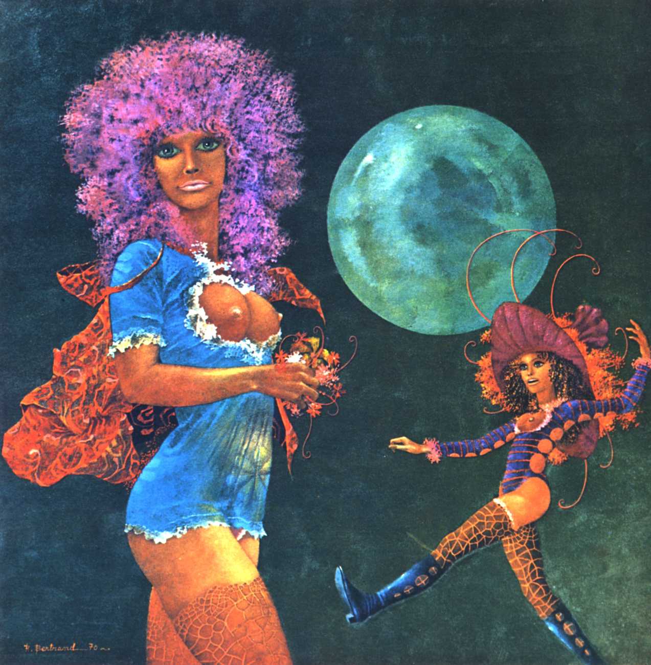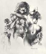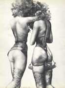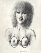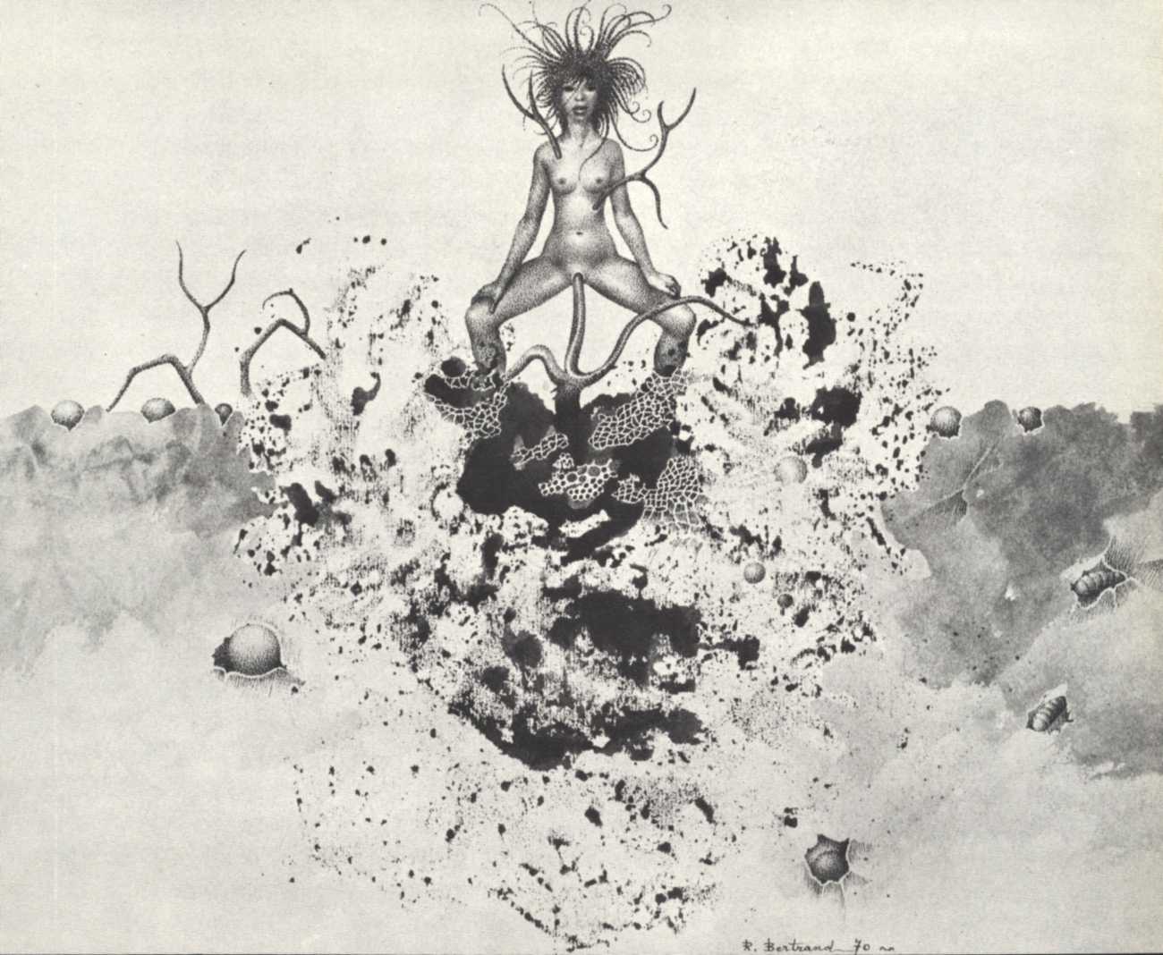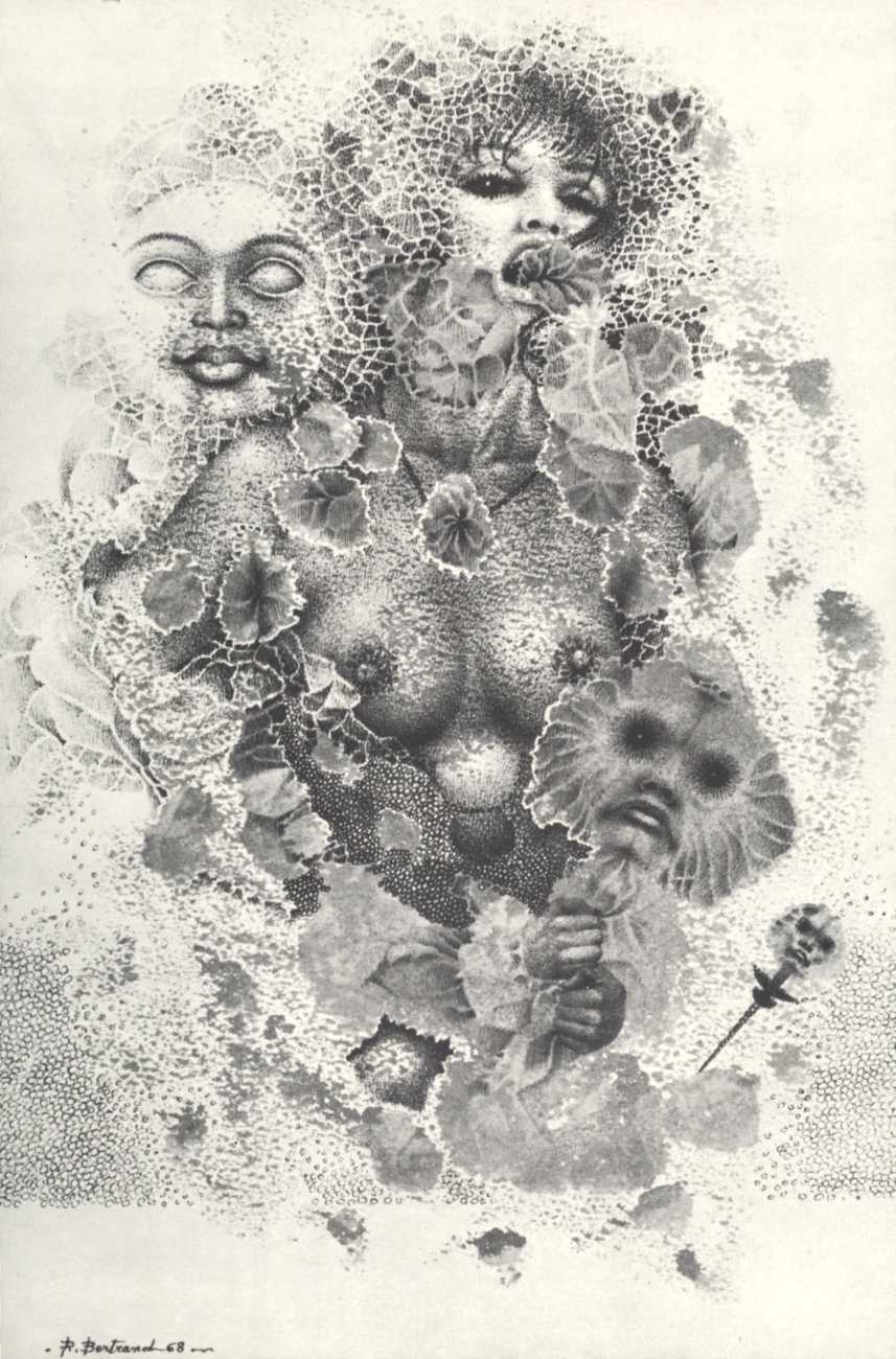 The first Losfeld portfolio of Bertrand drawings was so successful that a second volume, Dessins érotiques II, followed two years later, containing twelve full-colour paintings and 117 new drawings. The series of drawings which appears after the colour plates are more explicit than the artist’s previous published output, and include several which depict, or at least suggest, the involvement of male appendages as well as Bertrand’s ever-present female breasts and buttocks.