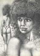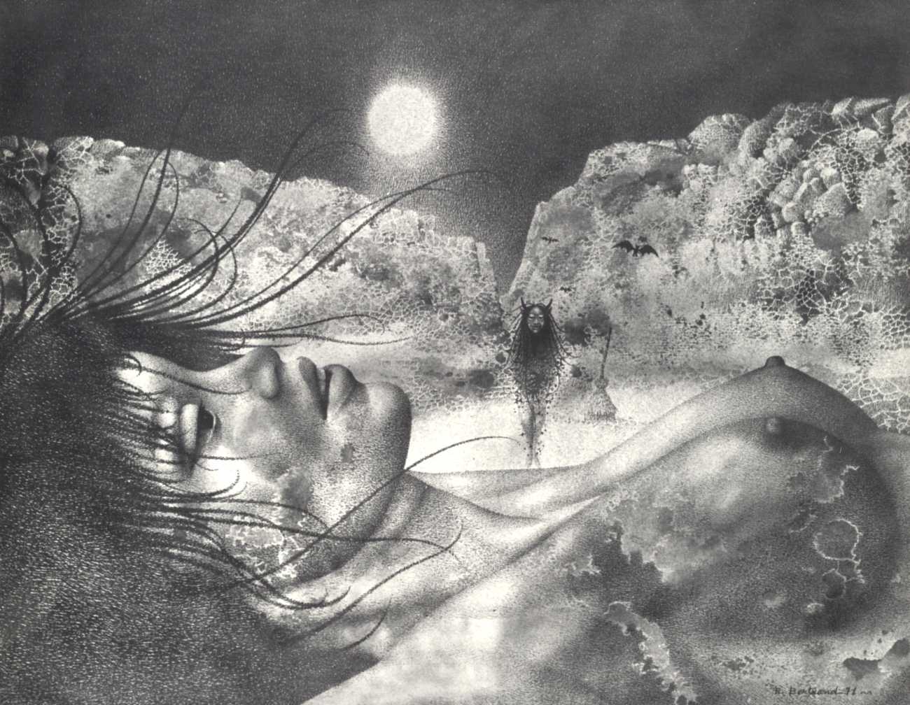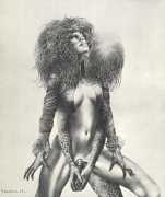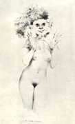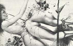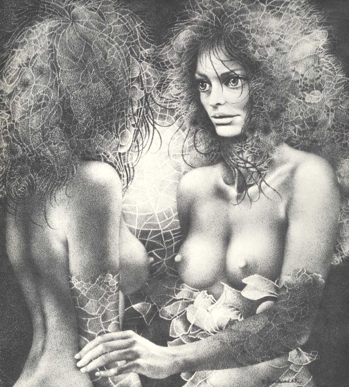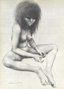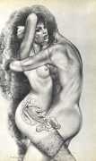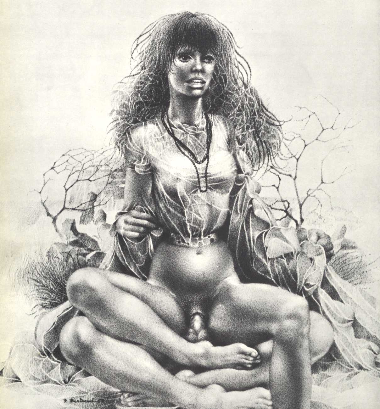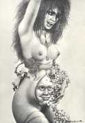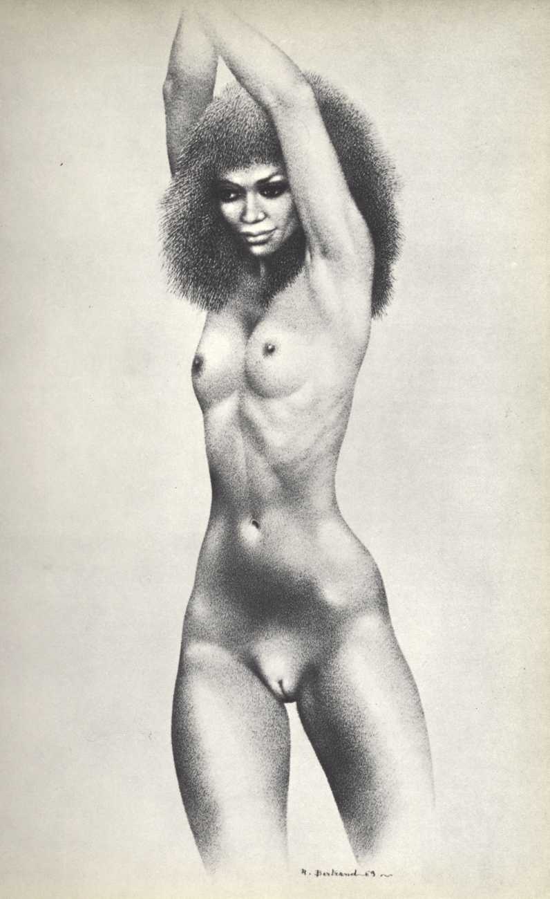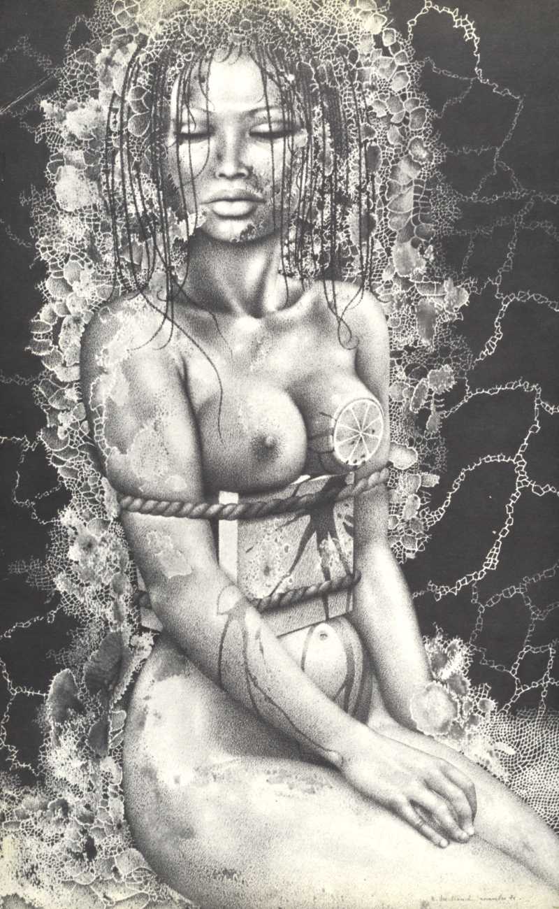 The first Losfeld portfolio of Bertrand drawings was so successful that a second volume, Dessins érotiques II, followed two years later, containing twelve full-colour paintings and 117 new drawings. The series of drawings which appears after the colour plates are more explicit than the artist’s previous published output, and include several which depict, or at least suggest, the involvement of male appendages as well as Bertrand’s ever-present female breasts and buttocks.