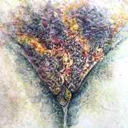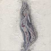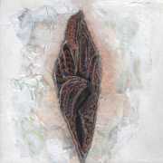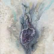 Each 6-inch square painting takes 25–35 hours of work. Secor’s sculptural style involves sculpting the crevasses with paper and gesso, so her subjects protrude from the canvas and demand attention. She draws in the eye with colourful acrylic, watercolour, ink and soft pastel, creating a collage-like aesthetic by incorporating torn-up sketches. Surreal nature motifs elevate her skilful attention to the female form. ‘Once the piece is done it’s actually interactive, which is hard to see in a picture. You can carefully push or pull the layers to see different patterns in-between and underneath,’ she explains.