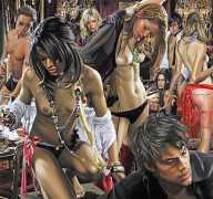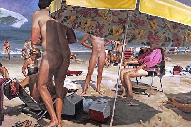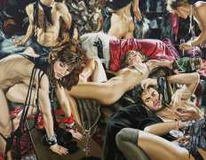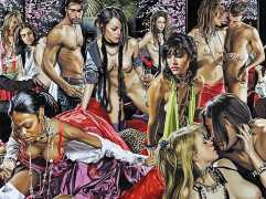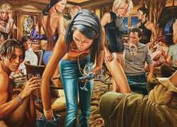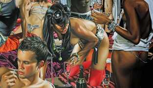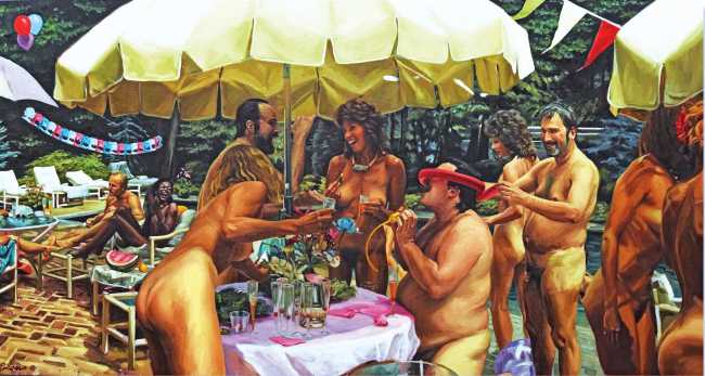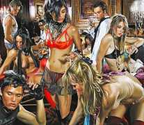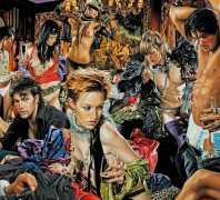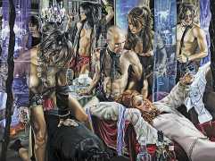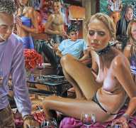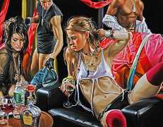 The series has appeared under various exhibition titles, including The Apotheosis of Desire, Solo Spaces, and Vectors of Desire. The individual paintings have similar tantalising titles, such as ‘The Artificial Boundaries of Illusion’ and ‘The Delicate Process of Limiting Access’, though it is in truth the stories we read into the complex canvases that give them their meaning and personal significance. The origins of the theme can be found in the early 1990s in paintings like ‘Trophy Wives’ and ‘Beach Venus’, where the naked characters are at least engaging with each other in recognisable, if unnaturally sociable, ways. It took another decade for Rodgers to find his trademark theme of naked vulnerability in luxuriously-staged, alcohol-fuelled settings.