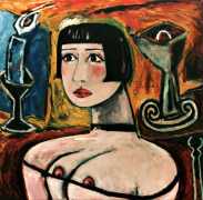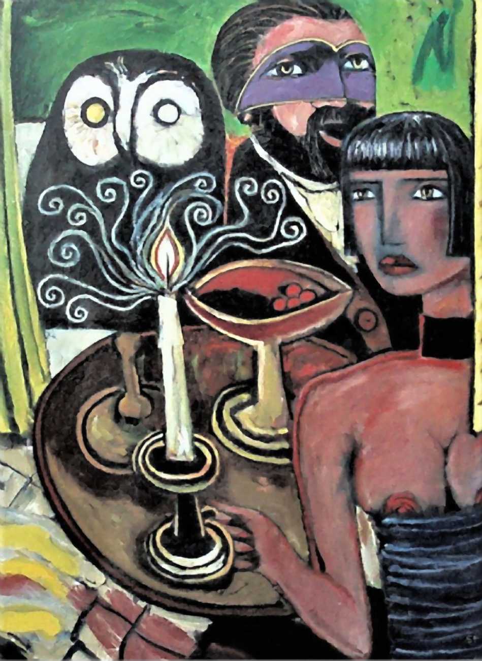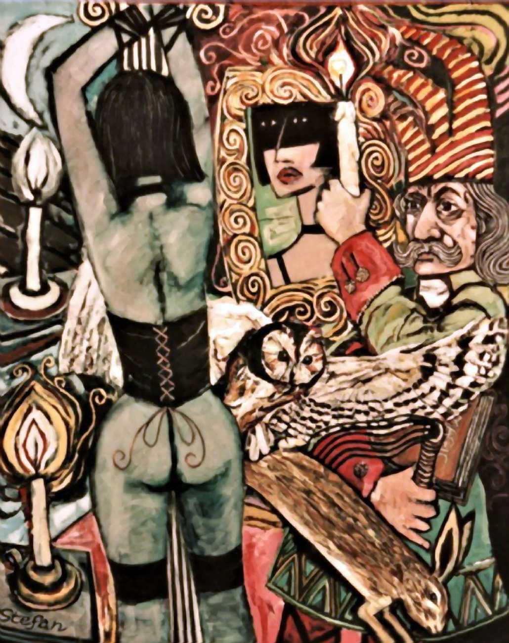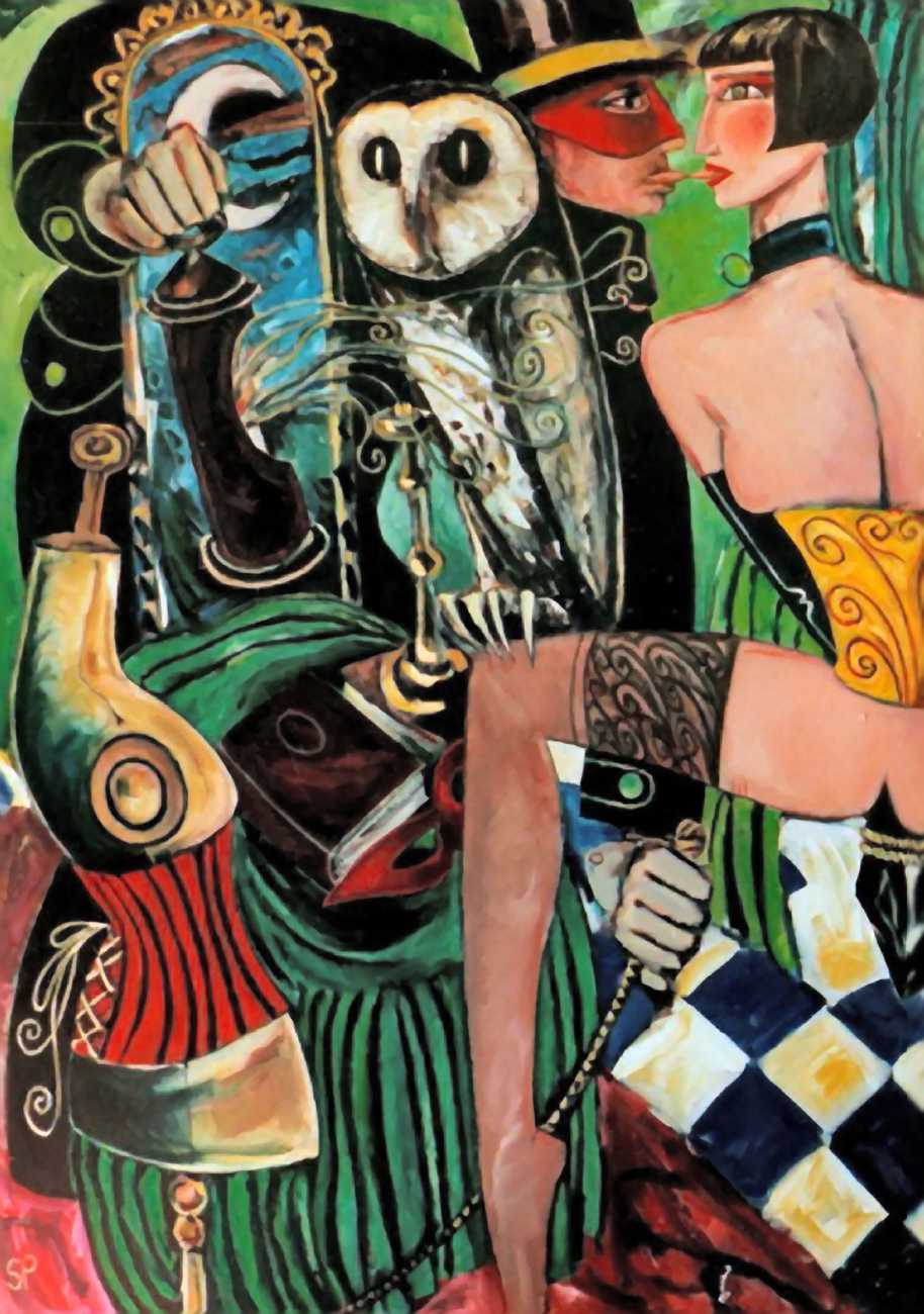 Borrowing elements from the book, Stefan Prince creates a visual narrative richly coloured and full of theatrical motifs including burning candles, keys, masks, draught-blown curtains, and an ever-present owl. In darkened rooms and cloistered gardens, he catches his protagonists in freeze-frame, most often as its focal point a semi-clad young woman with a sharp black bob of hair reminiscent of silent movie star Louise Brooks. Though intentionally erotic, very little is explicit, and the viewer is invited to conjure their own interpretation of events, many of which are lifted directly from the novel.