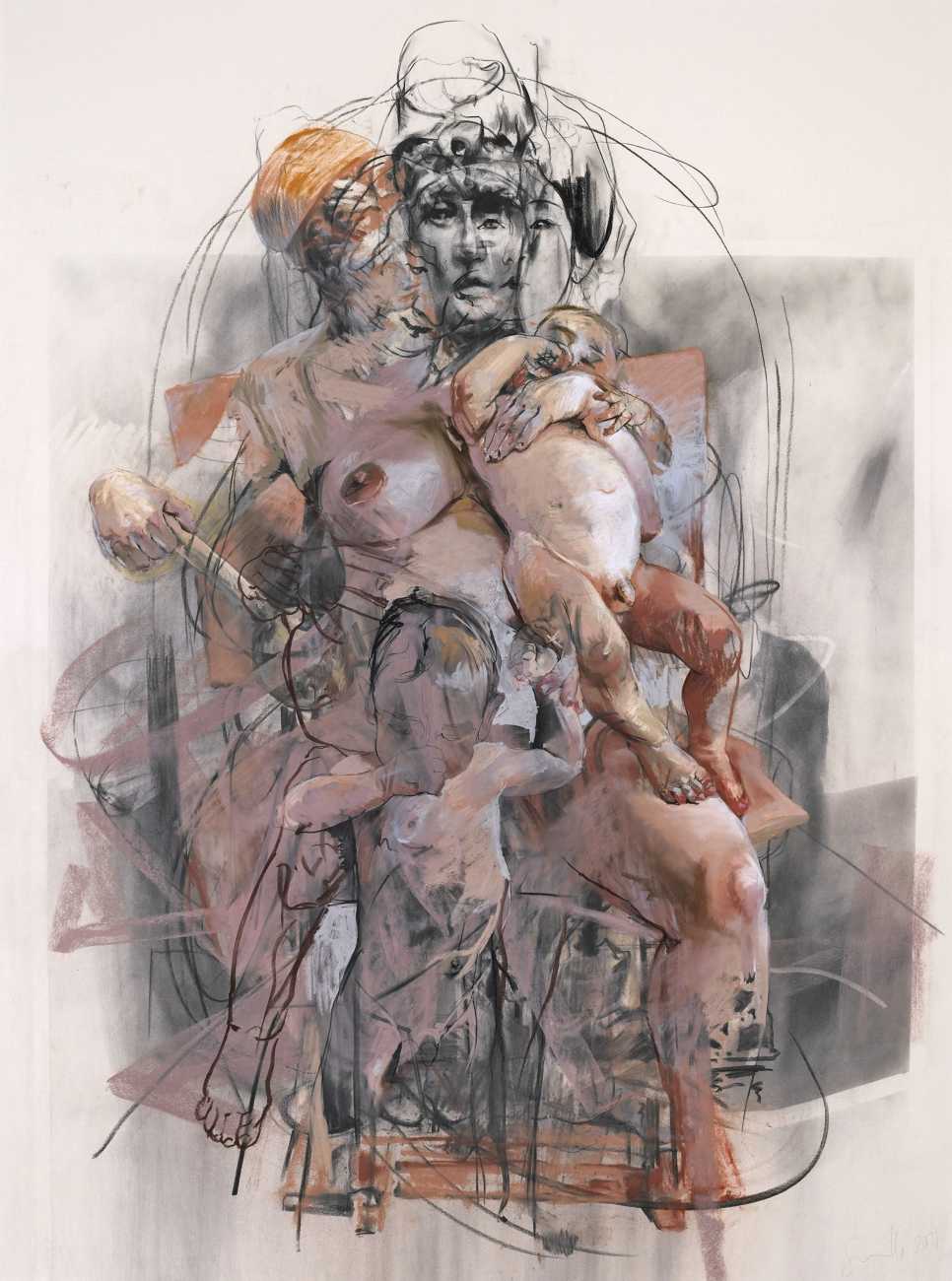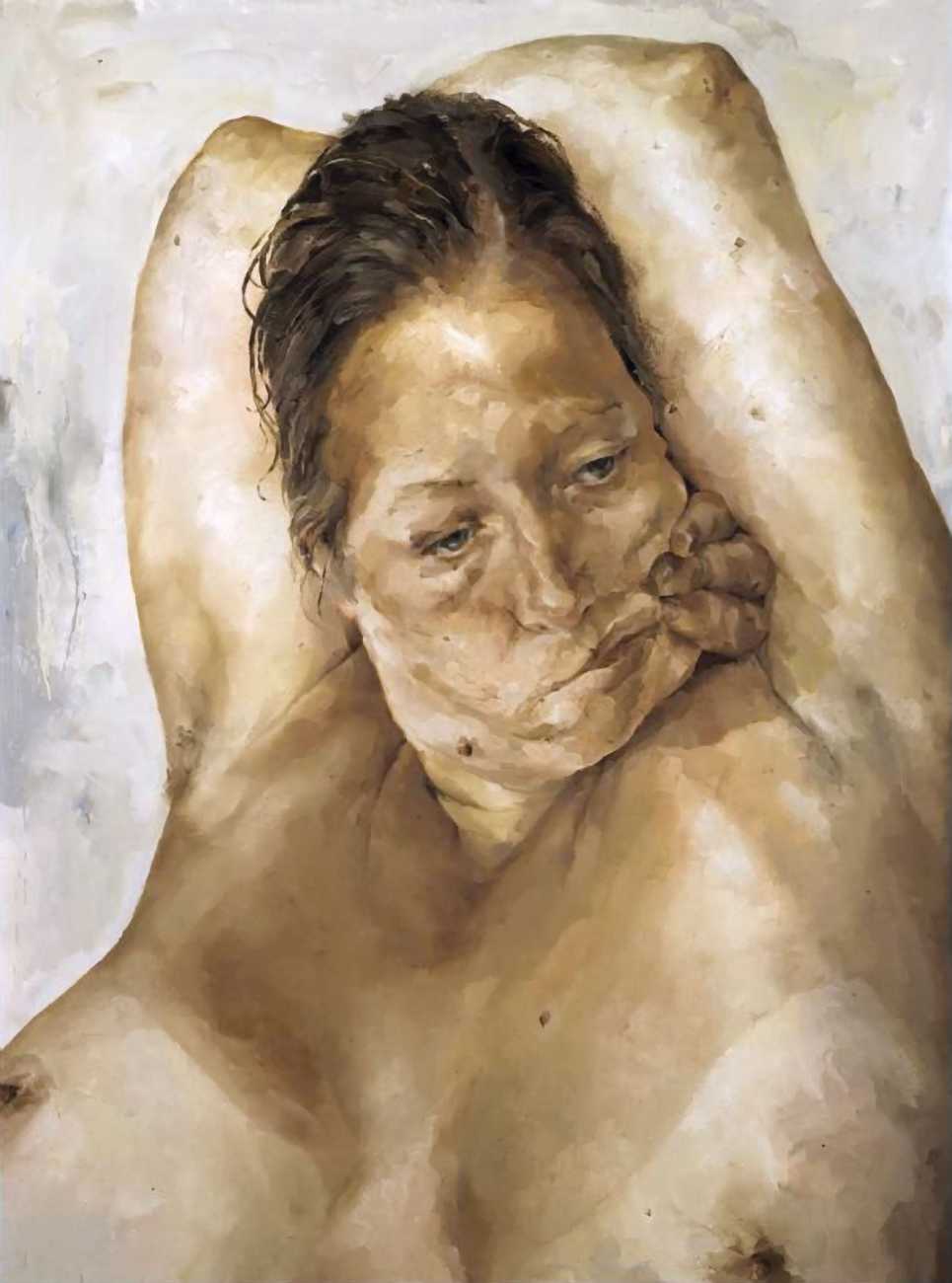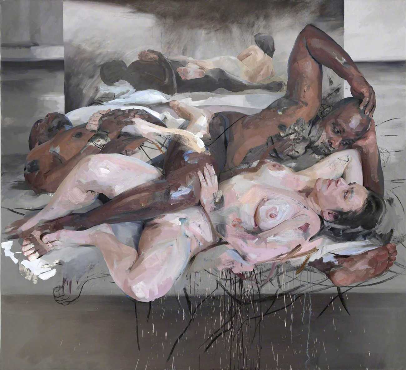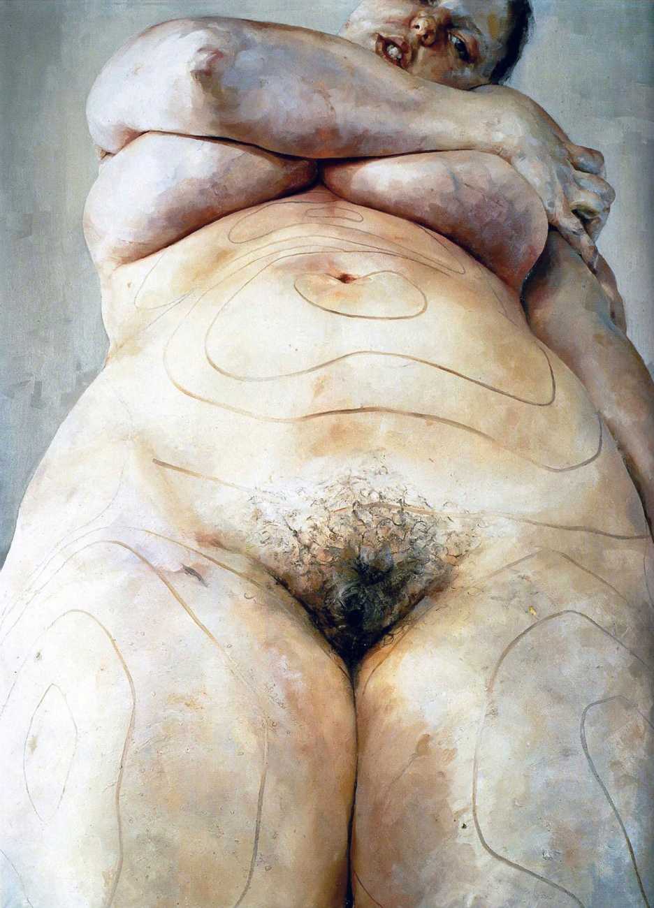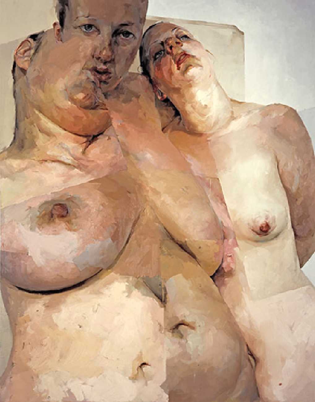 In her paintings Jenny Saville borrows conventions from a long tradition of figure painting, whether in poses borrowed from the madonna and child paintings by Leonardo da Vinci, the use of a colour palette reminiscent of Peter Paul Rubens, or the gestural painting of Willem de Kooning in his ‘Woman’ series. Saville appropriates these techniques associated with male masters to balance them her own point of view as a woman. Her focus has always been the female body, though as she says ‘I’m drawn to bodies that emanate a sort of state of in-betweenness – hermaphrodite, transvestite, half-alive/half-dead’. Saville’s painterly style has been often been compared with that of Lucian Freud, famous for his conventionally unflattering depictions of naked models.
