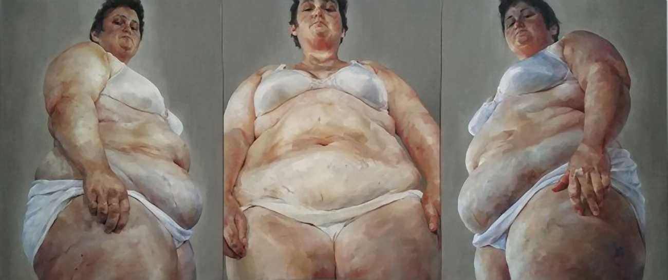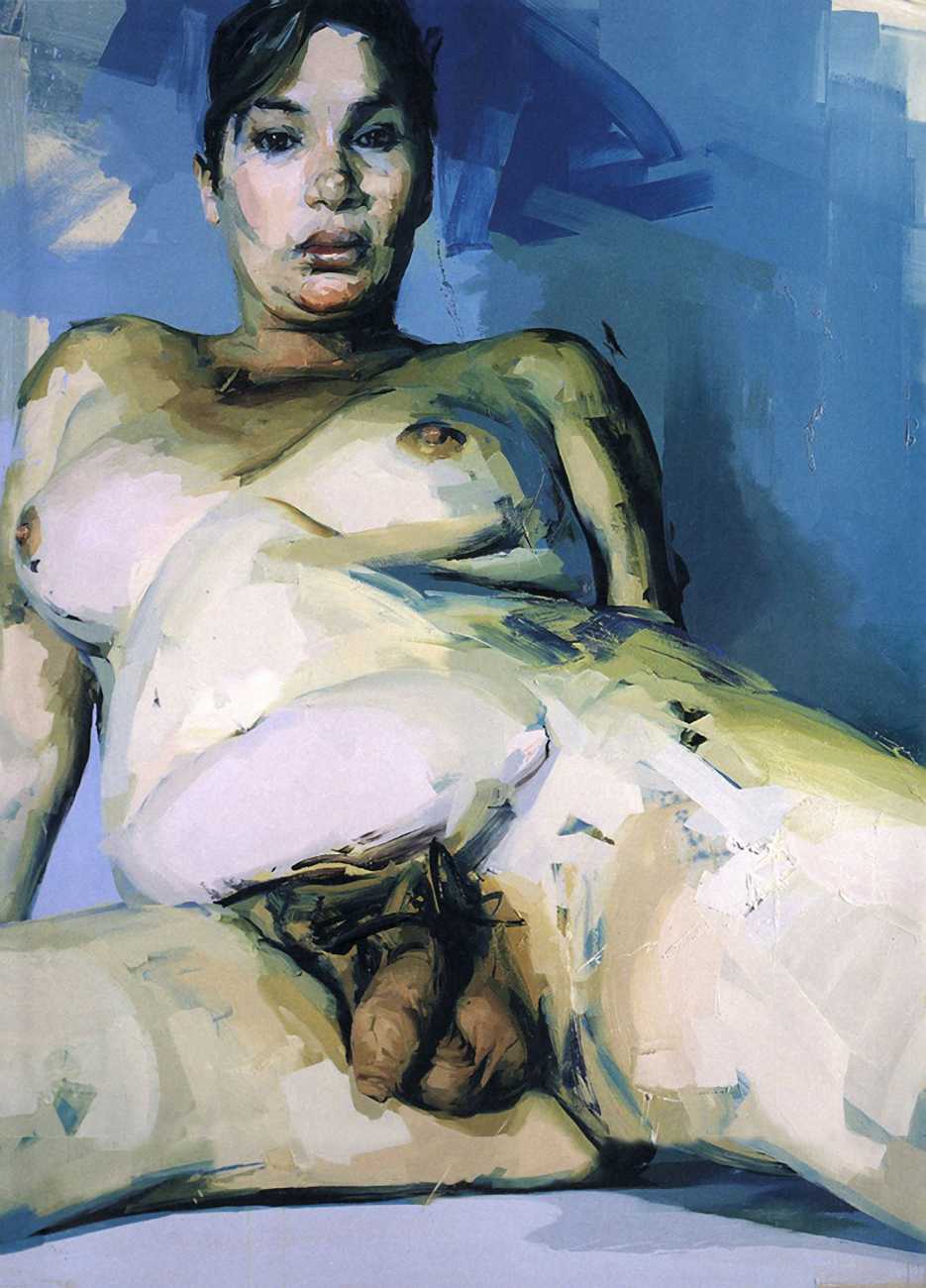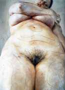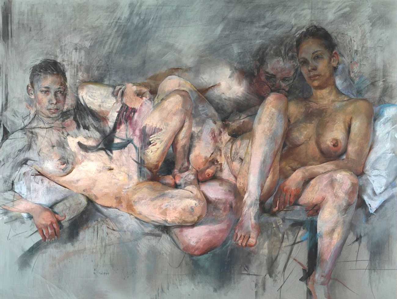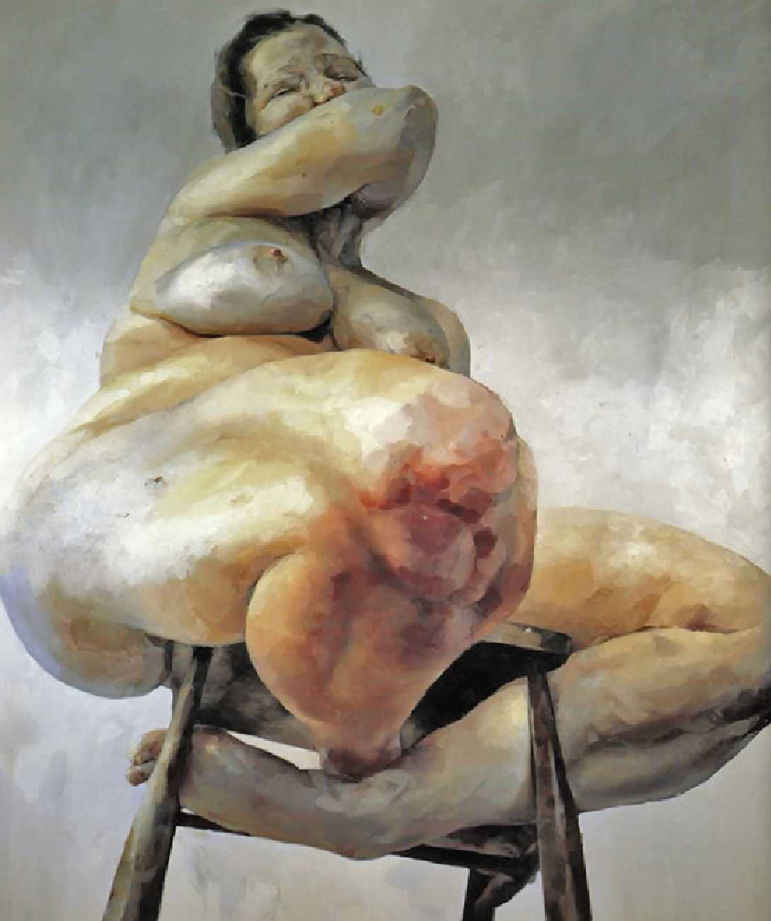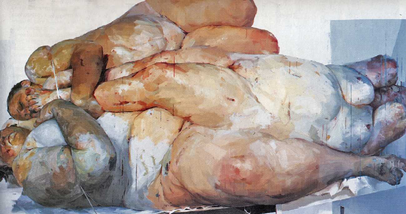 In her paintings Jenny Saville borrows conventions from a long tradition of figure painting, whether in poses borrowed from the madonna and child paintings by Leonardo da Vinci, the use of a colour palette reminiscent of Peter Paul Rubens, or the gestural painting of Willem de Kooning in his ‘Woman’ series. Saville appropriates these techniques associated with male masters to balance them her own point of view as a woman. Her focus has always been the female body, though as she says ‘I’m drawn to bodies that emanate a sort of state of in-betweenness – hermaphrodite, transvestite, half-alive/half-dead’. Saville’s painterly style has been often been compared with that of Lucian Freud, famous for his conventionally unflattering depictions of naked models.