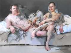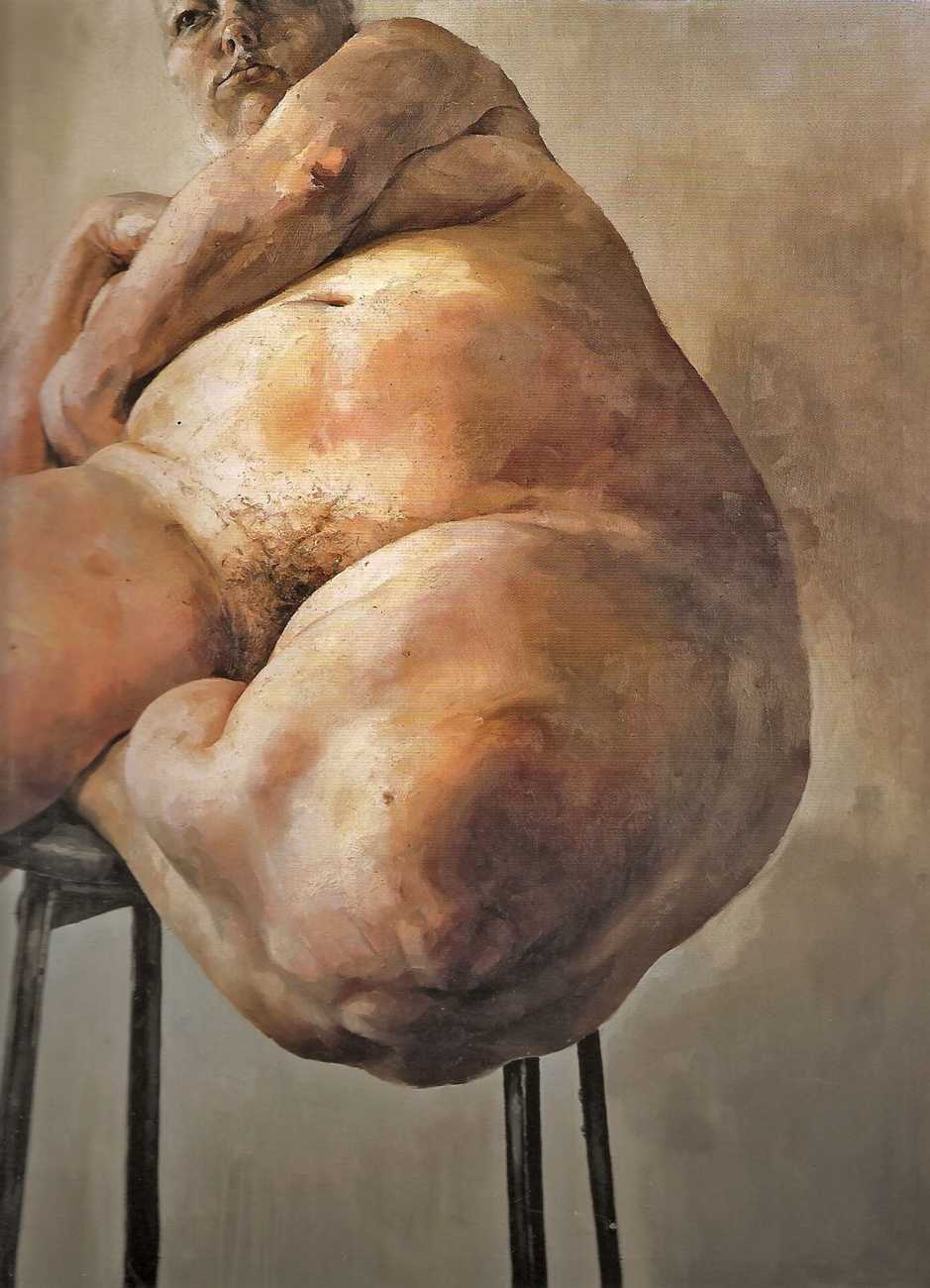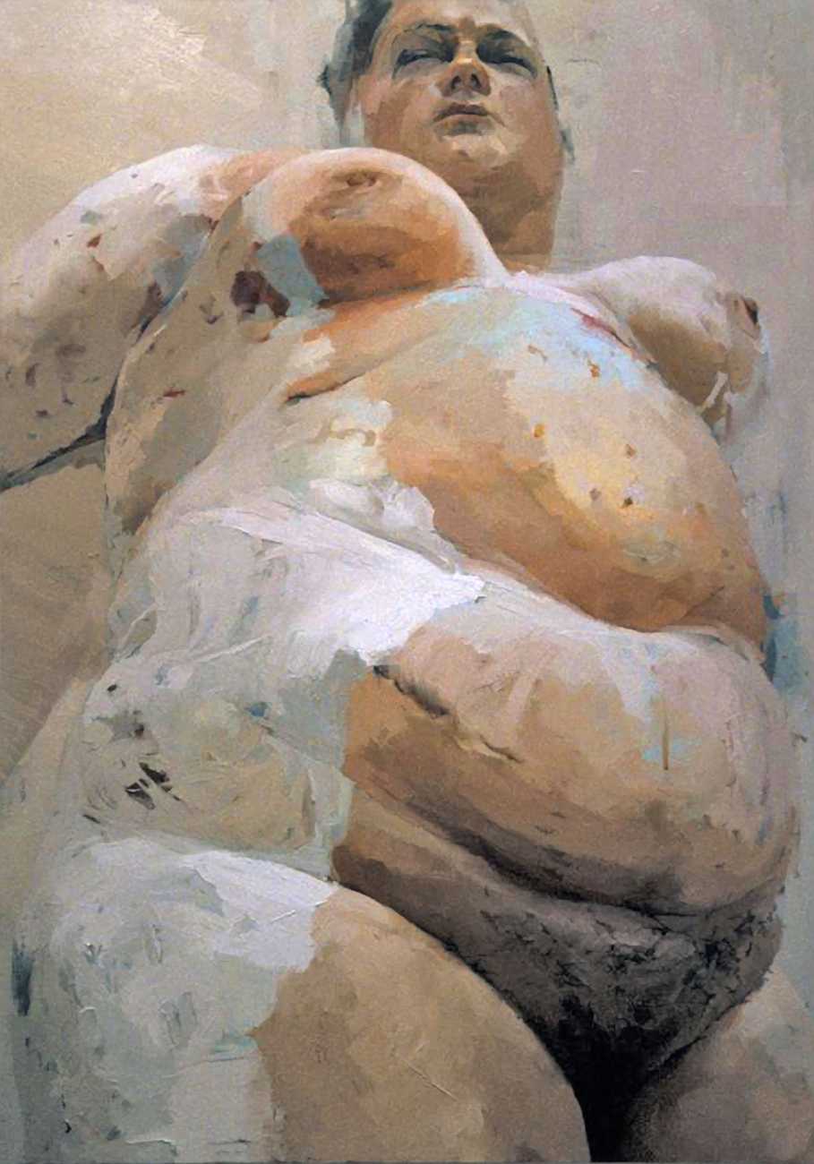 In an interview for the Saatchi Gallery, Saville explained ‘I have to really work at the tension between getting the paint to have the sensory quality that I want, and to be constructive in terms of building the form of a stomach, for example, or creating the inner crevice of a thigh. The more I do it, the more the space between abstraction and figuration becomes interesting. I want a painting realism. I try to consider the pace of a painting, of active and quiet areas. Listening to music helps a lot, especially music where there’s a hard sound and then soft breathable passages.’