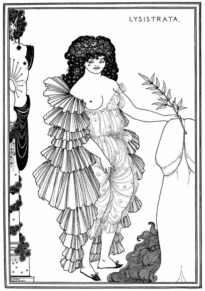 It was Beardsley’s publisher Leonard Smithers who suggested that he might illustrate the play, and the subject matter proved perfect for the artist’s inventiveness; the eight drawings were published by Smithers in a tiny edition of just one hundred copies. Though Beardsley wrote from his deathbed that he wanted all trace of the Lysistrata drawings destroyed, demonstrating the ambivalence he held for having been so daring, it is clear that they provided the perfect opportunity for him to engage all his creative and imaginative powers.