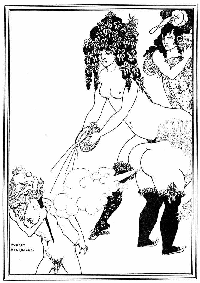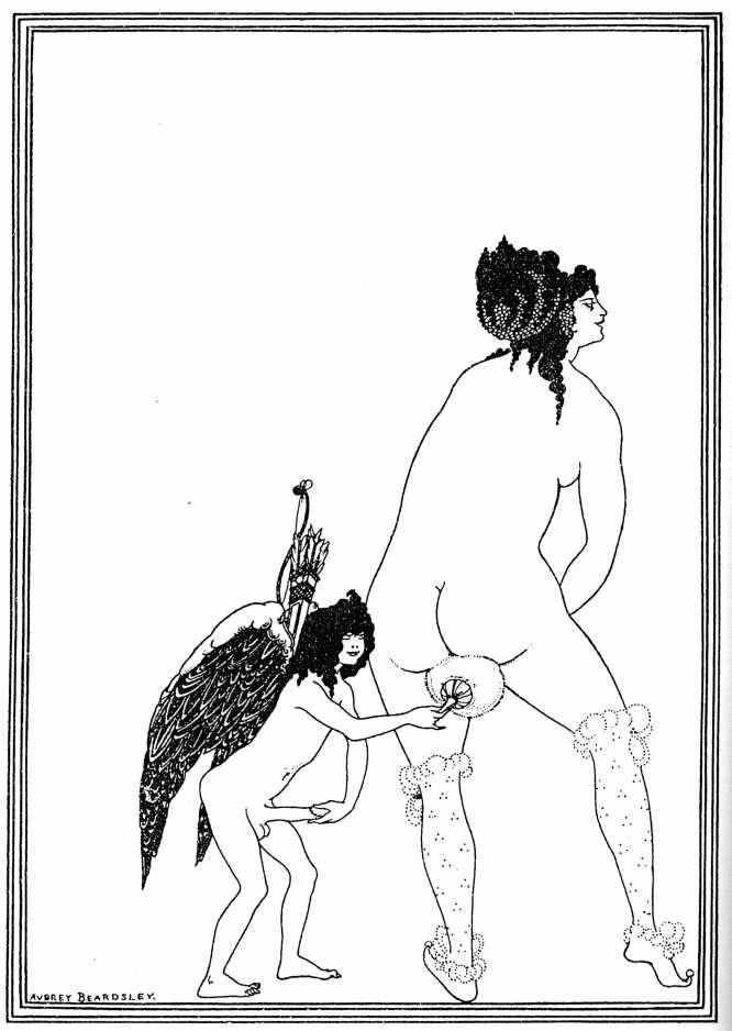In Brigid Brophy’s 1968 biography Black and White: A Portrait of Aubrey Beardsley, she explores Aubrey Beardsley’s fascination with sex, and probably comes as close to an accurate analysis as is possible. ‘His vision,’ she writes, ‘is permanently that of a child lying in bed watching his mother dress for a dinner-party. His fantasy hangs this here, tries the effect of that there: everything is a jewel, and everything is a sexual organ. He is allured, yet afraid to touch: driven back on a cold minuteness of detailed attention, and yet passionately curious, with the emotional and involved curiosity children give to sex. The very fastidiousness of his line demonstrates the importance of touching and the fear that has to be overcome in order to do it. The child’s protest against his inexperience, against the ban on touching, is to glory in his ignorance. He does not know which sexual organs are appropriate to which sex; he makes deliberate howlers in order to howl against his exclusion from adult knowledge.’