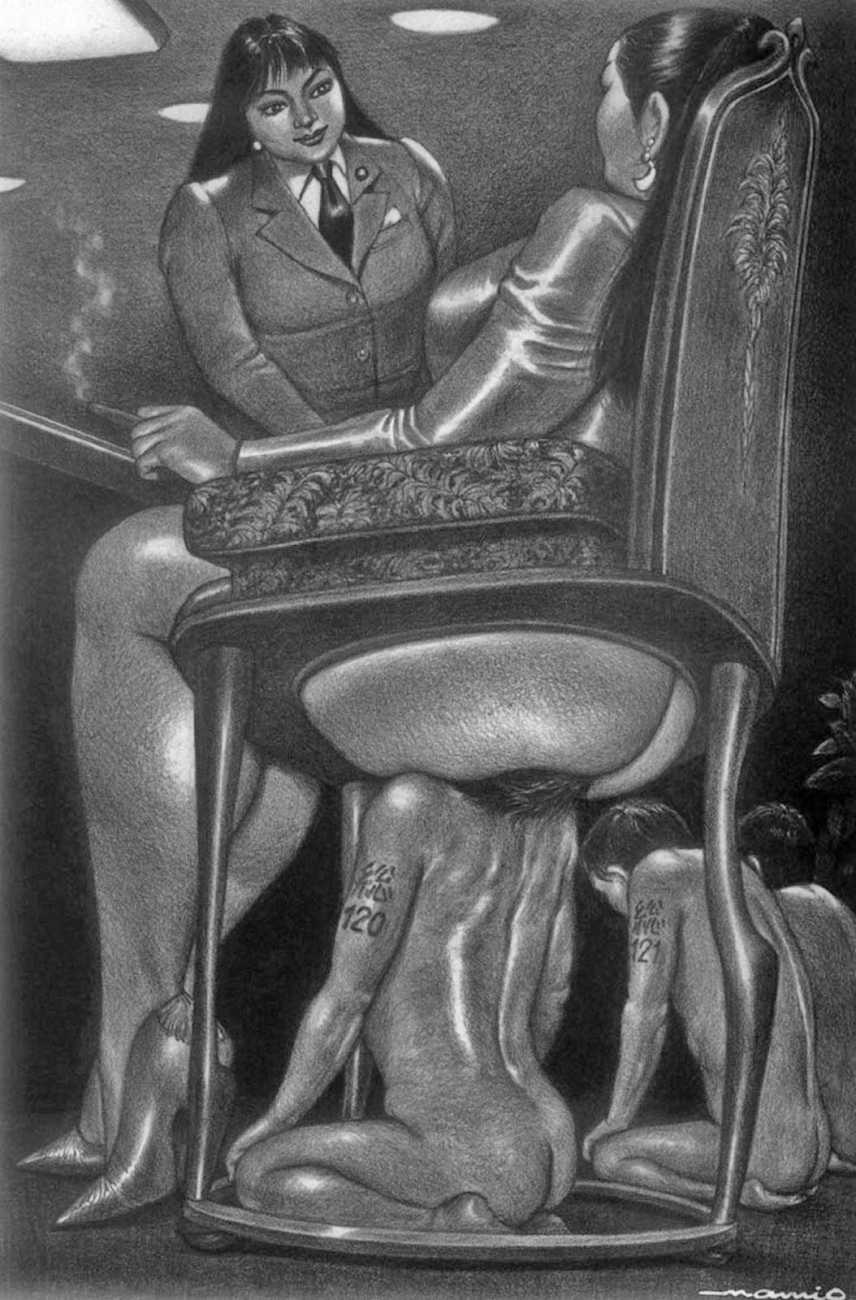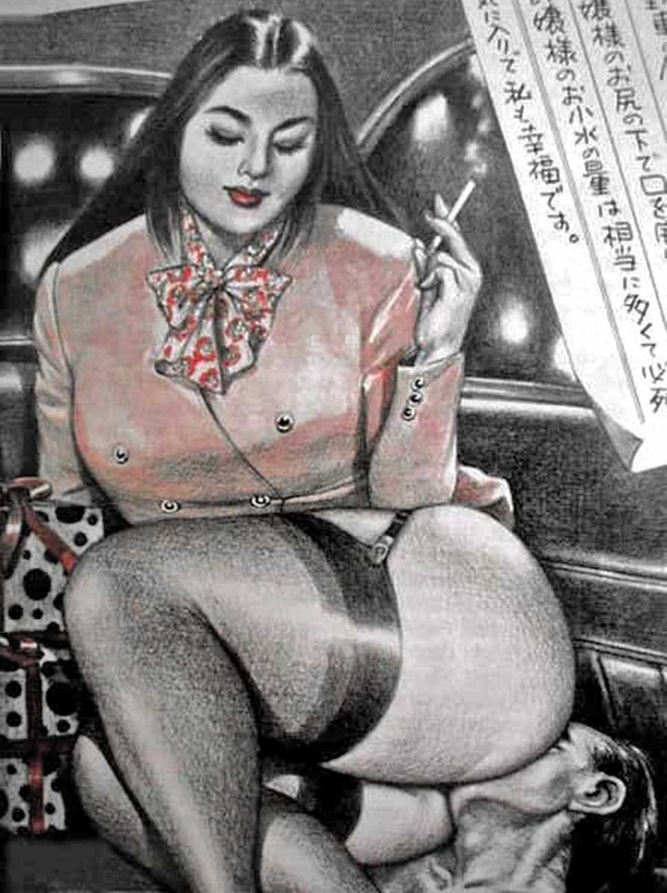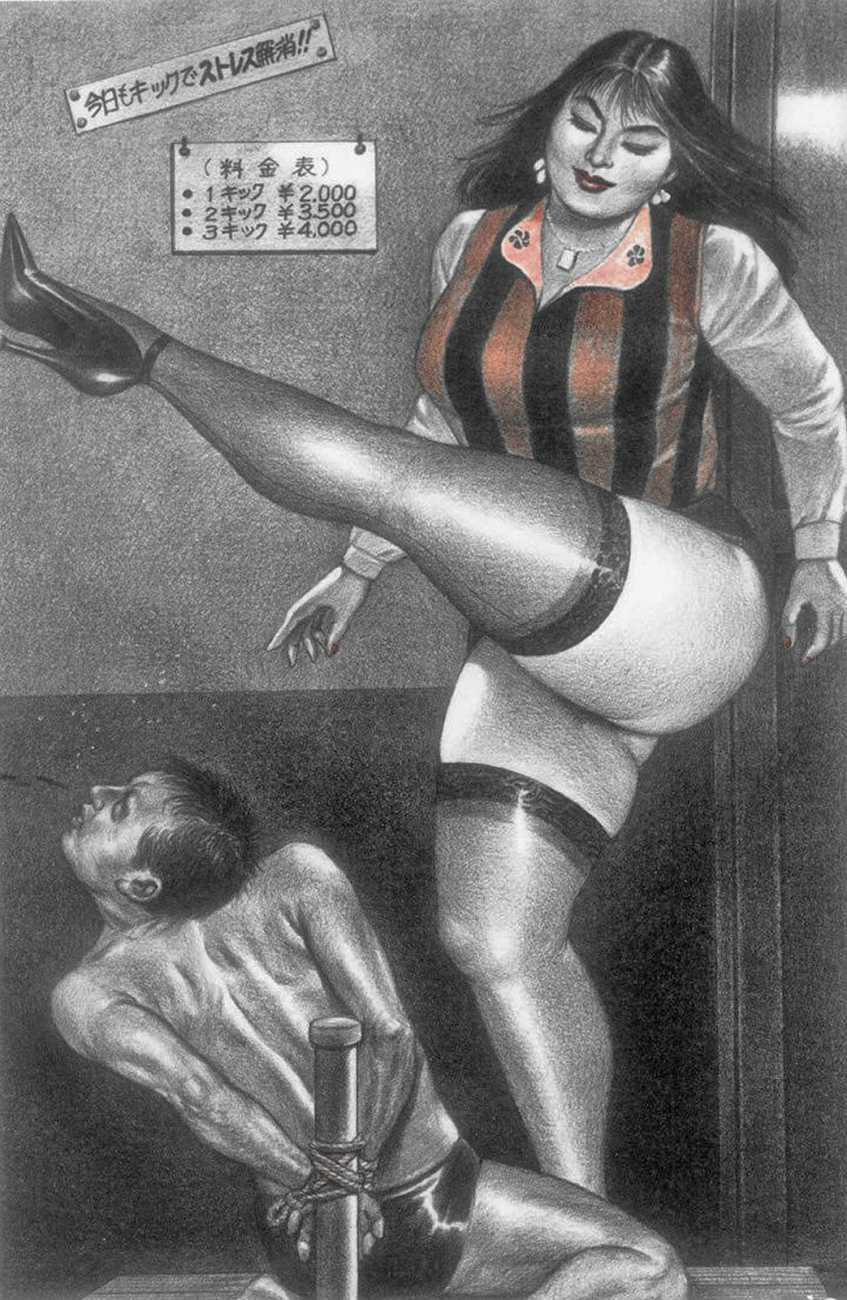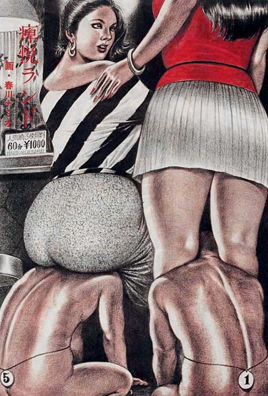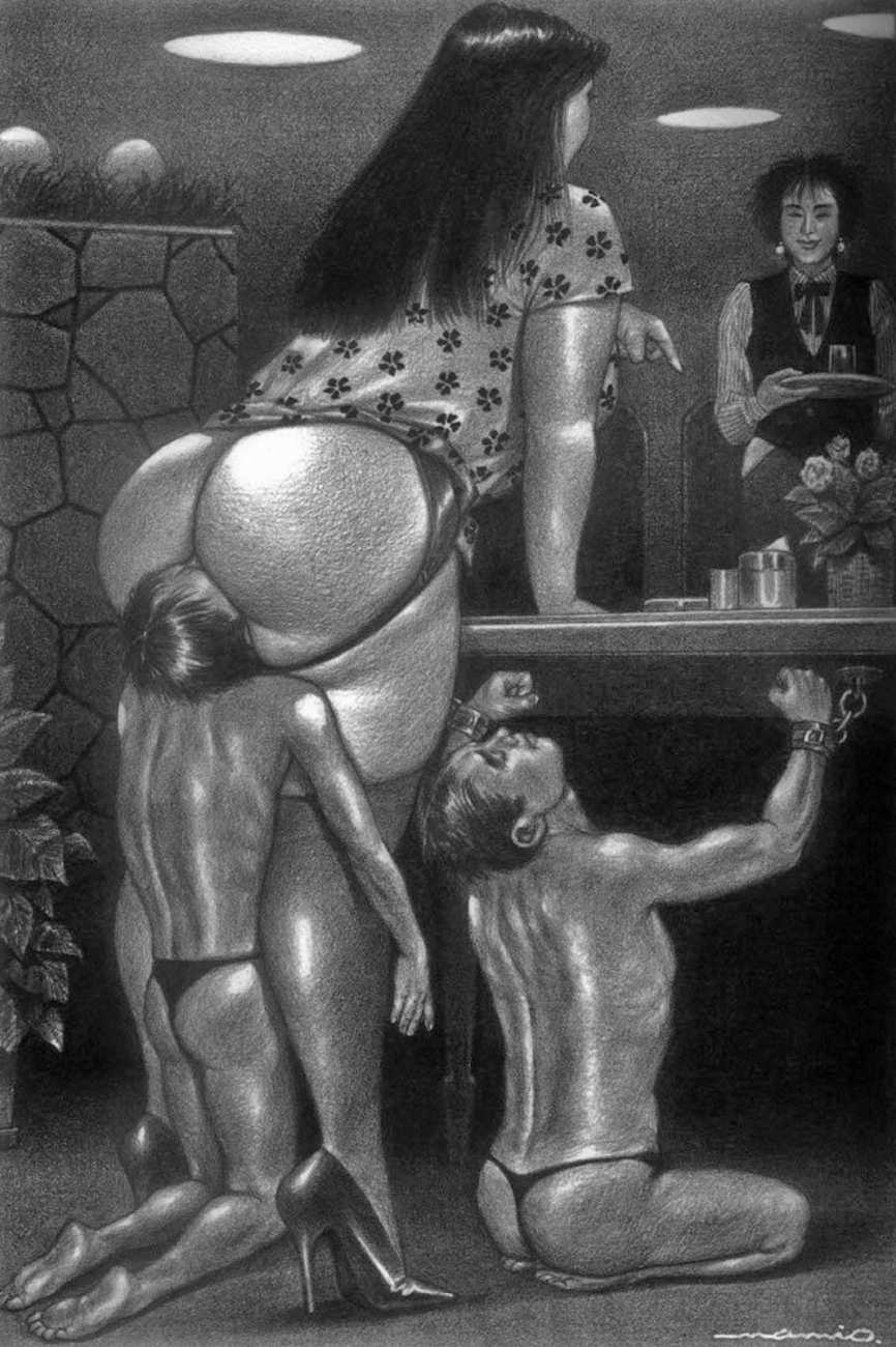 Garden of Domina: An Enterprise of Domination (Emonogatari Domina No Sono, 絵物語 ドミナノソノ) tells the story of Ohara Kana, a former volleyball player turned model. She capitalises on the filming of an advertisement for a cosmetics company to awaken the employees to the joys of domination. She becomes a director and opens a beauty salon, with services provided exclusively by masochistic men, creating a theme park run by slaves and a company that rents out slaves to select women clients. The drawings depict scenes of women sitting on top of submissive men, ignoring and crushing them while enjoying drinking a glass of wine with friends, smoking a cigarette, or reading.