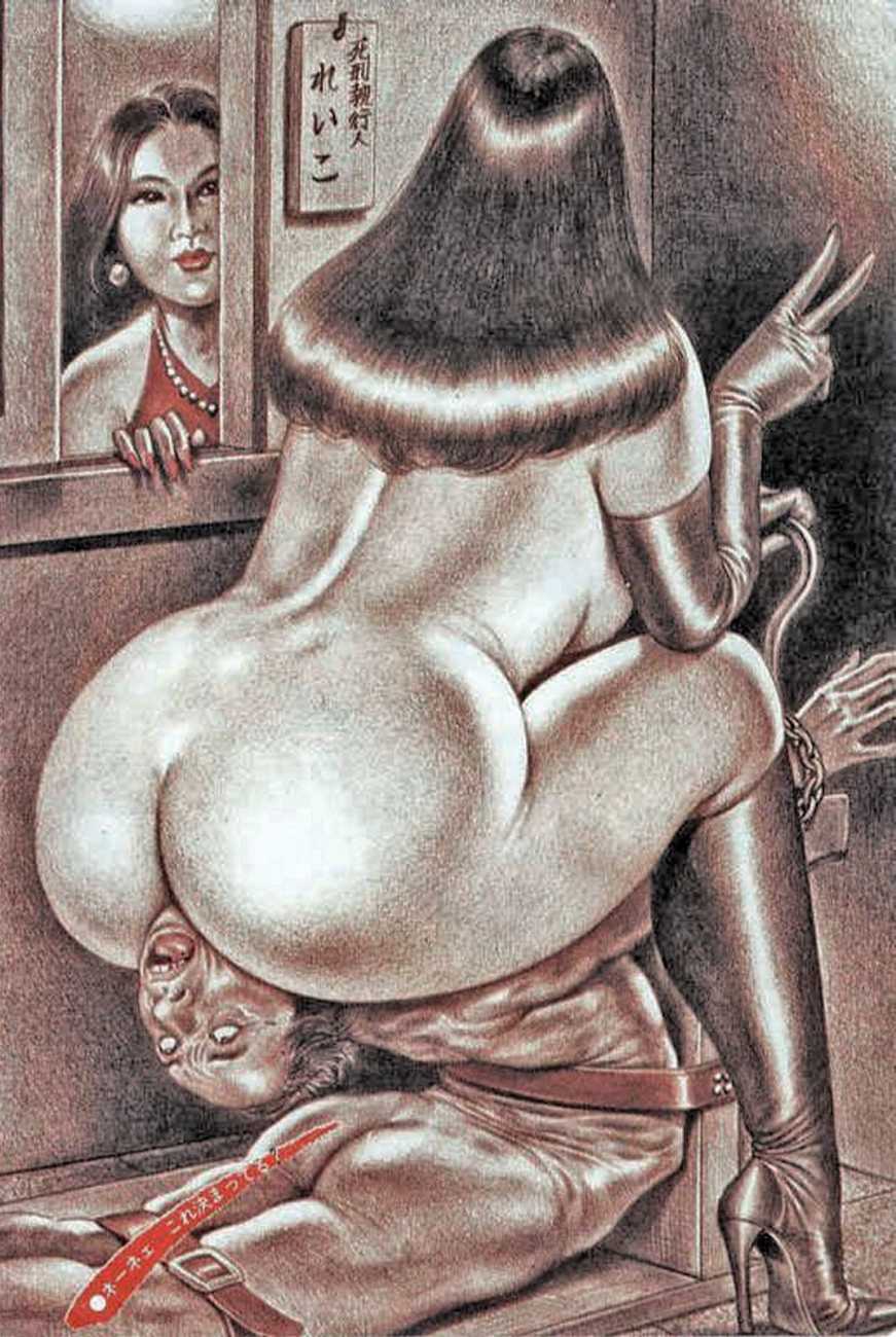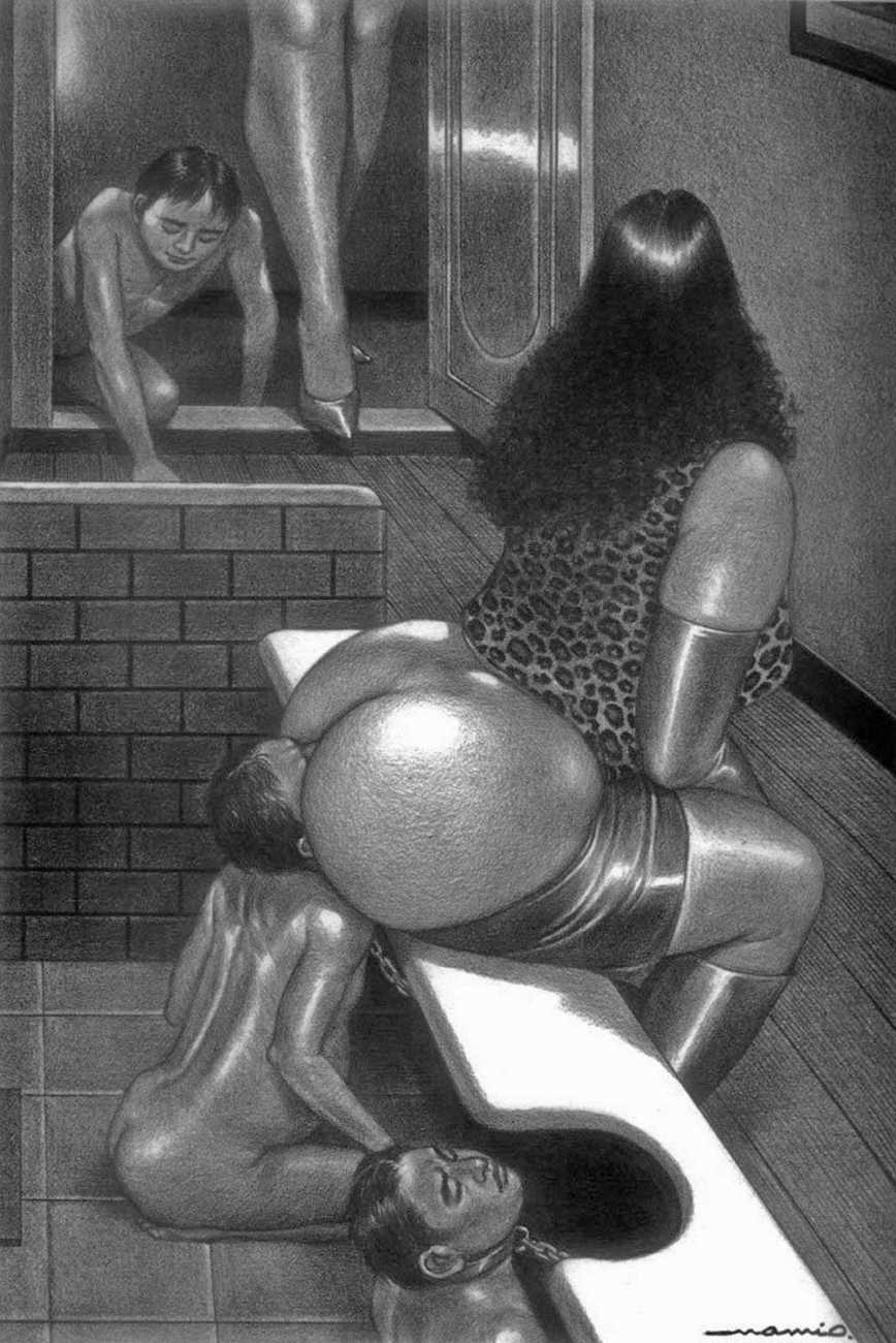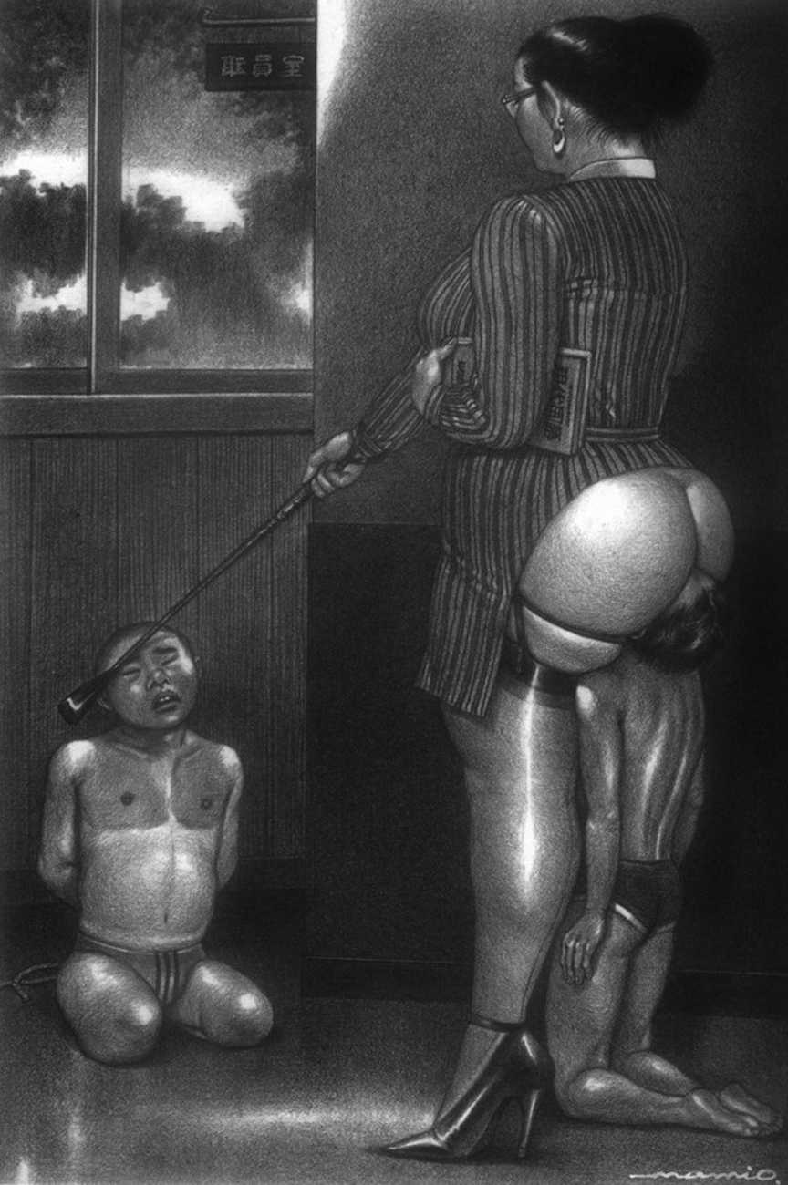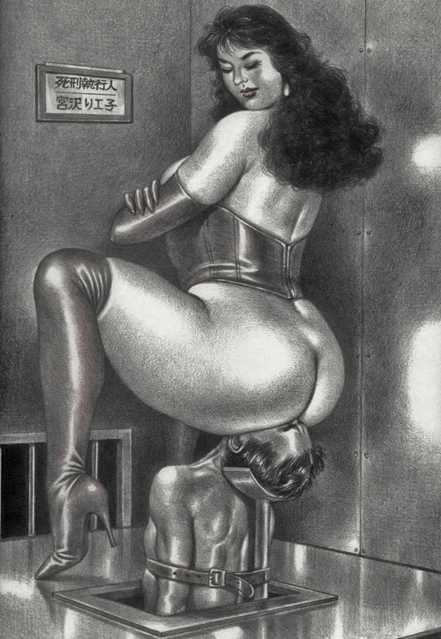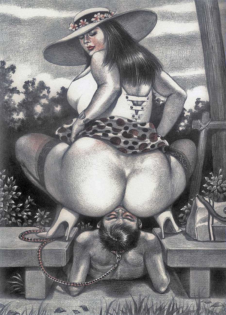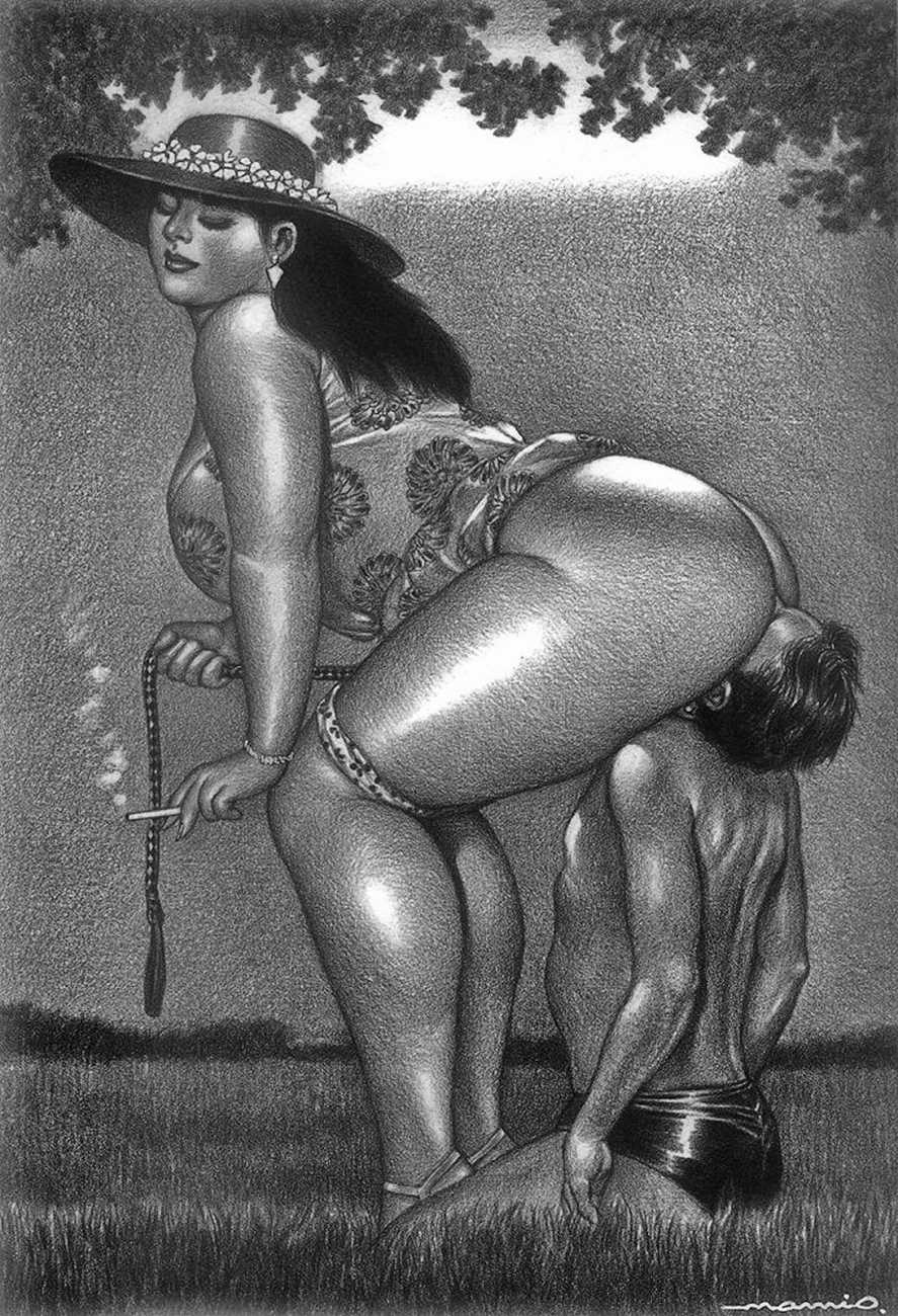 Garden of Domina: An Enterprise of Domination (Emonogatari Domina No Sono, 絵物語 ドミナノソノ) tells the story of Ohara Kana, a former volleyball player turned model. She capitalises on the filming of an advertisement for a cosmetics company to awaken the employees to the joys of domination. She becomes a director and opens a beauty salon, with services provided exclusively by masochistic men, creating a theme park run by slaves and a company that rents out slaves to select women clients. The drawings depict scenes of women sitting on top of submissive men, ignoring and crushing them while enjoying drinking a glass of wine with friends, smoking a cigarette, or reading.