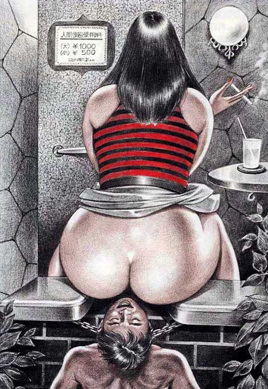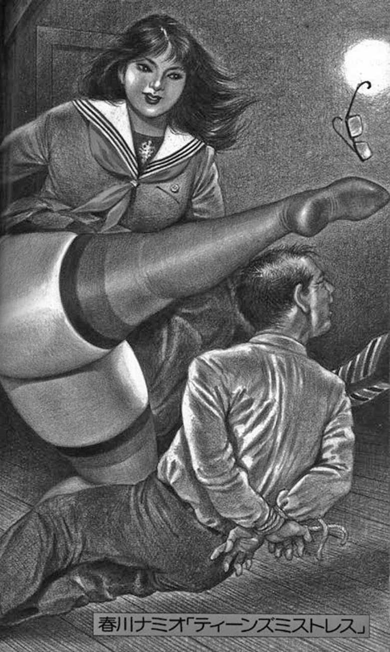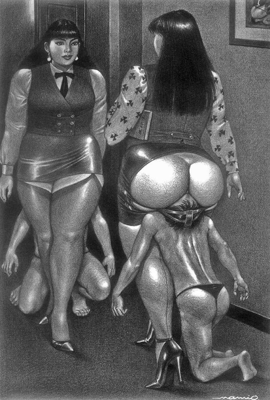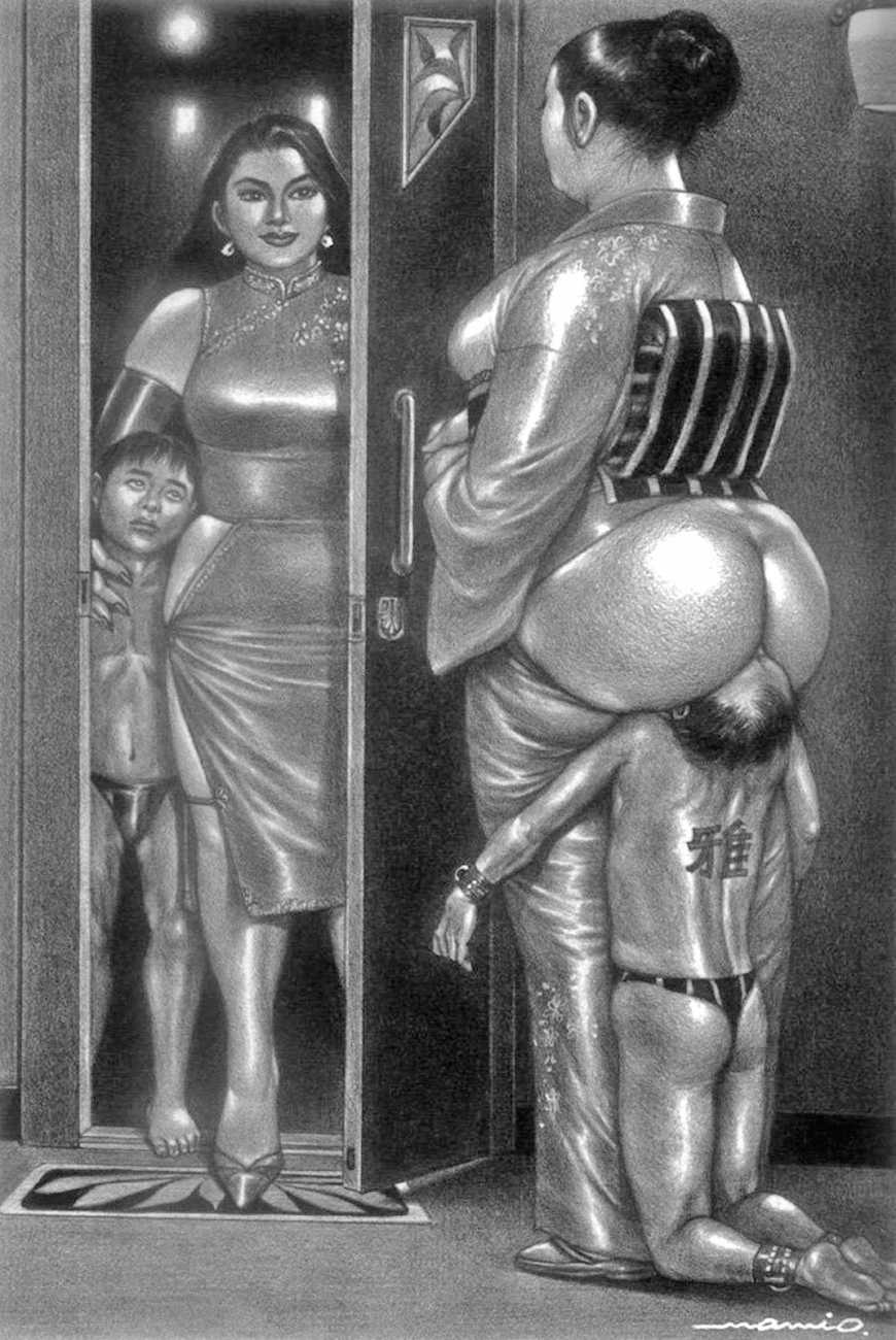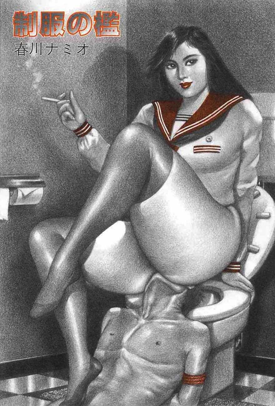 Garden of Domina: An Enterprise of Domination (Emonogatari Domina No Sono, 絵物語 ドミナノソノ) tells the story of Ohara Kana, a former volleyball player turned model. She capitalises on the filming of an advertisement for a cosmetics company to awaken the employees to the joys of domination. She becomes a director and opens a beauty salon, with services provided exclusively by masochistic men, creating a theme park run by slaves and a company that rents out slaves to select women clients. The drawings depict scenes of women sitting on top of submissive men, ignoring and crushing them while enjoying drinking a glass of wine with friends, smoking a cigarette, or reading.