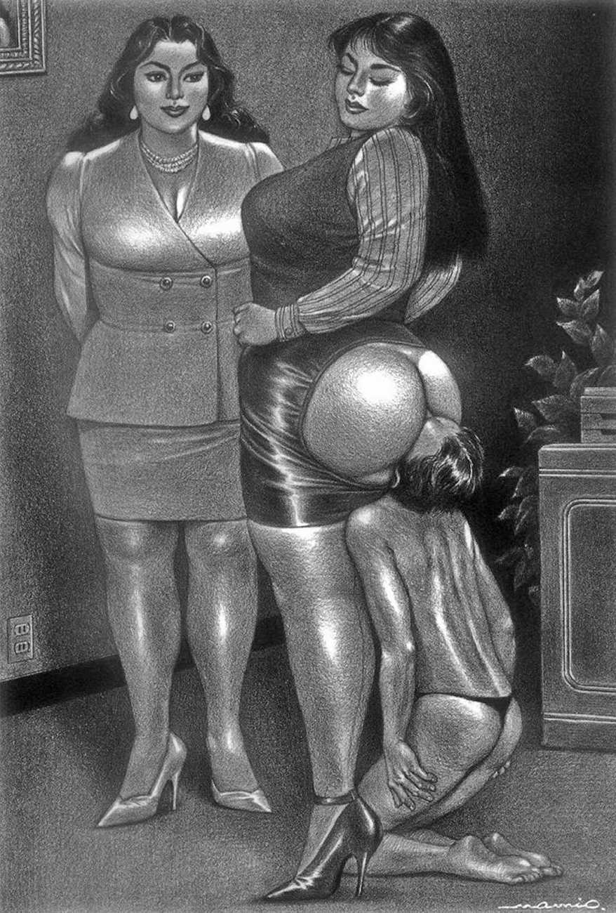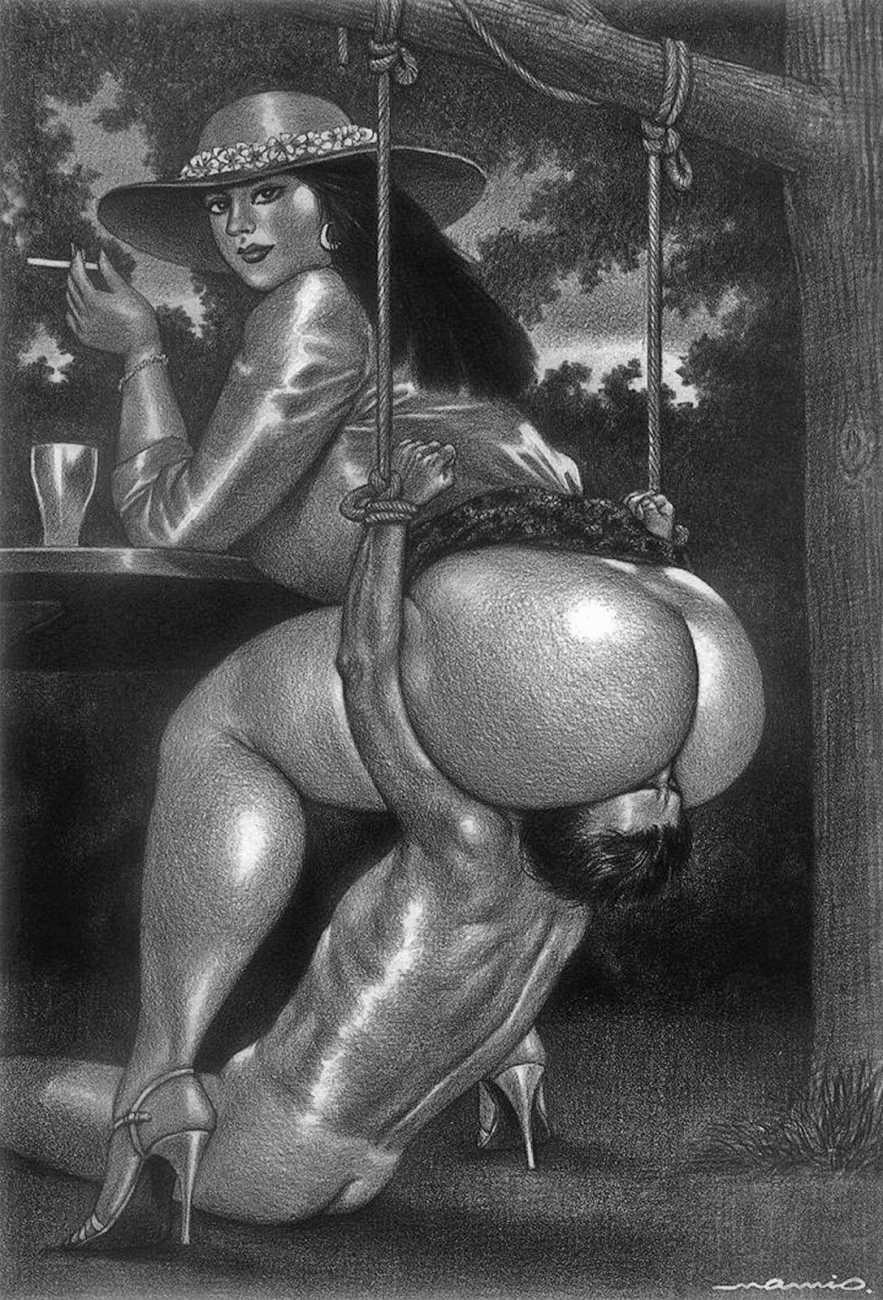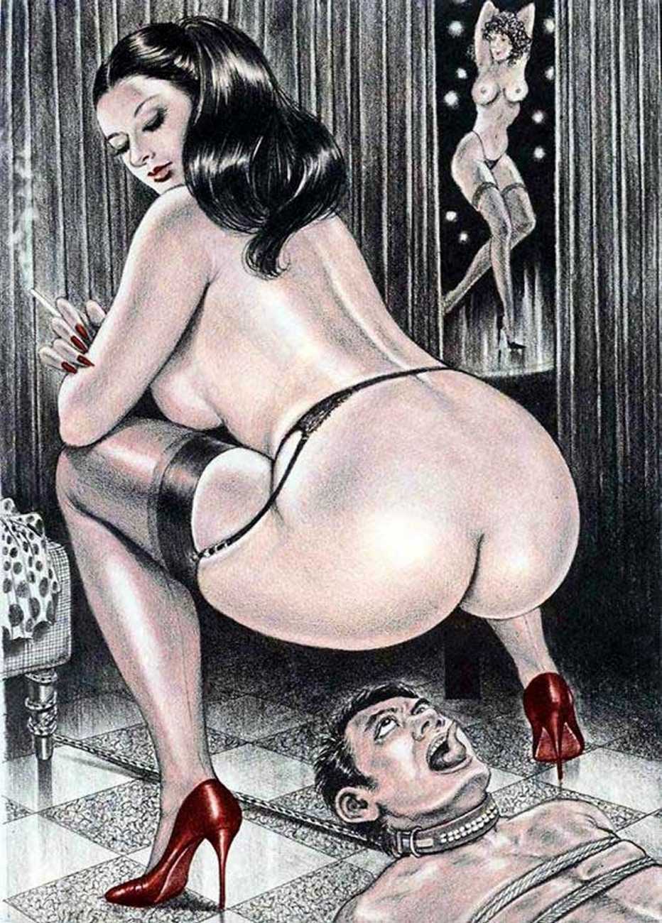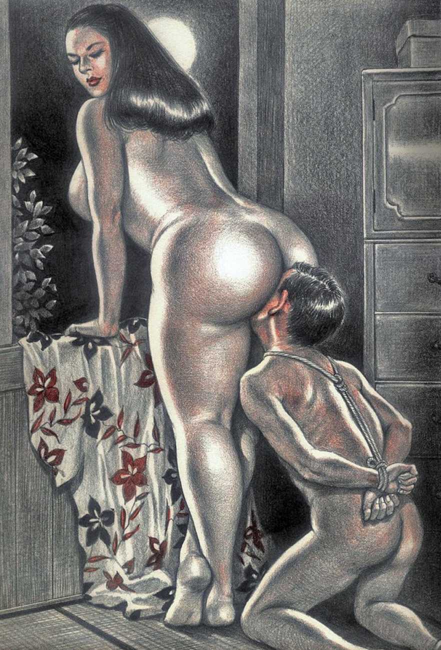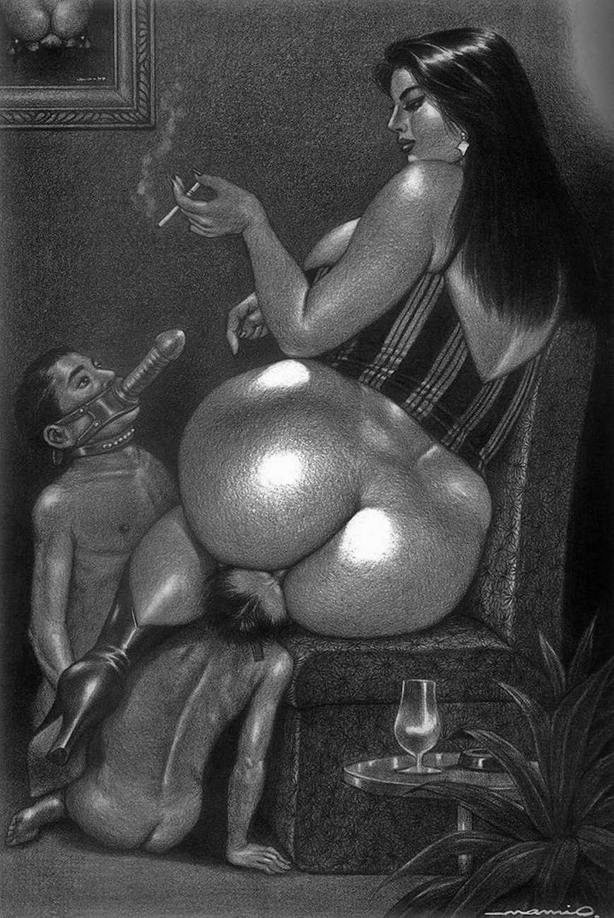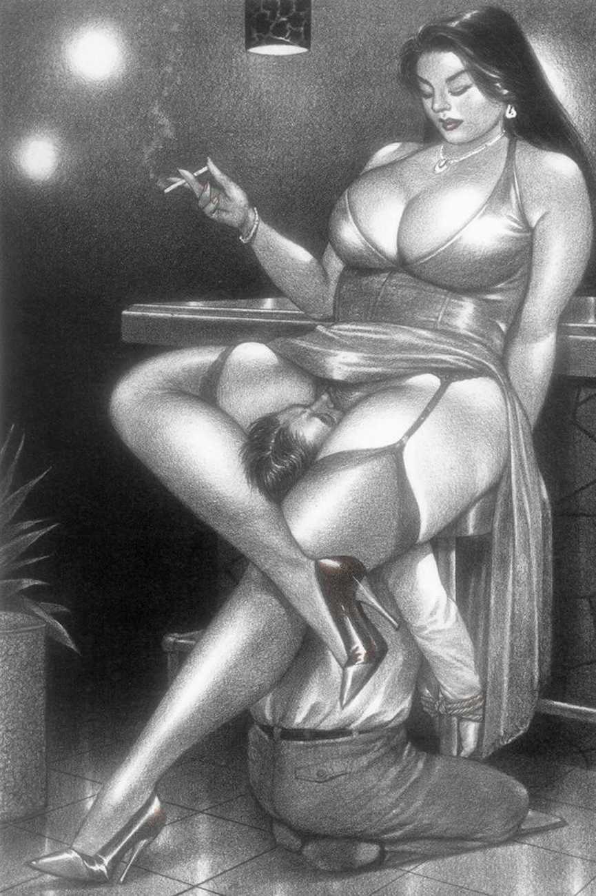 Garden of Domina: An Enterprise of Domination (Emonogatari Domina No Sono, 絵物語 ドミナノソノ) tells the story of Ohara Kana, a former volleyball player turned model. She capitalises on the filming of an advertisement for a cosmetics company to awaken the employees to the joys of domination. She becomes a director and opens a beauty salon, with services provided exclusively by masochistic men, creating a theme park run by slaves and a company that rents out slaves to select women clients. The drawings depict scenes of women sitting on top of submissive men, ignoring and crushing them while enjoying drinking a glass of wine with friends, smoking a cigarette, or reading.