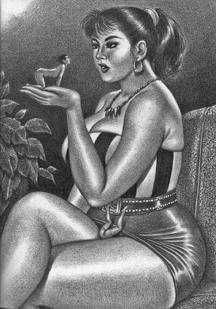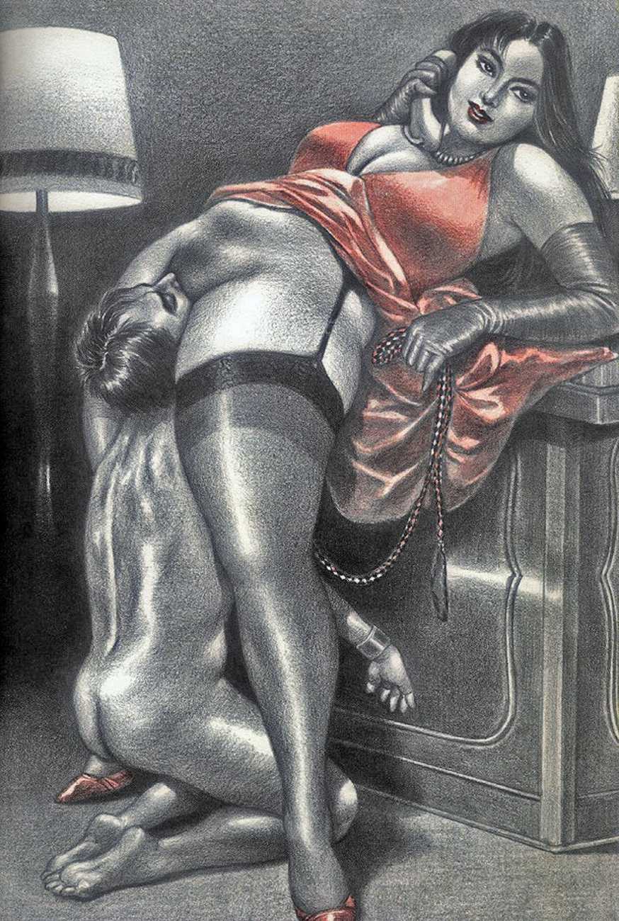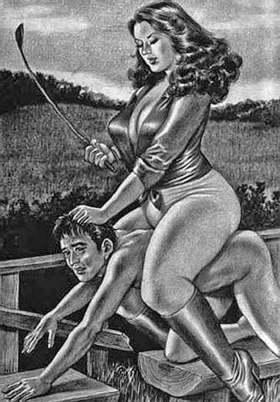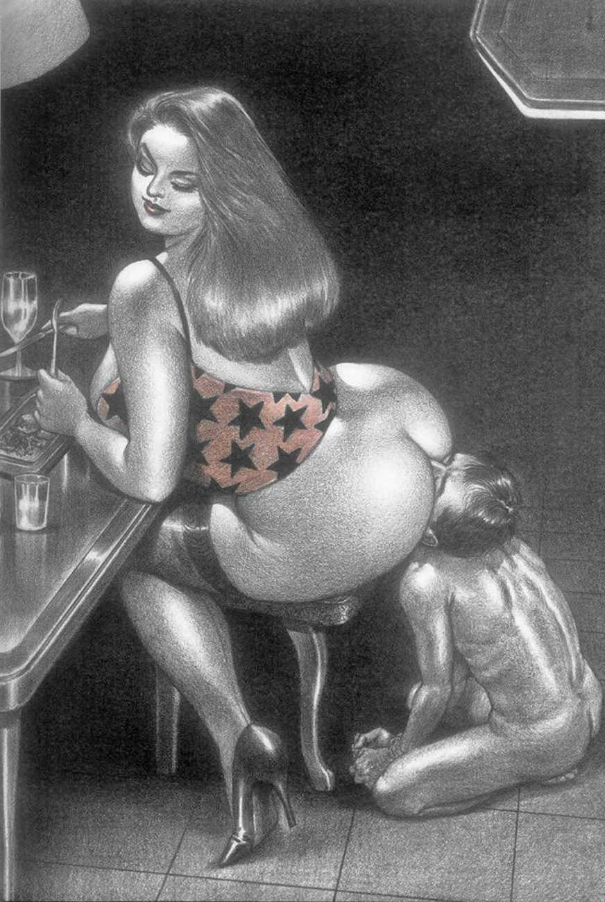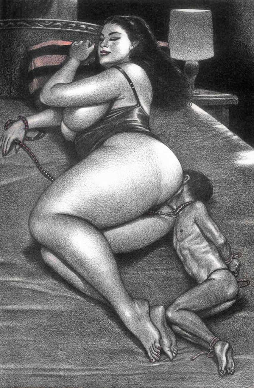 Garden of Domina: An Enterprise of Domination (Emonogatari Domina No Sono, 絵物語 ドミナノソノ) tells the story of Ohara Kana, a former volleyball player turned model. She capitalises on the filming of an advertisement for a cosmetics company to awaken the employees to the joys of domination. She becomes a director and opens a beauty salon, with services provided exclusively by masochistic men, creating a theme park run by slaves and a company that rents out slaves to select women clients. The drawings depict scenes of women sitting on top of submissive men, ignoring and crushing them while enjoying drinking a glass of wine with friends, smoking a cigarette, or reading.