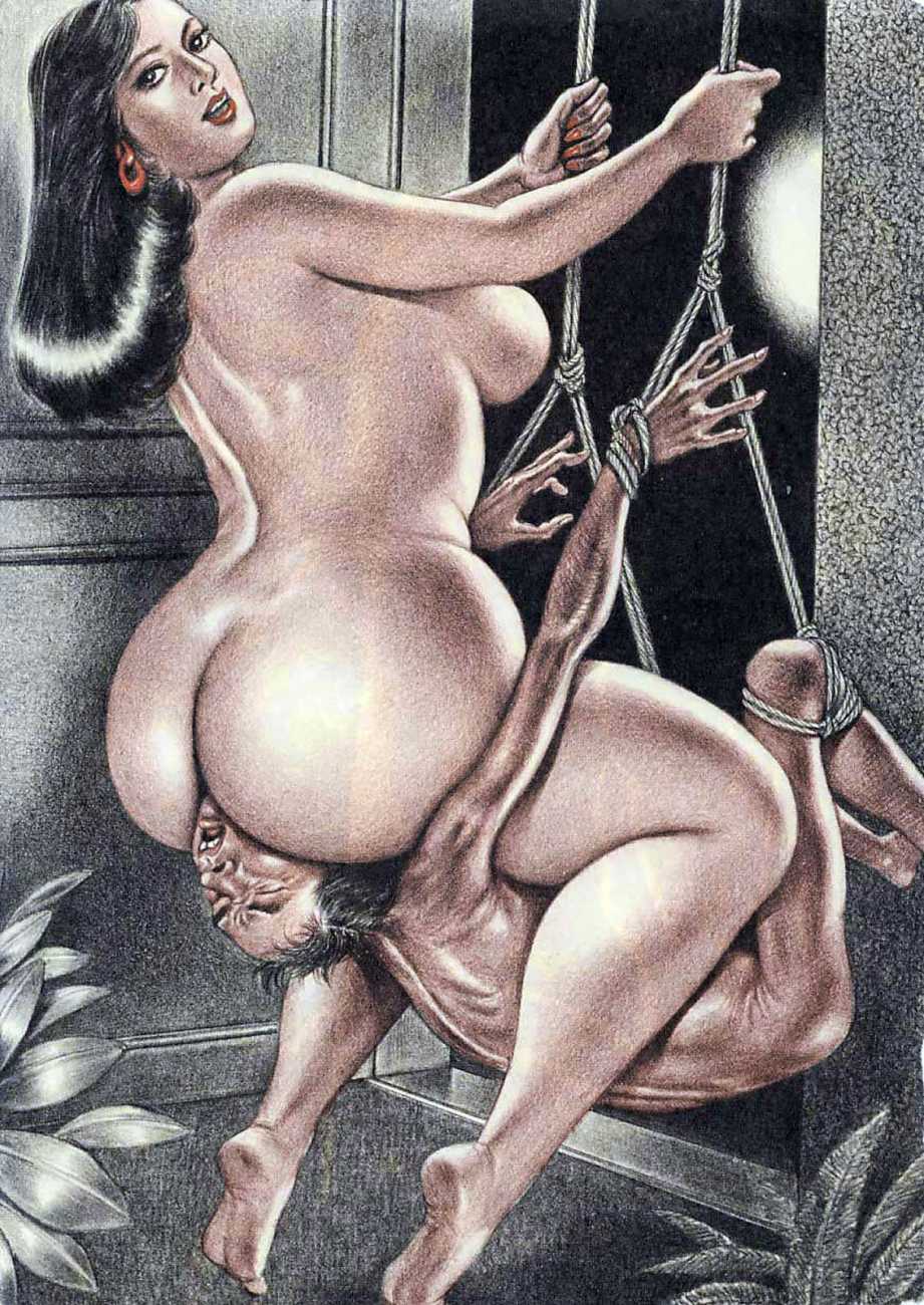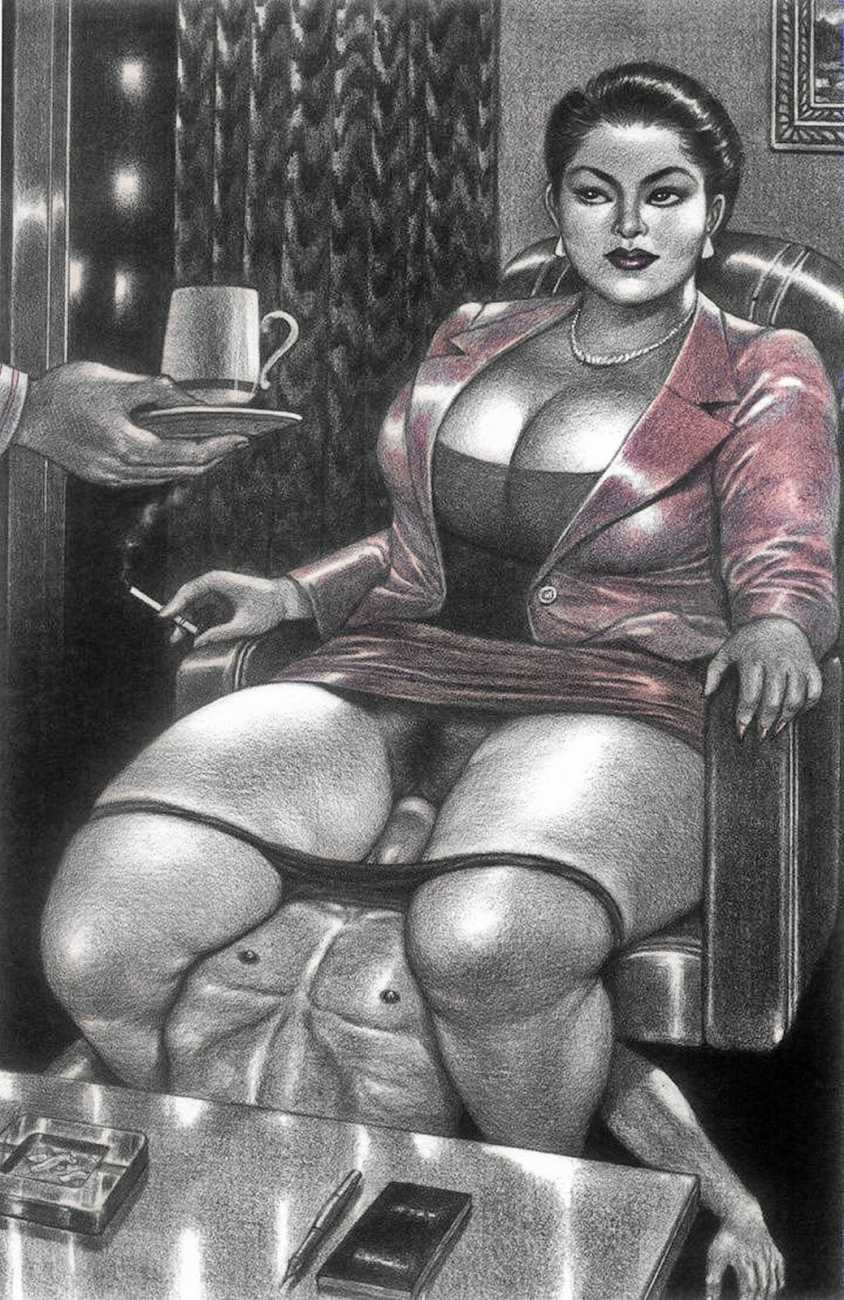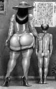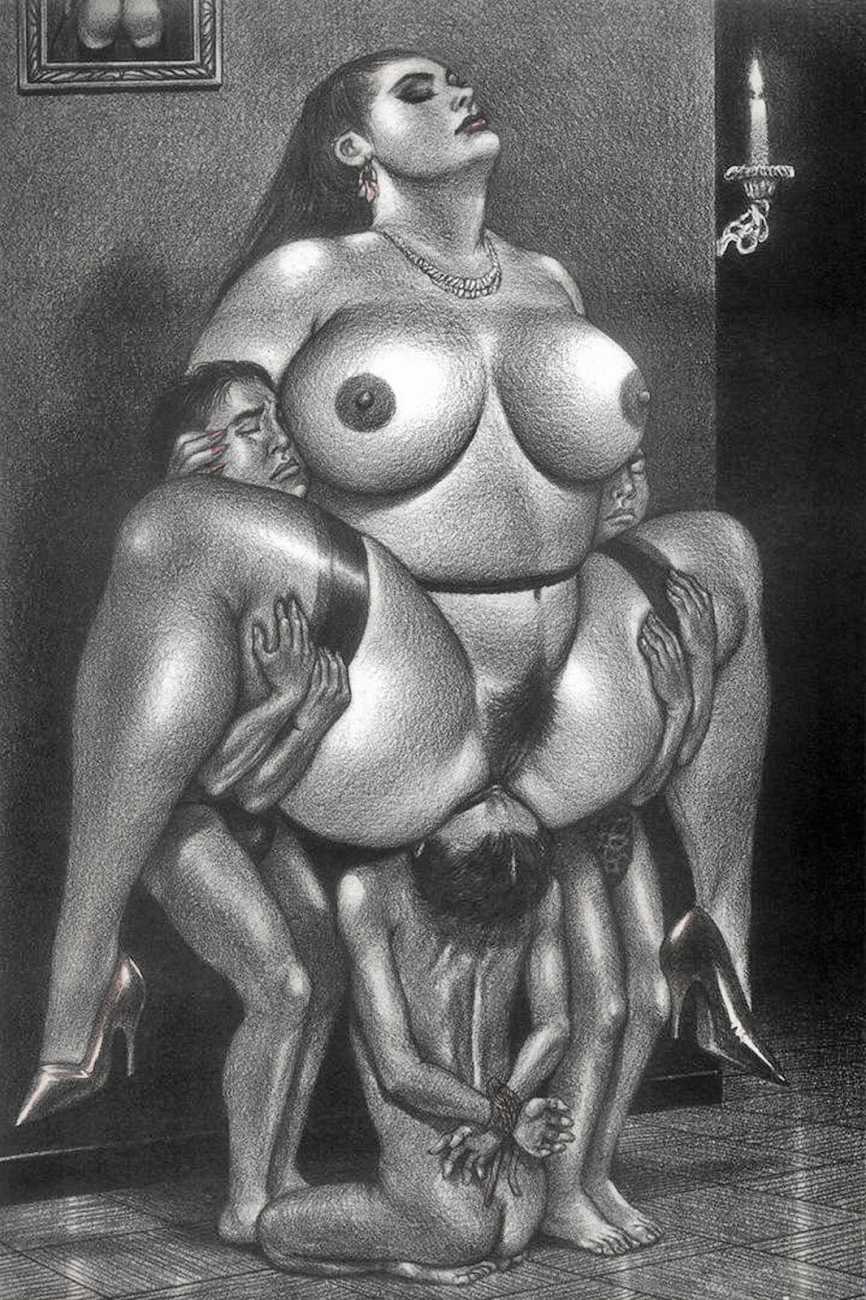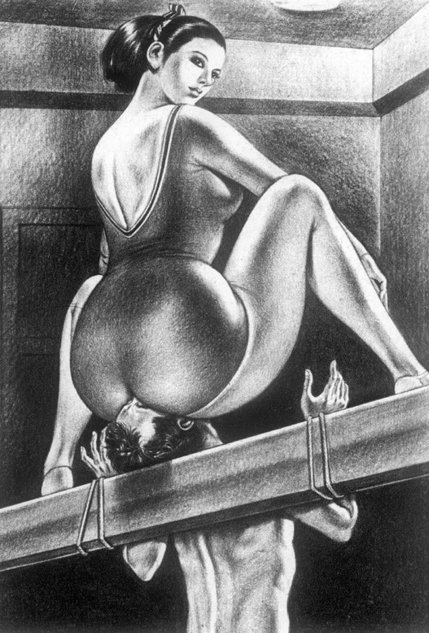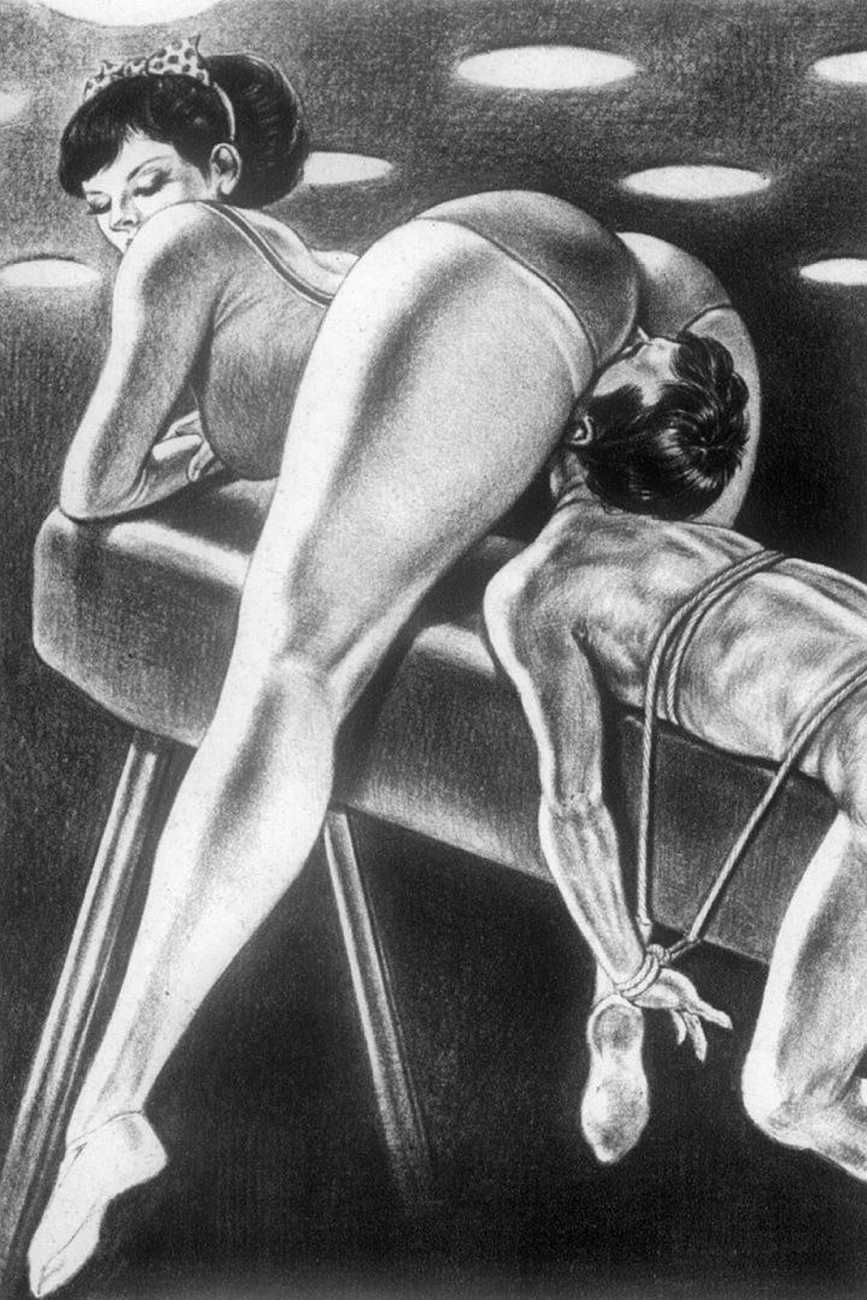 Garden of Domina: An Enterprise of Domination (Emonogatari Domina No Sono, 絵物語 ドミナノソノ) tells the story of Ohara Kana, a former volleyball player turned model. She capitalises on the filming of an advertisement for a cosmetics company to awaken the employees to the joys of domination. She becomes a director and opens a beauty salon, with services provided exclusively by masochistic men, creating a theme park run by slaves and a company that rents out slaves to select women clients. The drawings depict scenes of women sitting on top of submissive men, ignoring and crushing them while enjoying drinking a glass of wine with friends, smoking a cigarette, or reading.