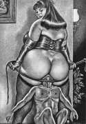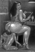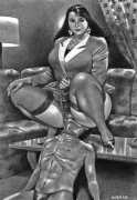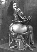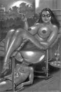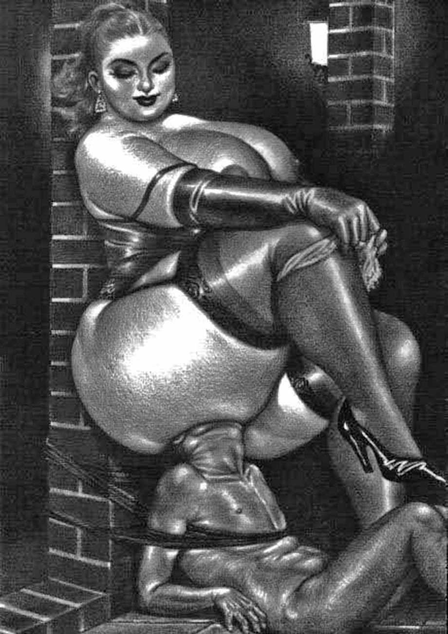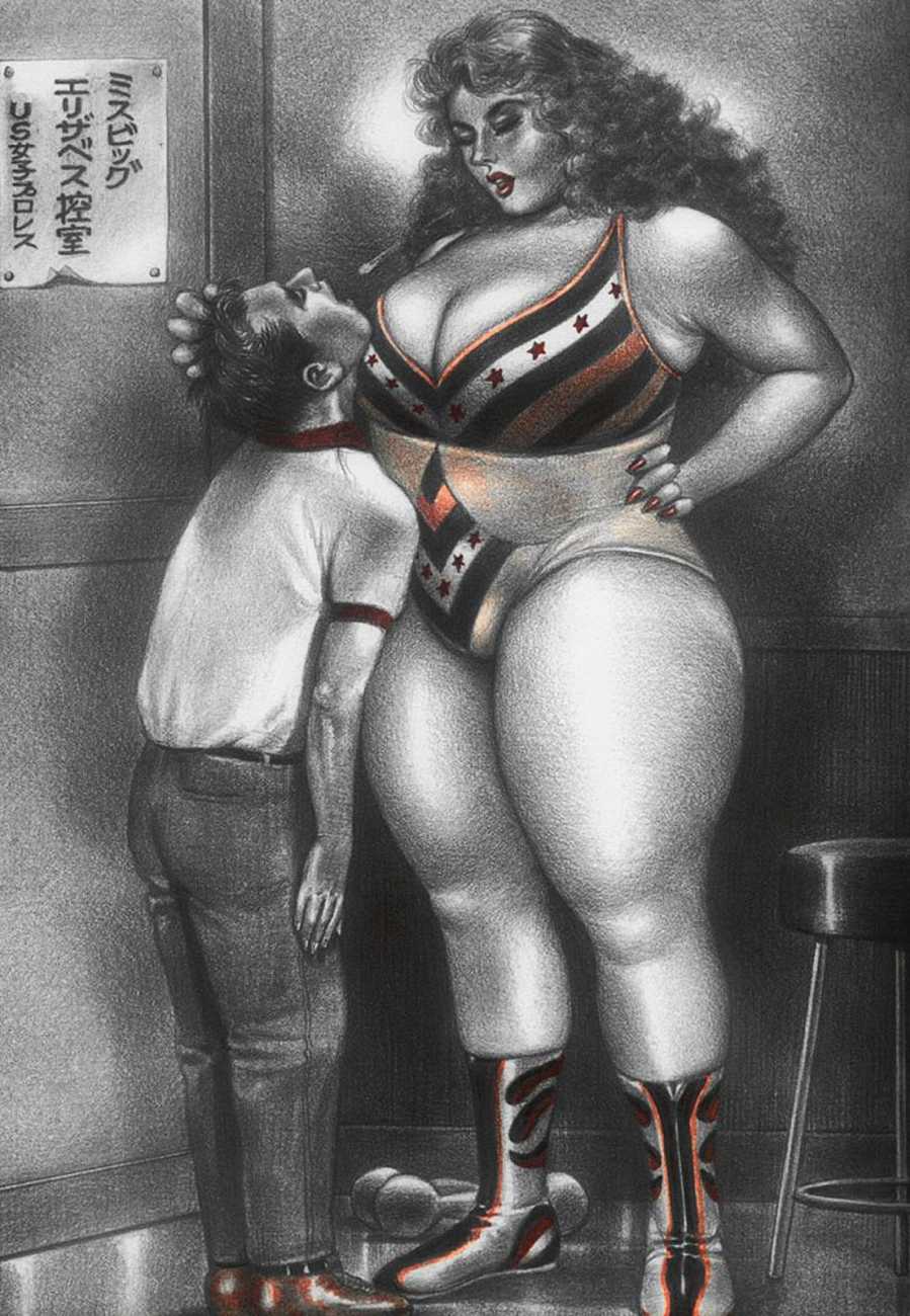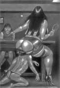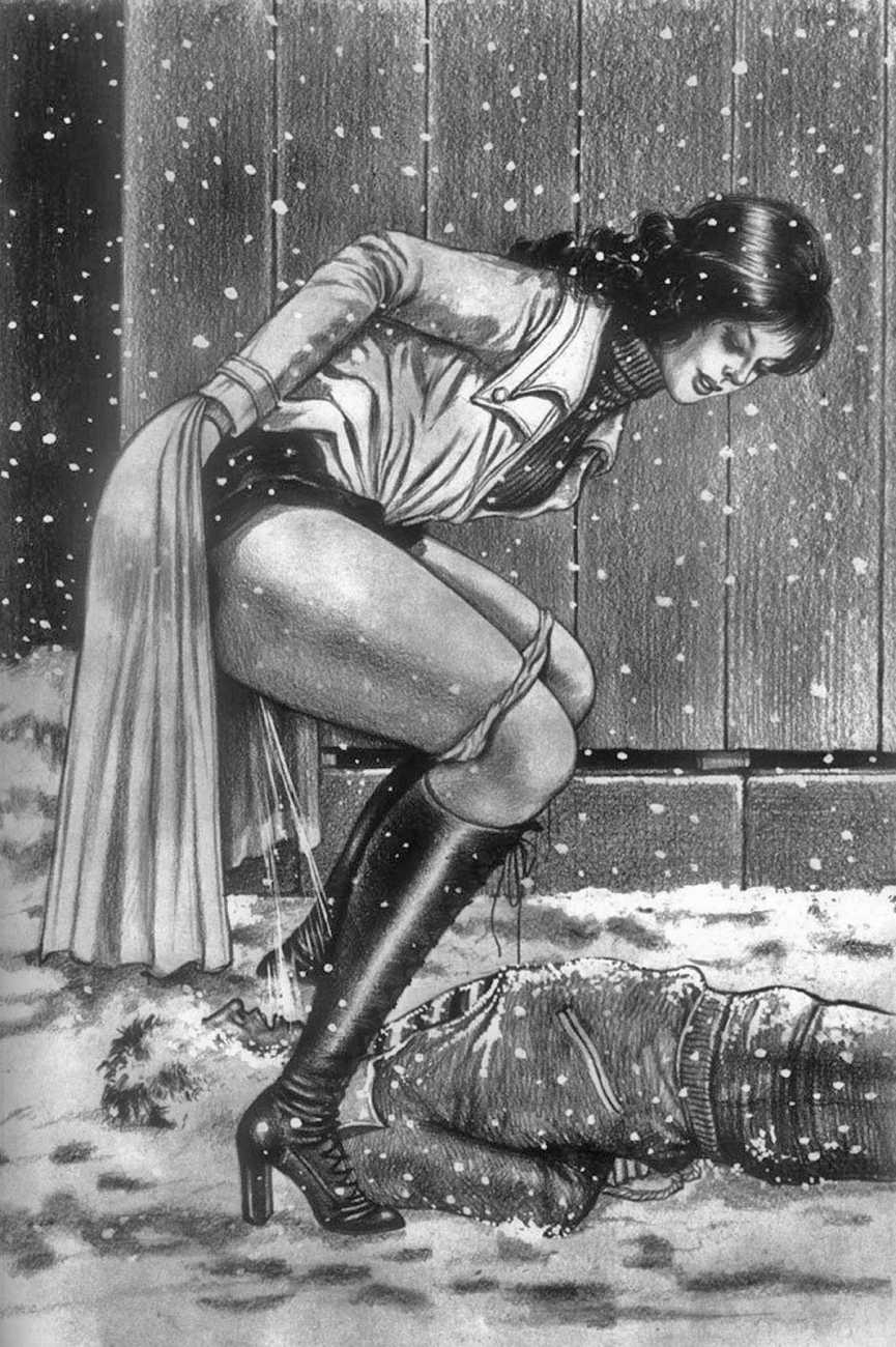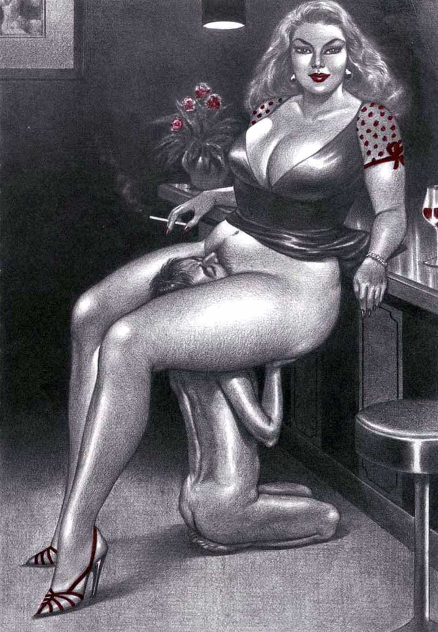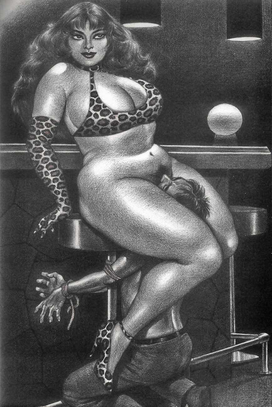 Garden of Domina: An Enterprise of Domination (Emonogatari Domina No Sono, 絵物語 ドミナノソノ) tells the story of Ohara Kana, a former volleyball player turned model. She capitalises on the filming of an advertisement for a cosmetics company to awaken the employees to the joys of domination. She becomes a director and opens a beauty salon, with services provided exclusively by masochistic men, creating a theme park run by slaves and a company that rents out slaves to select women clients. The drawings depict scenes of women sitting on top of submissive men, ignoring and crushing them while enjoying drinking a glass of wine with friends, smoking a cigarette, or reading.