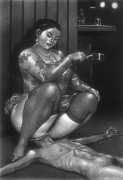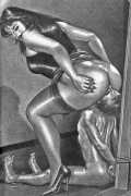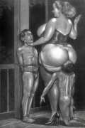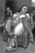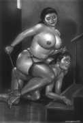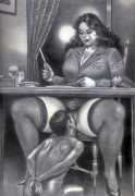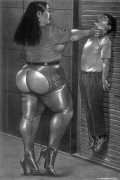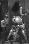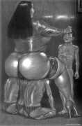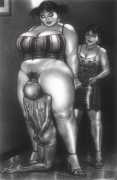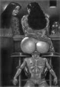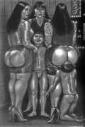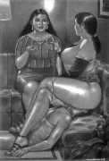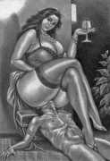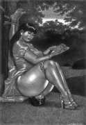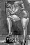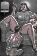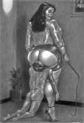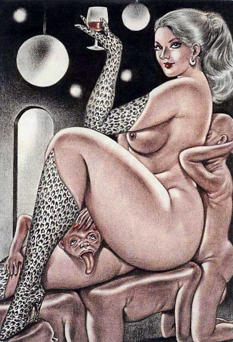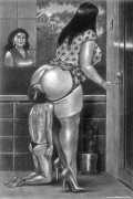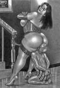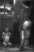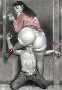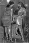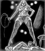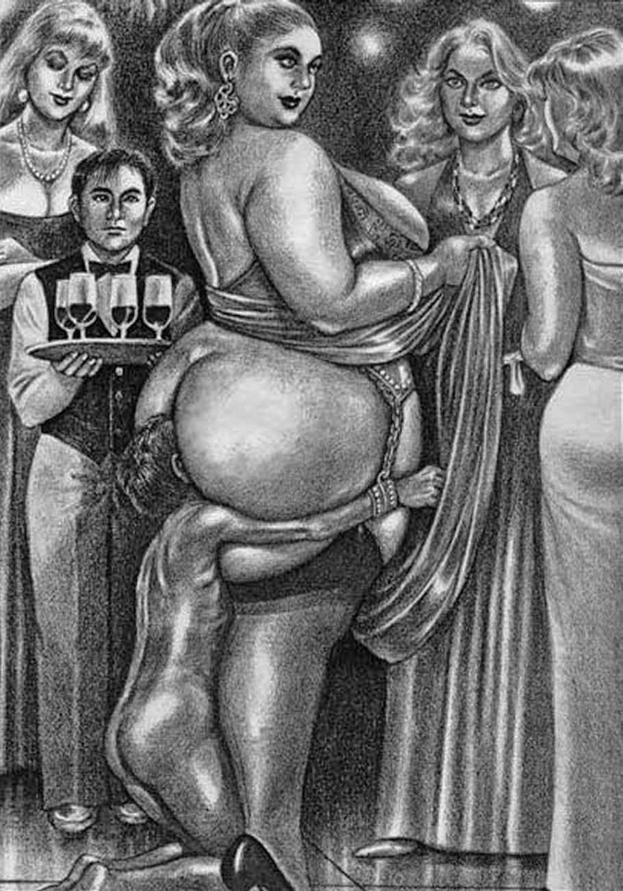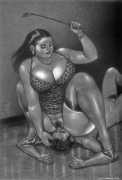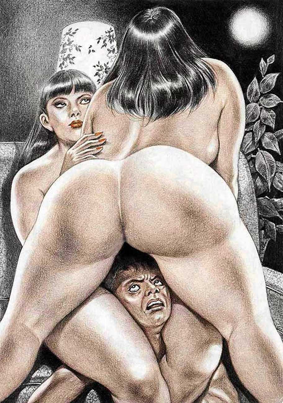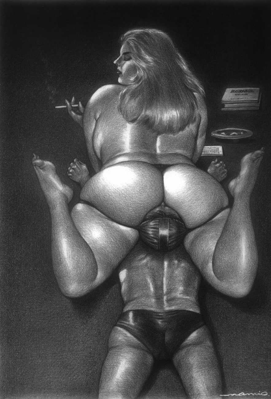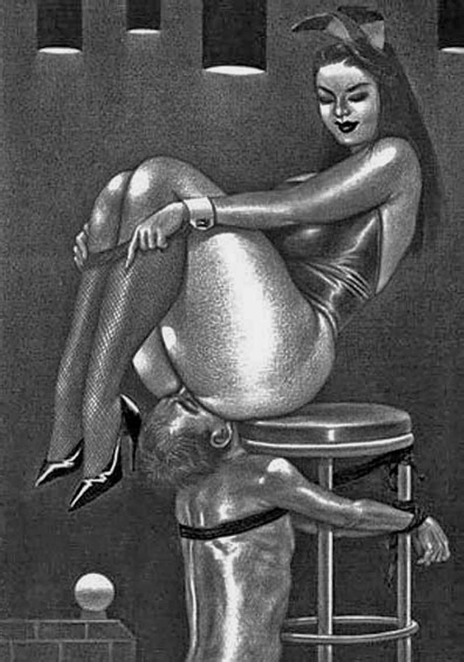 Garden of Domina: An Enterprise of Domination (Emonogatari Domina No Sono, 絵物語 ドミナノソノ) tells the story of Ohara Kana, a former volleyball player turned model. She capitalises on the filming of an advertisement for a cosmetics company to awaken the employees to the joys of domination. She becomes a director and opens a beauty salon, with services provided exclusively by masochistic men, creating a theme park run by slaves and a company that rents out slaves to select women clients. The drawings depict scenes of women sitting on top of submissive men, ignoring and crushing them while enjoying drinking a glass of wine with friends, smoking a cigarette, or reading.