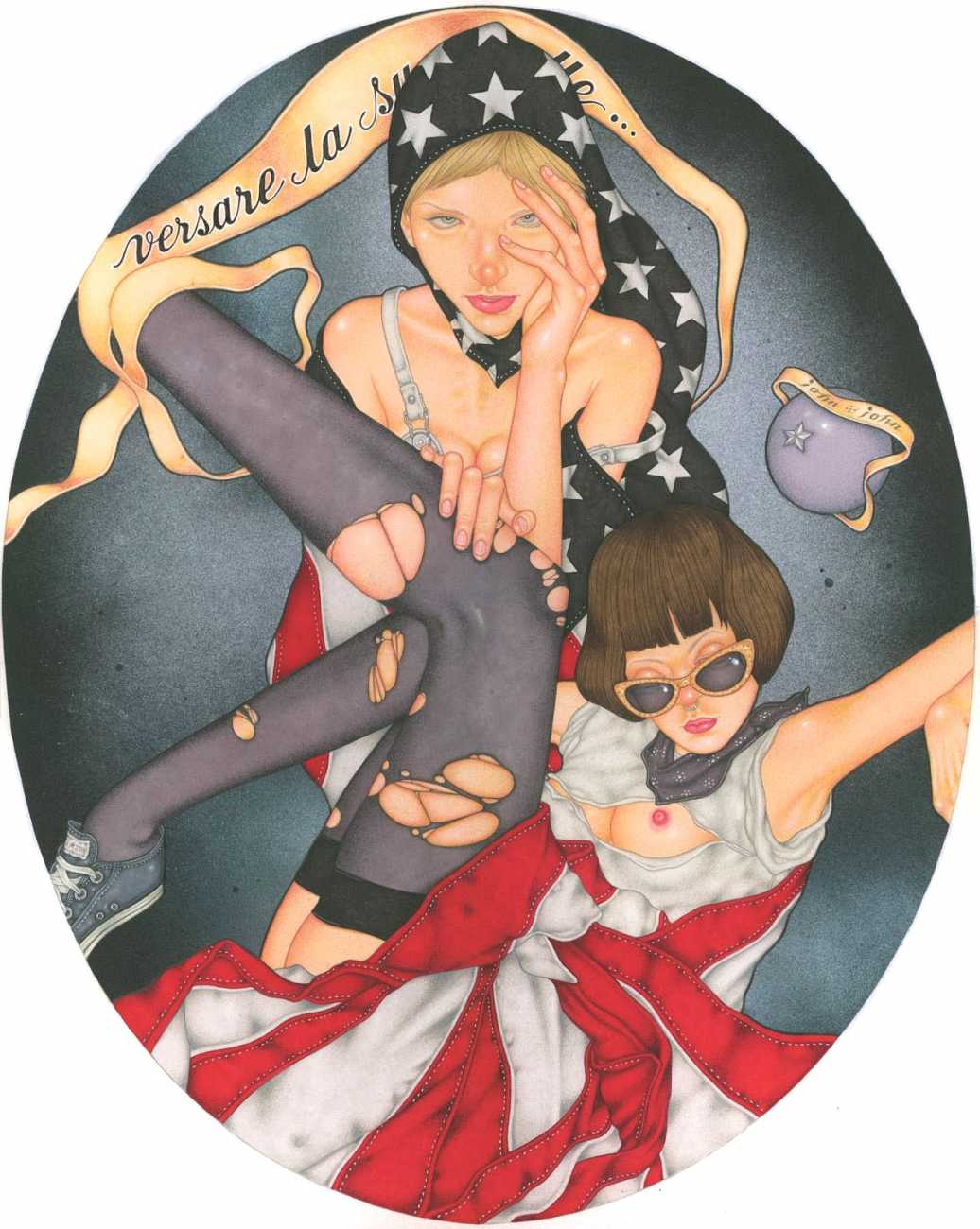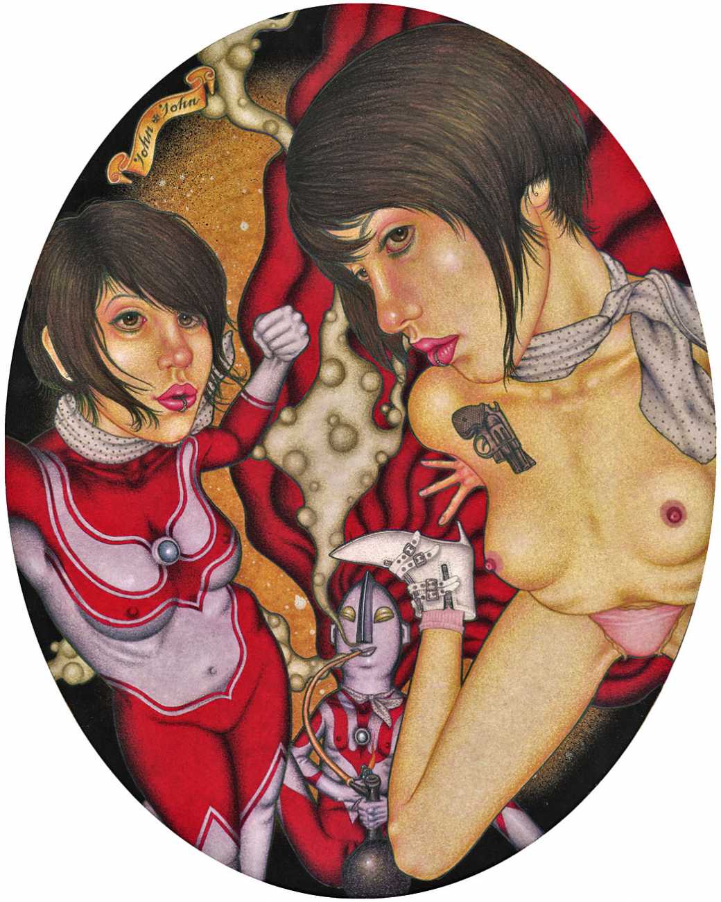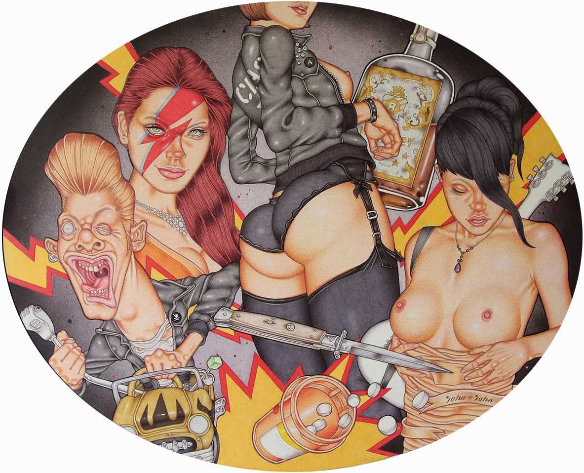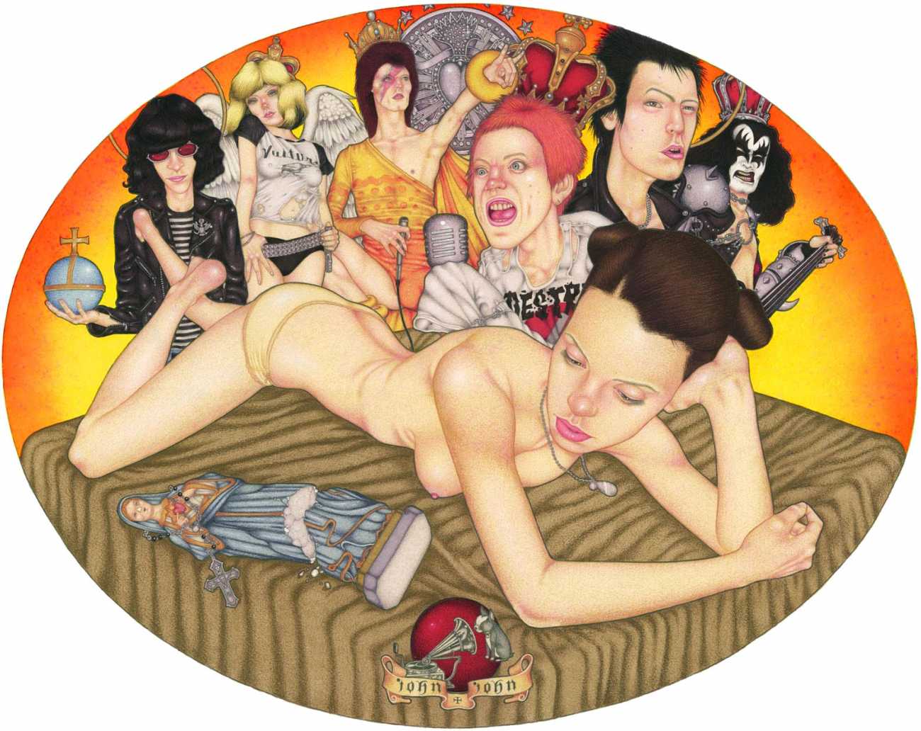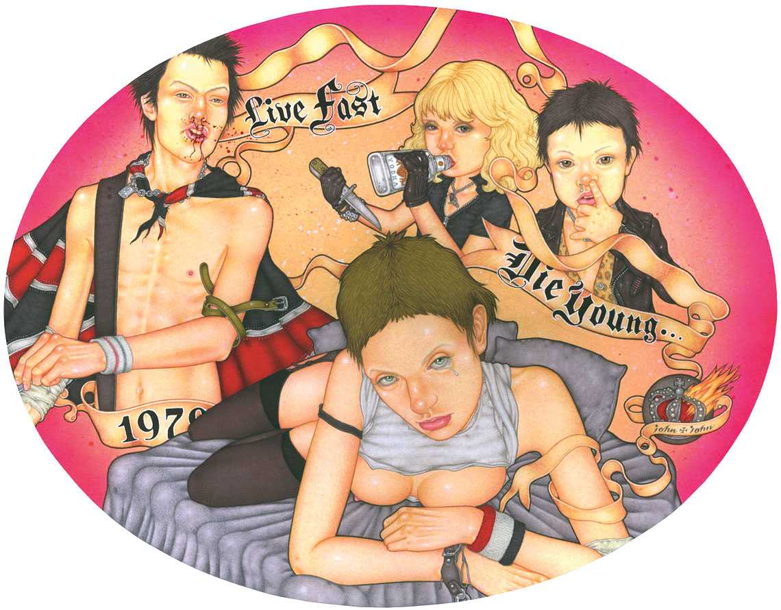 Through his art, as with his music, John John Jesse embodies the New York City punk rock lifestyle, and he shares his experiences through his paintings. His style has evolved into a distinct artistic language, concentrating on lifelike images surrounded by obsessive detail. Vivid colours built up in translucent layers of gouache, graphite, ink, spray paint and acrylic are usually hand-painted on wooden panels, and often framed in vintage baroque frames. He paints the girls he grew up with, documenting their punk lifestyle of drink and drugs. Most of the people featured in his work are friends of his, generally naked or partially undressed, pictured in situations that are at the same time colourful, entertaining, fantastic and gritty.