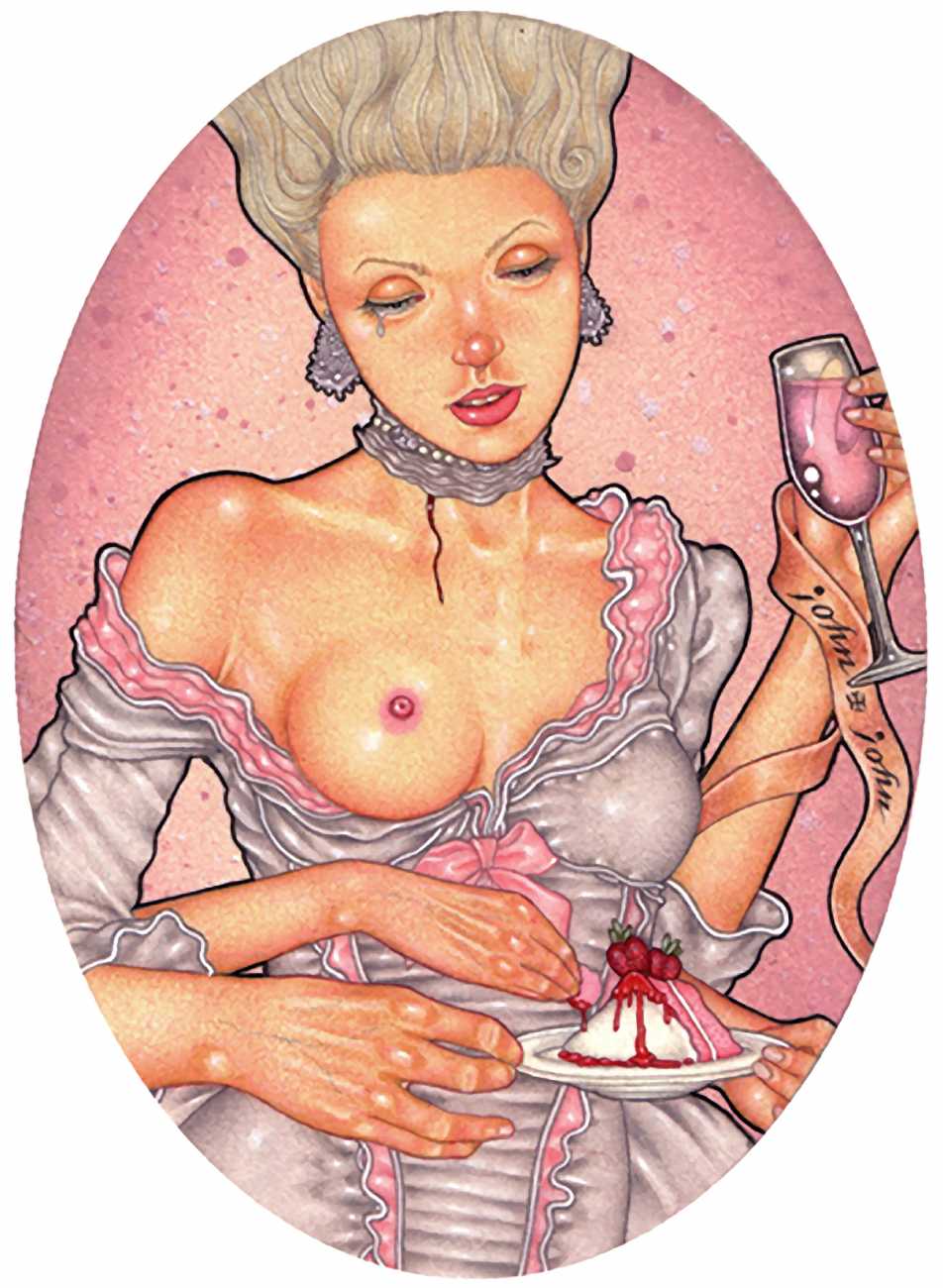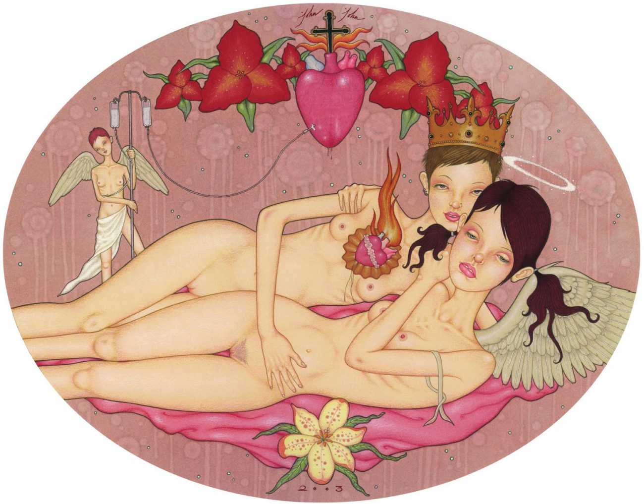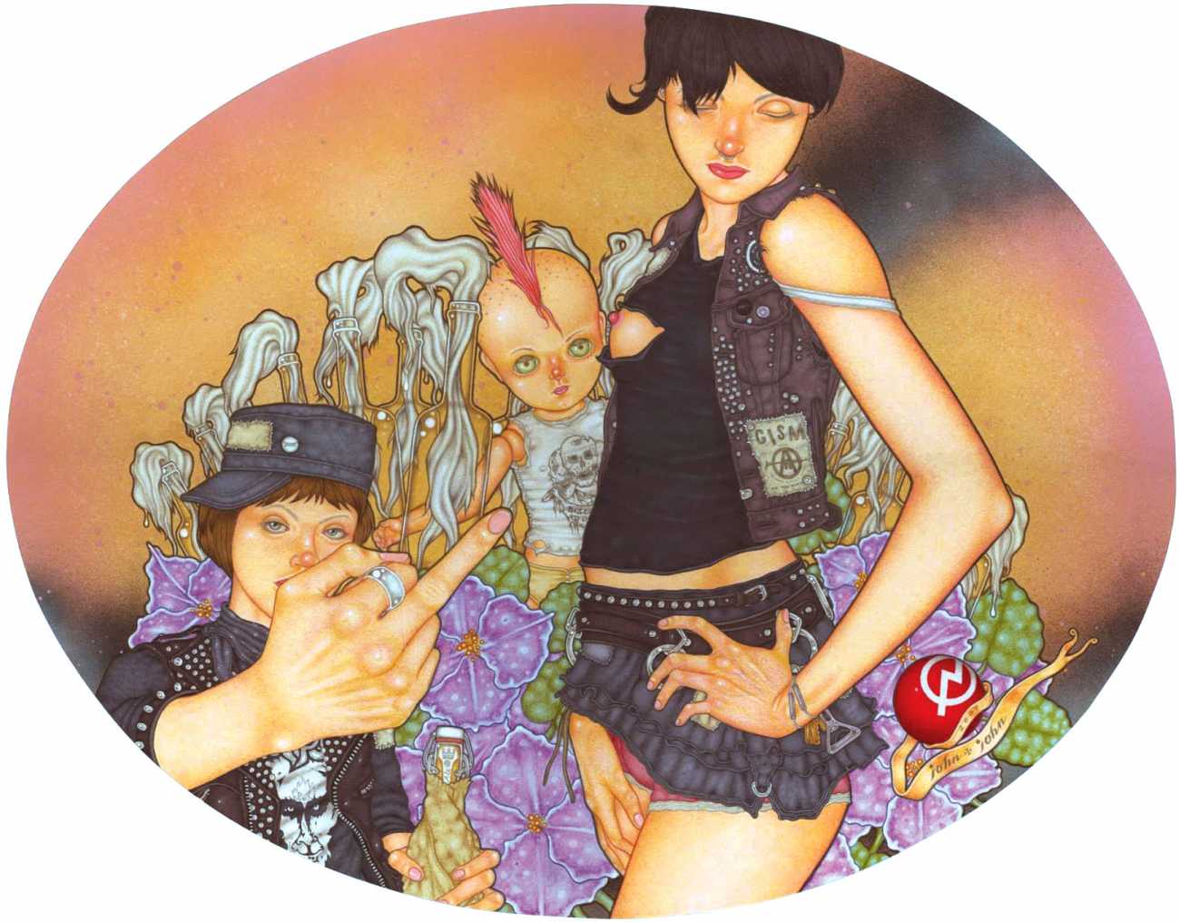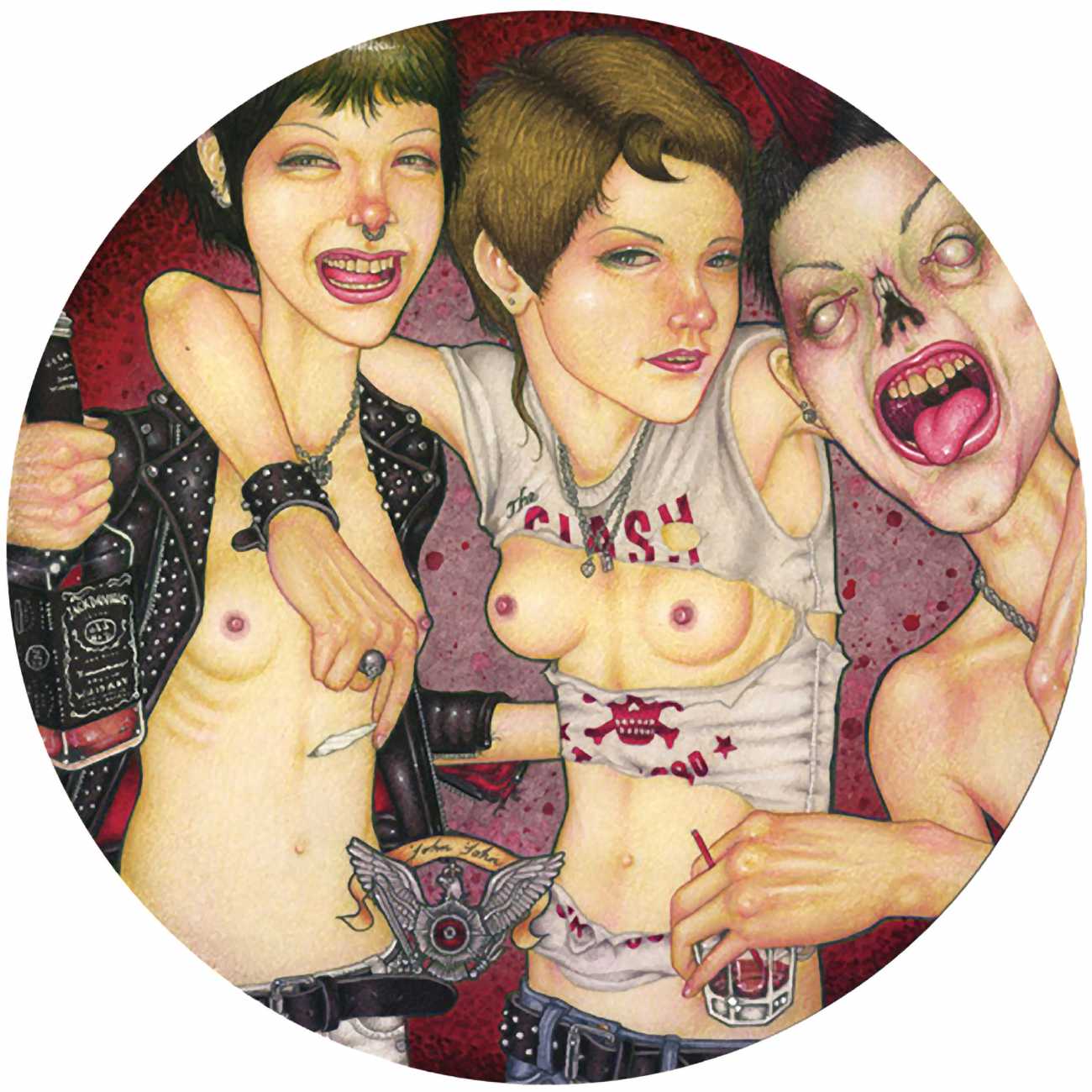 Through his art, as with his music, John John Jesse embodies the New York City punk rock lifestyle, and he shares his experiences through his paintings. His style has evolved into a distinct artistic language, concentrating on lifelike images surrounded by obsessive detail. Vivid colours built up in translucent layers of gouache, graphite, ink, spray paint and acrylic are usually hand-painted on wooden panels, and often framed in vintage baroque frames. He paints the girls he grew up with, documenting their punk lifestyle of drink and drugs. Most of the people featured in his work are friends of his, generally naked or partially undressed, pictured in situations that are at the same time colourful, entertaining, fantastic and gritty.