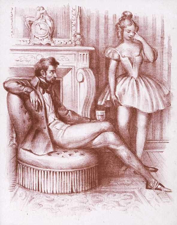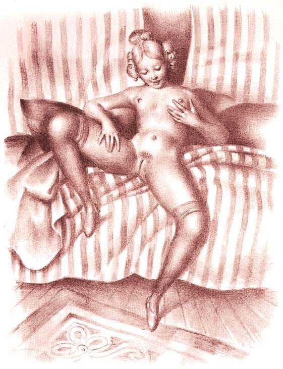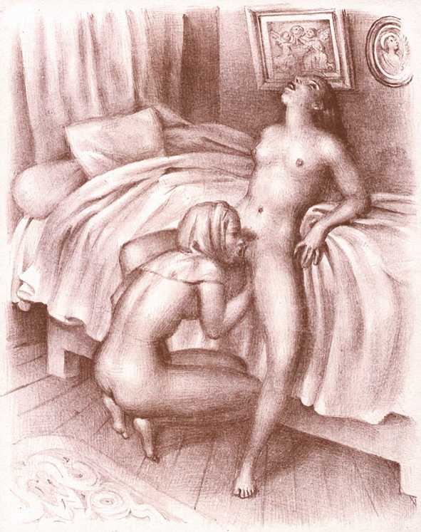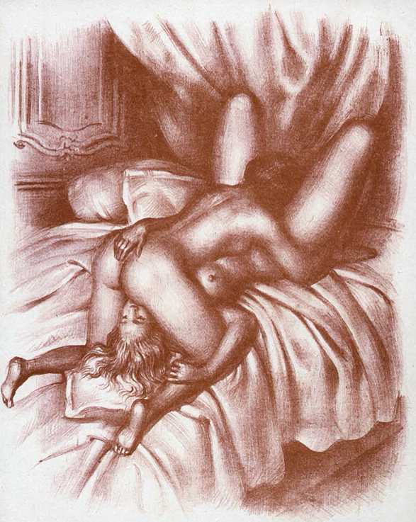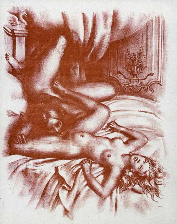 The anonymous set of plates shown here, from an edition published around 1950, are in the reddish-ochre ink known as ‘sanguine’, and though not of the highest calibre are highly competent. They have been attributed to Suzanne Ballivet, probably based on that assertion in the Hobart & Maclean ‘The Forbidden Library’ exhibition catalogue of 1986, but though one or two of the women’s faces have a certain similarity to her distinctive style there is nothing else to support the attribution.