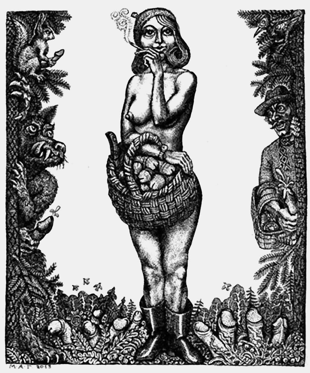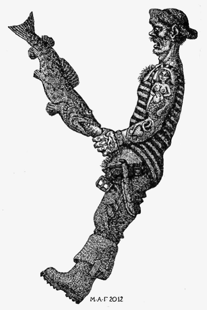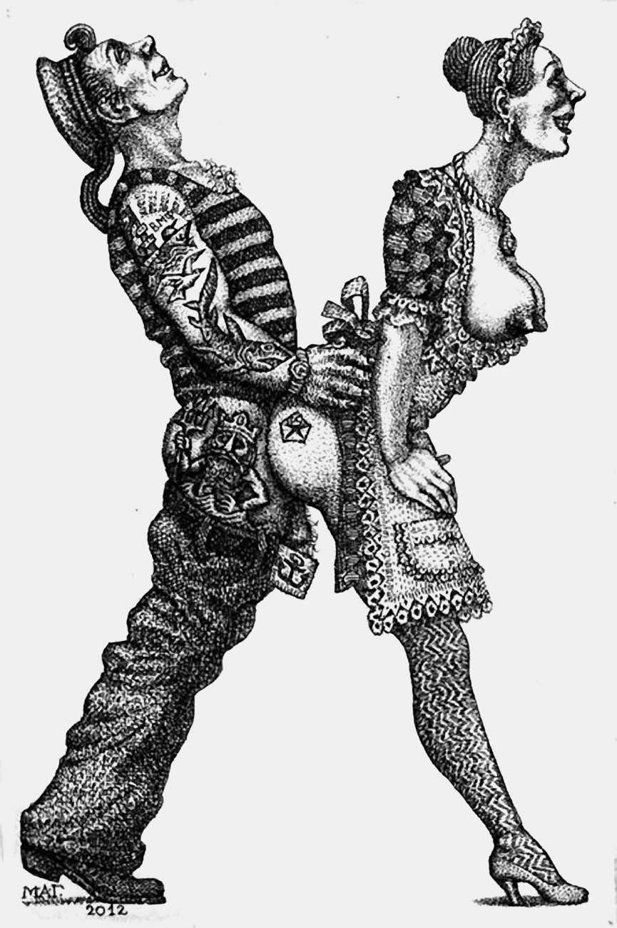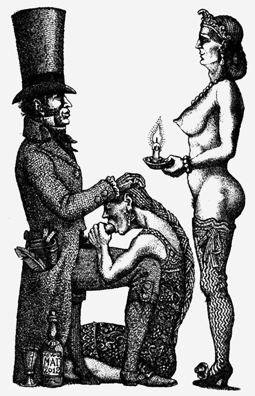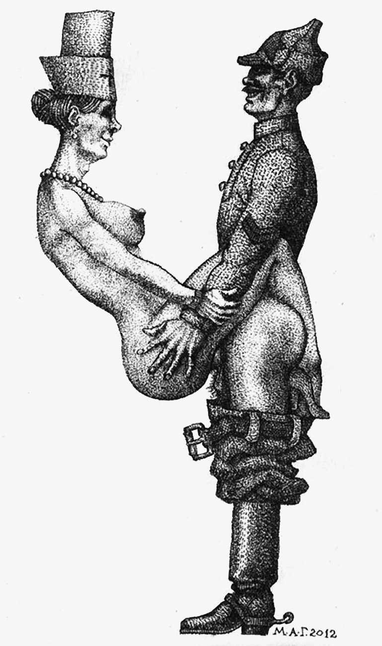 Mikhail Gavrichkov worked on the engravings for Азбука для Взрослых (ABC for Adults) for more than three years, the finished result being published by the St Petersburg publisher A. Danilov in 2013. The 33 plates are highly original and inventive, featuring a range of characters from classic Russian themes, all involved in sexual activities of one kind or another. Many of the men have wonderfully elongated members, engraved like traditional wooden columns, while most of the women sport tattoos, likewise following traditional designs.
