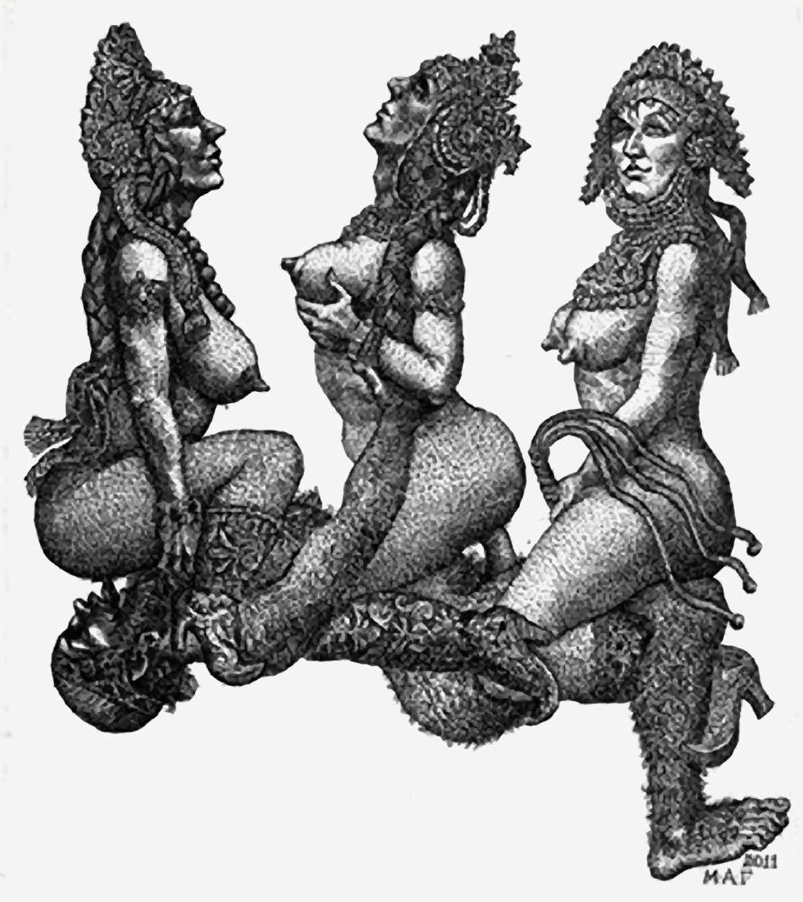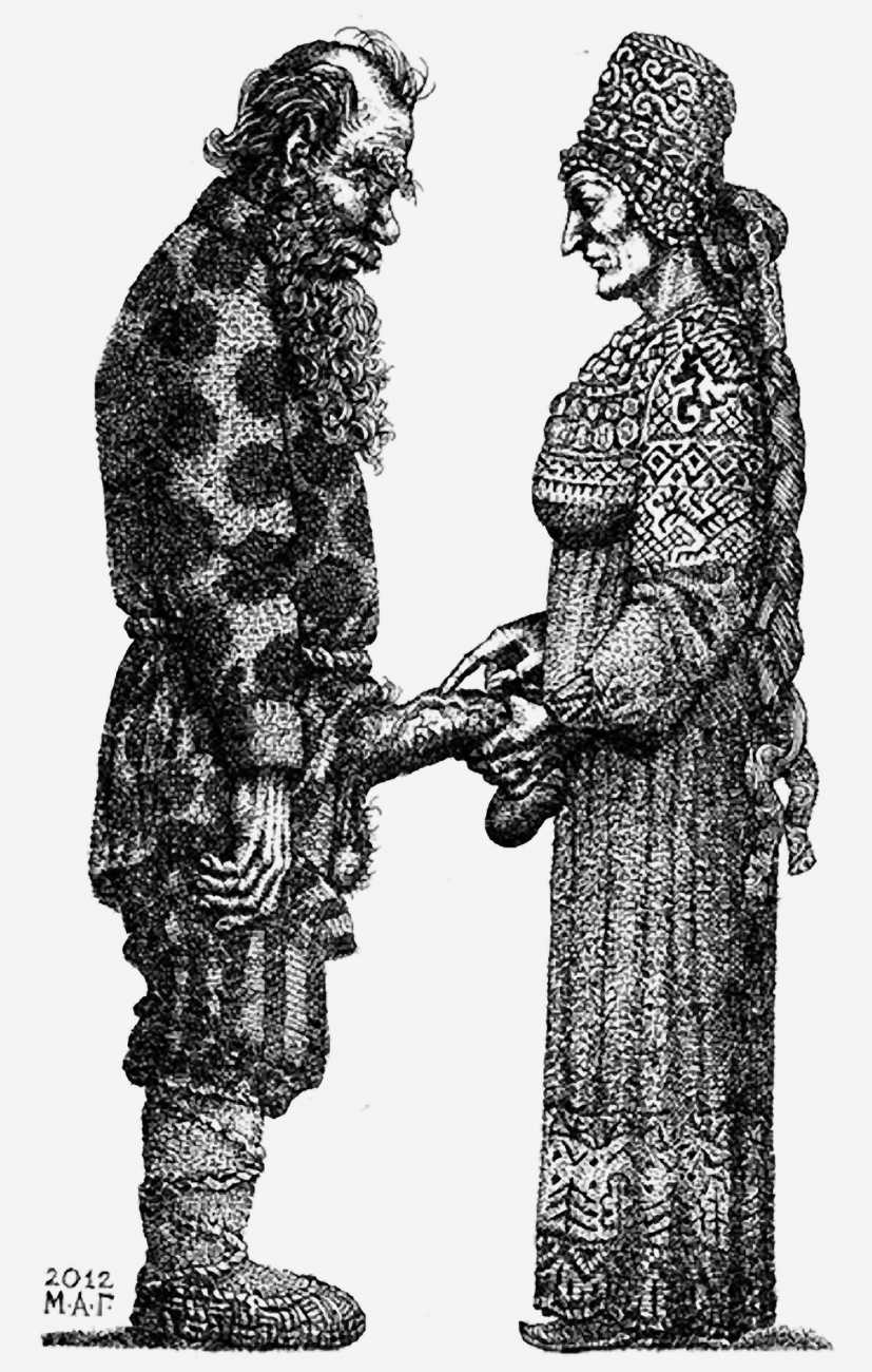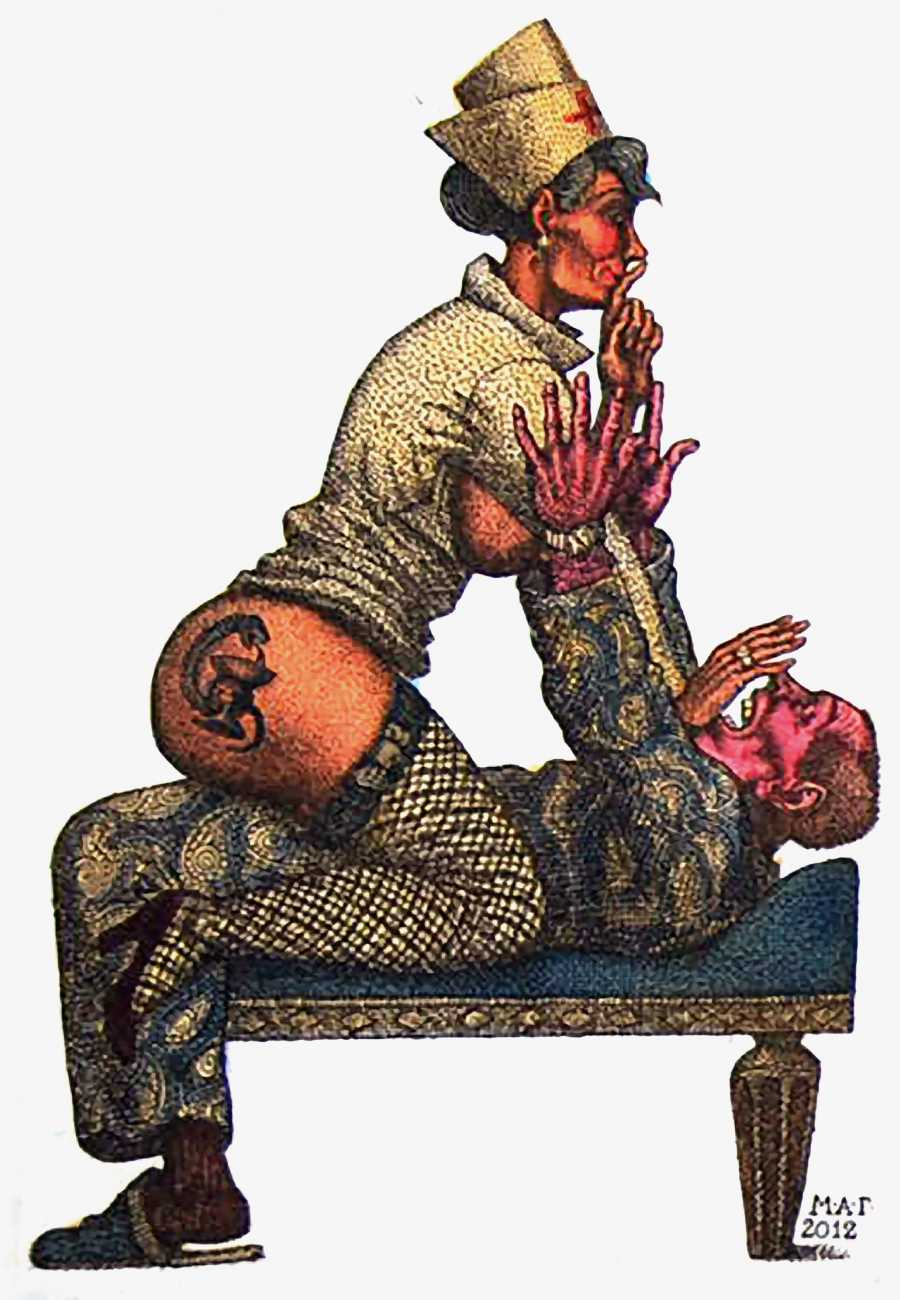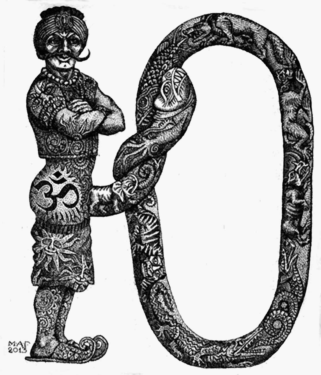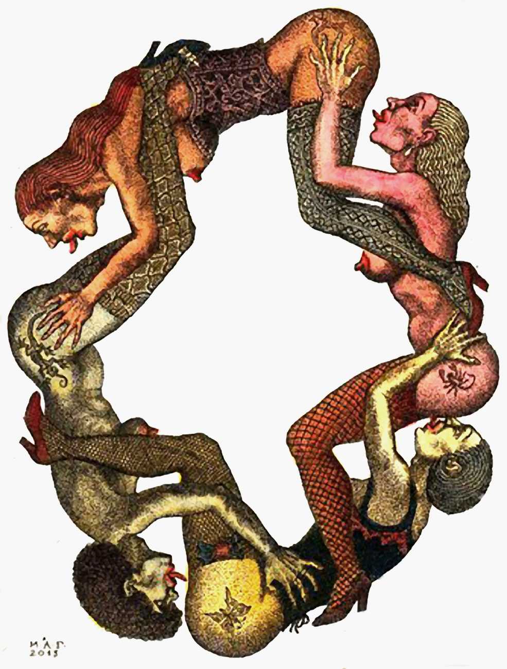 Mikhail Gavrichkov worked on the engravings for Азбука для Взрослых (ABC for Adults) for more than three years, the finished result being published by the St Petersburg publisher A. Danilov in 2013. The 33 plates are highly original and inventive, featuring a range of characters from classic Russian themes, all involved in sexual activities of one kind or another. Many of the men have wonderfully elongated members, engraved like traditional wooden columns, while most of the women sport tattoos, likewise following traditional designs.