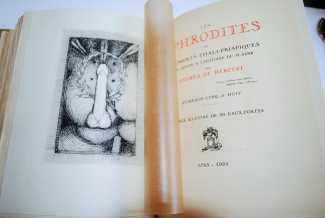 Les Aphrodites was to be Frans de Geetere’s largest illustration commission, with thirty plates depicting almost every sexual combination possible. As with Toison d’or, the participants in his erotic scenes are immediately recognisable as believable characters, and he manages to inject a good deal of wry humour into their intimate interactions.