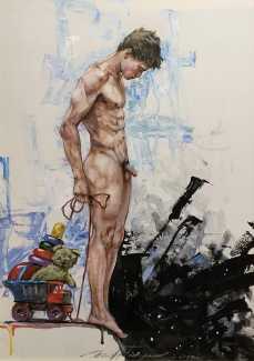 Kirill Fadeyev’s paintings combine the artistic skill of a traditionally-trained artist with an immensely fertile erotic imagination, constantly finding subjects which juxtapose explicit male nakedness with the fantasies and realities of the material world. Like a brilliant political cartoonist, he manages to see connections which surprise, titillate and amuse his viewers in equal measure.