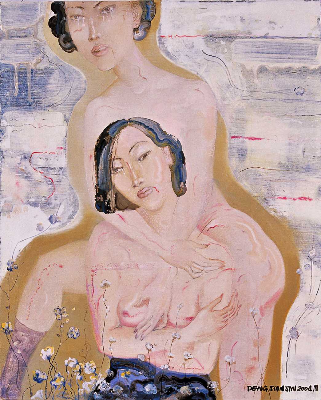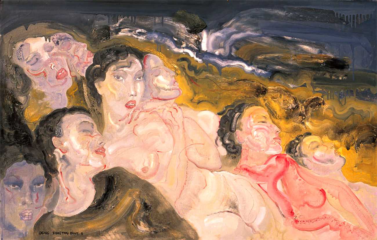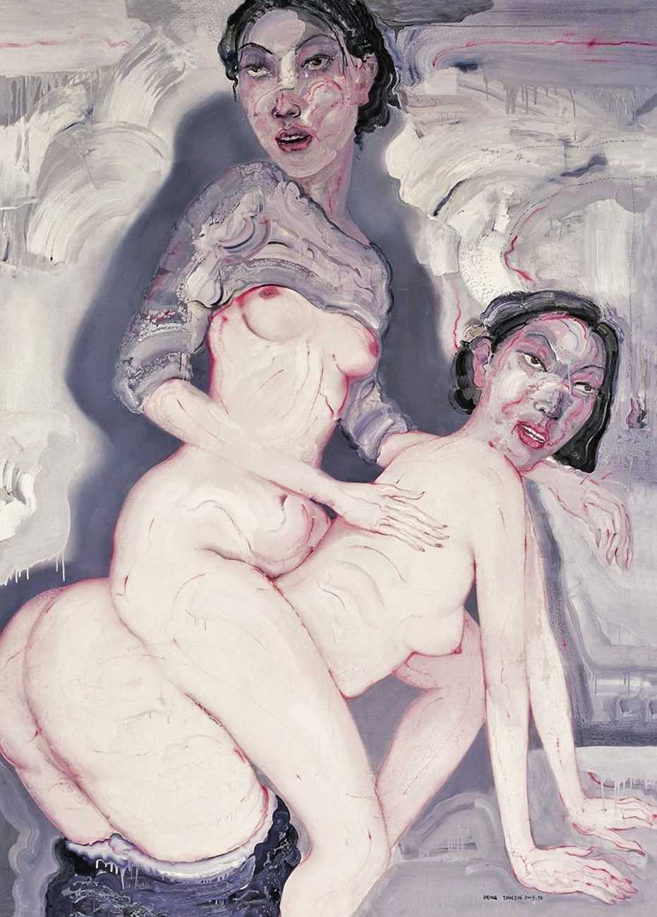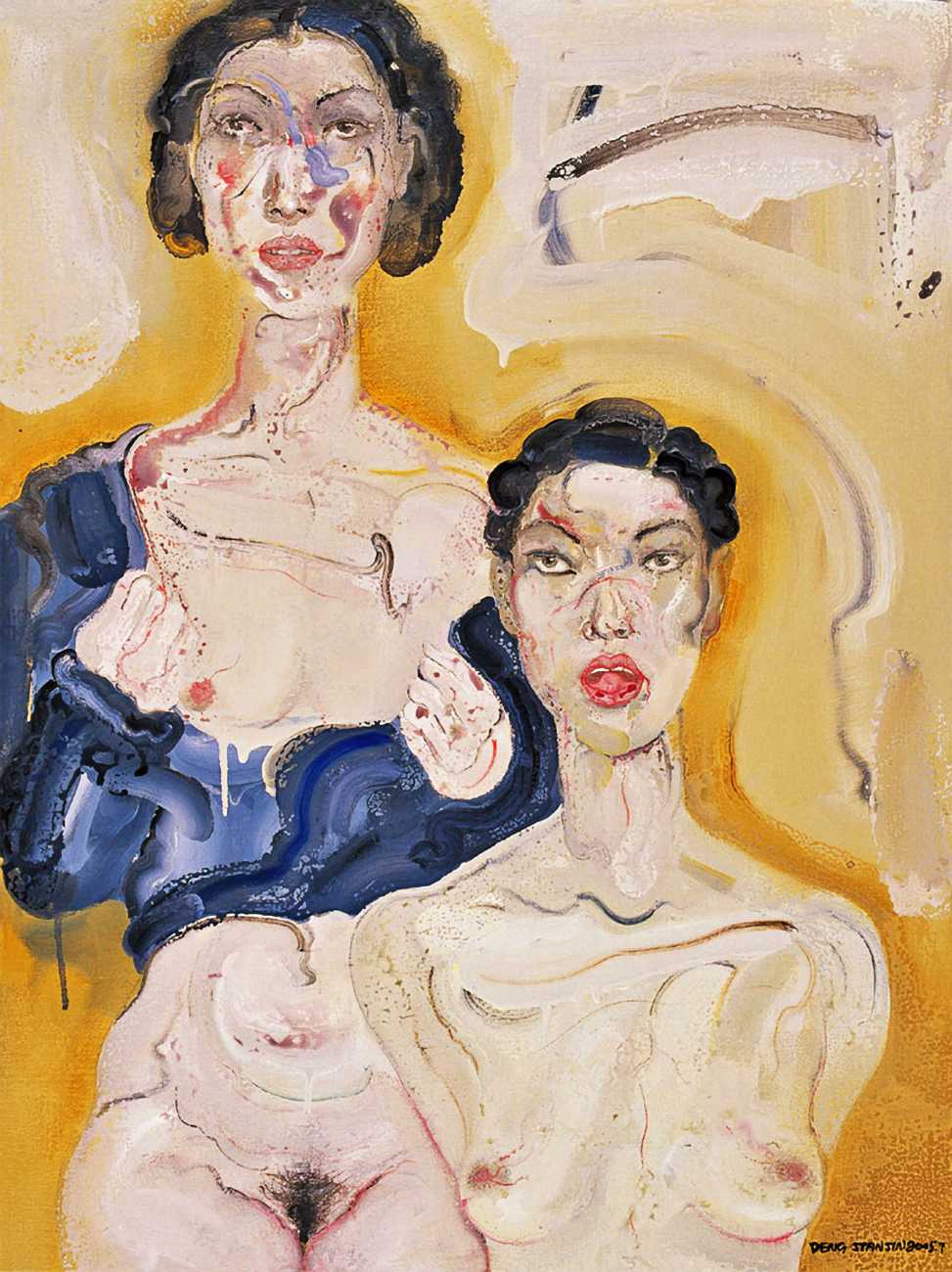 In this 2004–5 sequence of paintings we are firmly in the world of pleasure, where Deng’s imagination shows us fantasies of satisfying intimacy, most of them – interestingly from a male artist – between lesbian couples. The colours are warm, the fluid brushstrokes suggesting the rewarding tactile quality of shared naked skin.