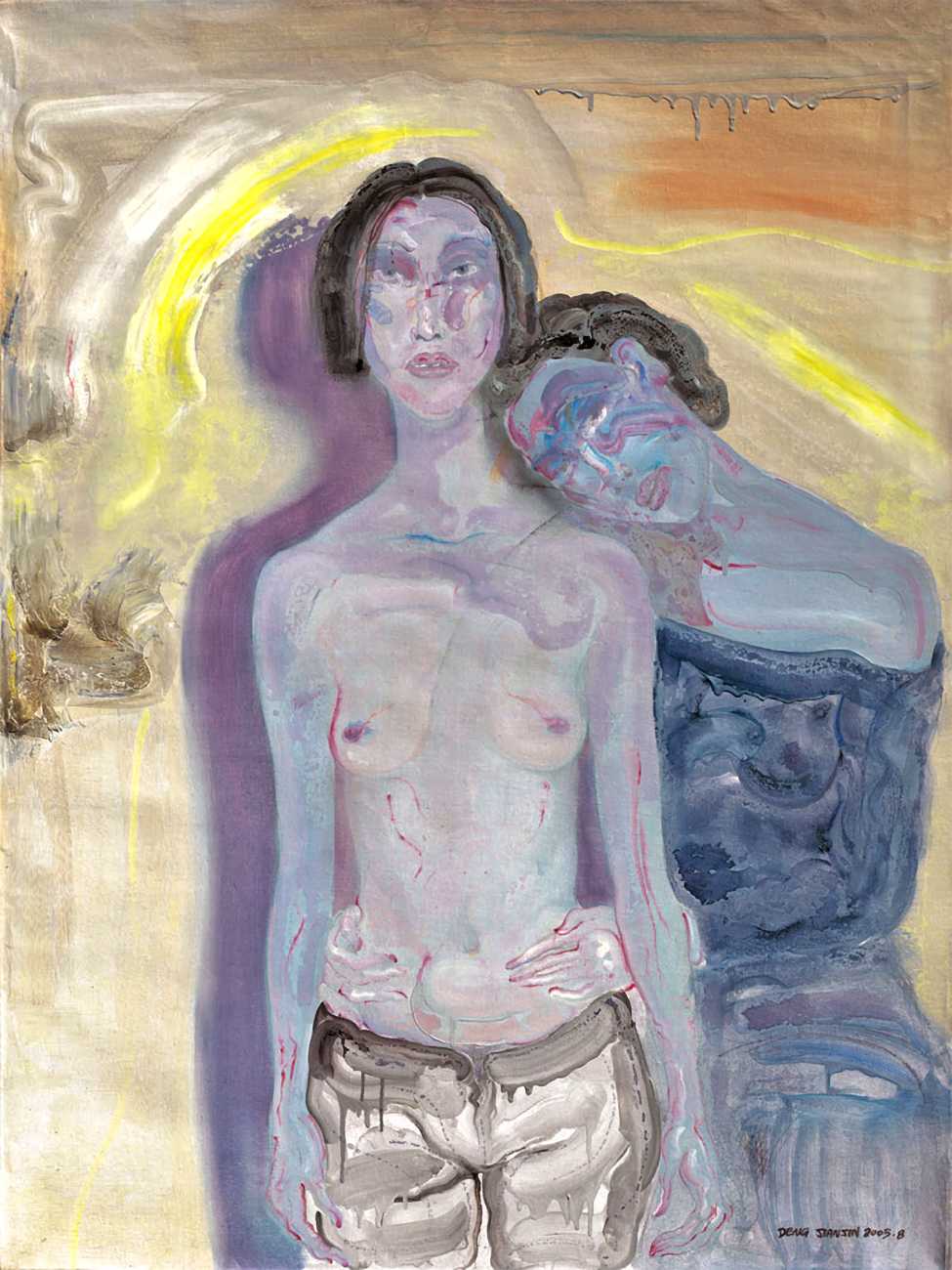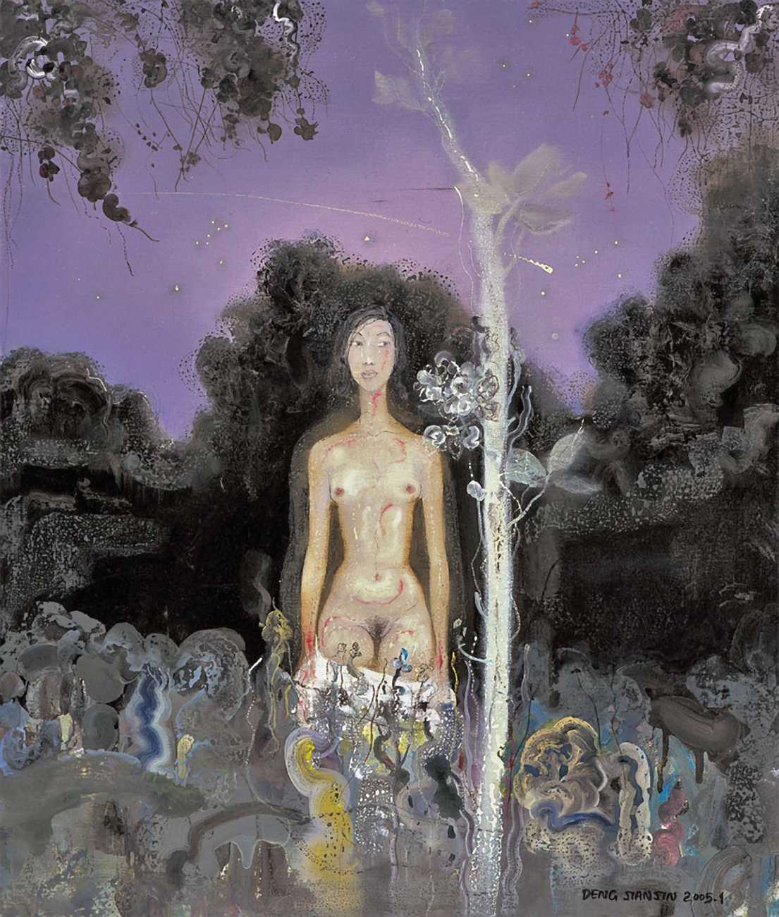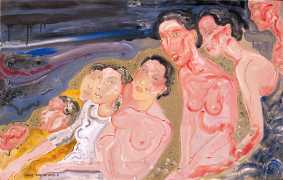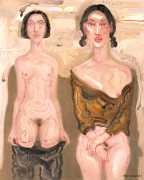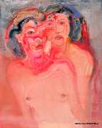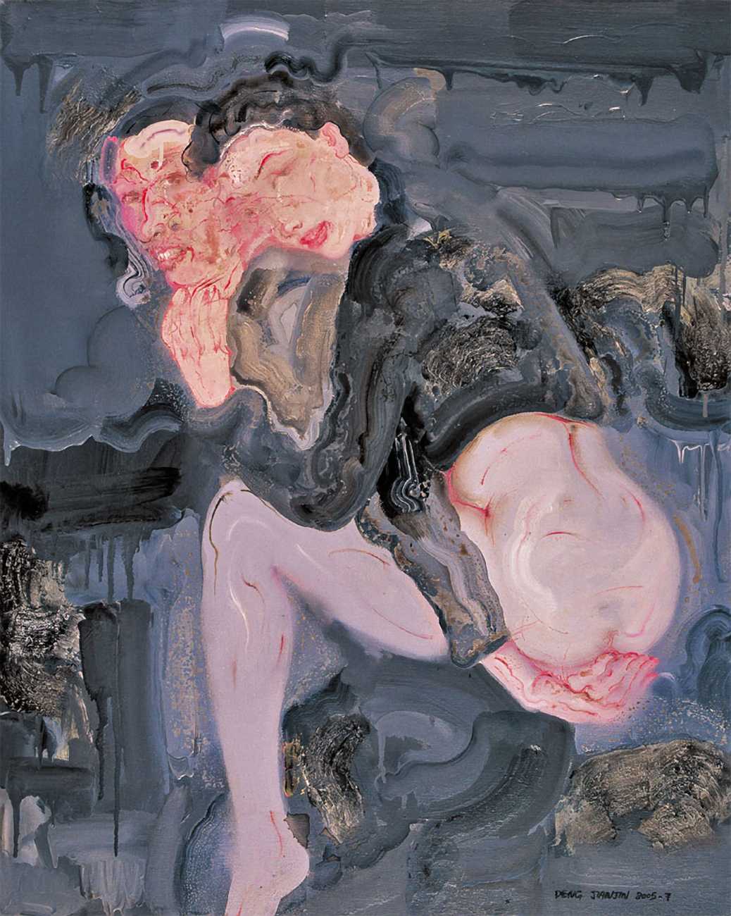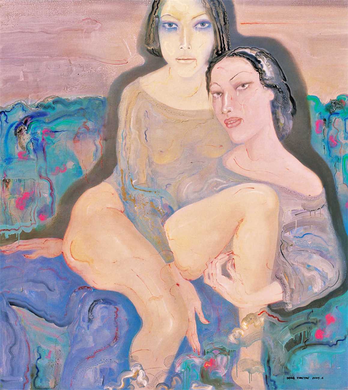 In this 2004–5 sequence of paintings we are firmly in the world of pleasure, where Deng’s imagination shows us fantasies of satisfying intimacy, most of them – interestingly from a male artist – between lesbian couples. The colours are warm, the fluid brushstrokes suggesting the rewarding tactile quality of shared naked skin.