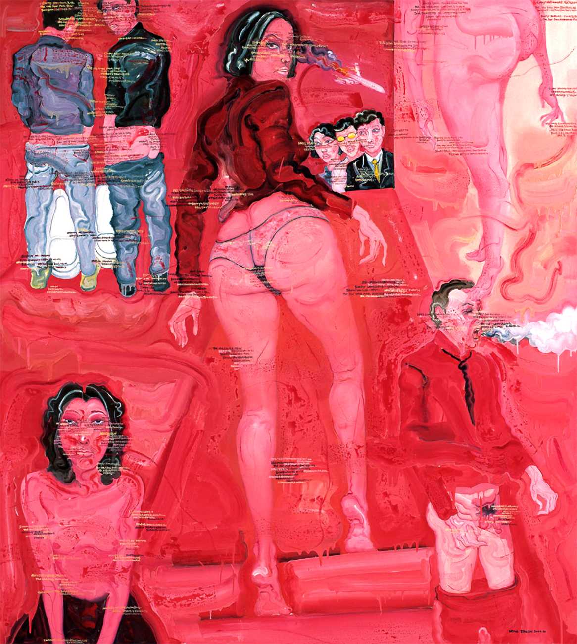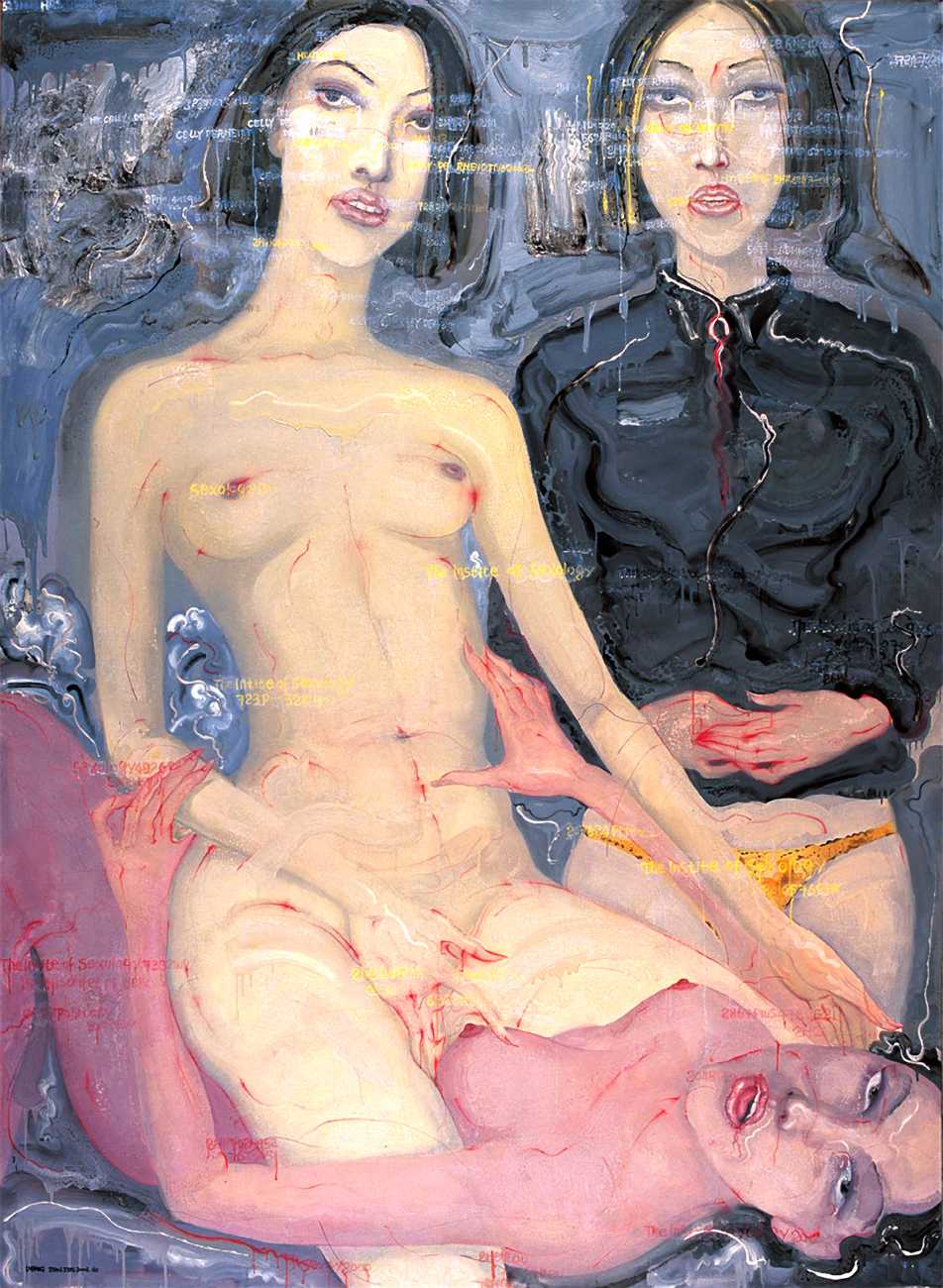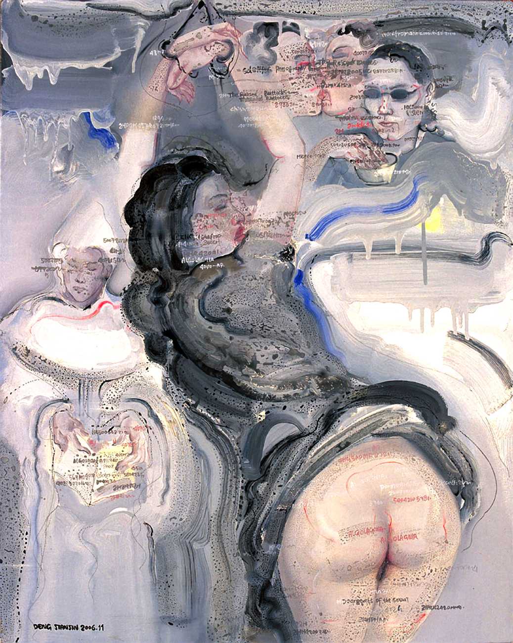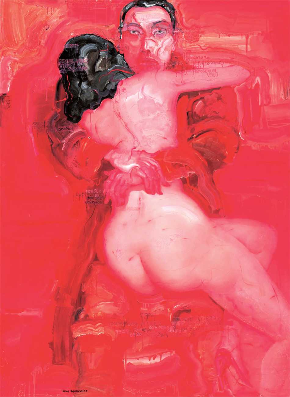 This series of Deng Jianjin’s paintings, made between 2006 and 2008, explores the world of dreams – and nightmares. His colour schemes here are more varied, the fantasies include public humiliation and spanking, and he introduces superimposed text in many of the canvases reflecting what the protagonists might be turning over in their minds. In the second painting, for example, the text near the man’s head includes ‘The Calculus of Desire’ – whose pleasure is whose?