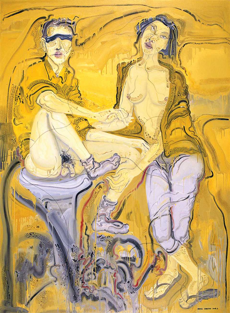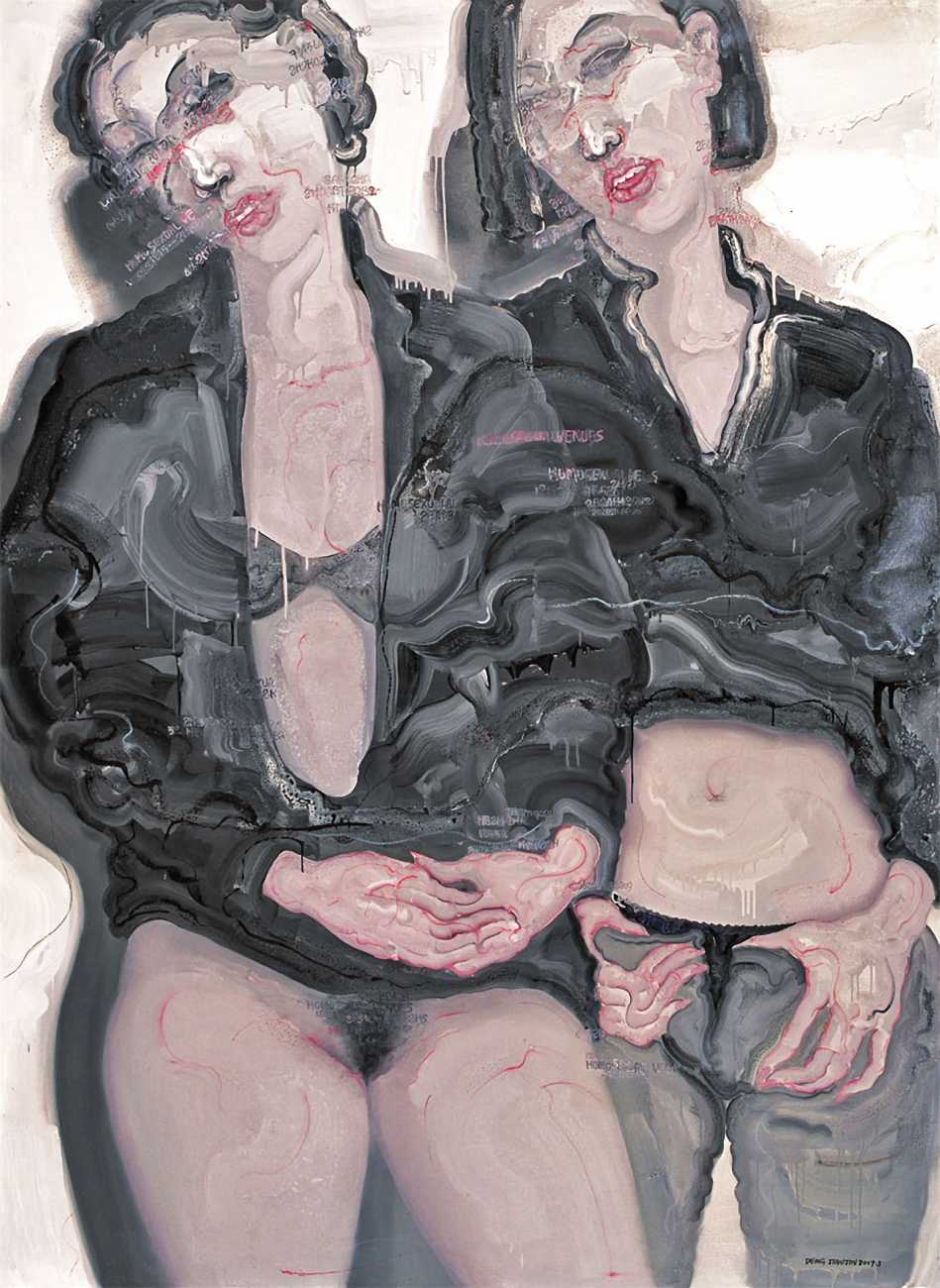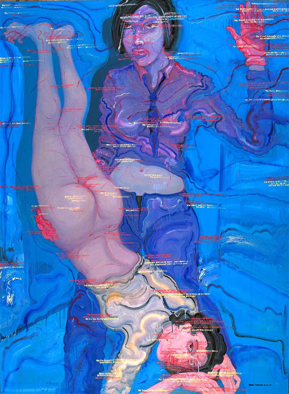 This series of Deng Jianjin’s paintings, made between 2006 and 2008, explores the world of dreams – and nightmares. His colour schemes here are more varied, the fantasies include public humiliation and spanking, and he introduces superimposed text in many of the canvases reflecting what the protagonists might be turning over in their minds. In the second painting, for example, the text near the man’s head includes ‘The Calculus of Desire’ – whose pleasure is whose?