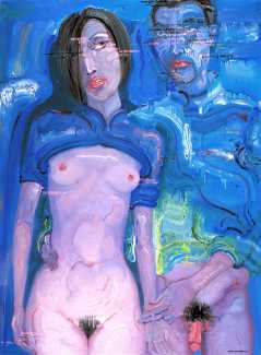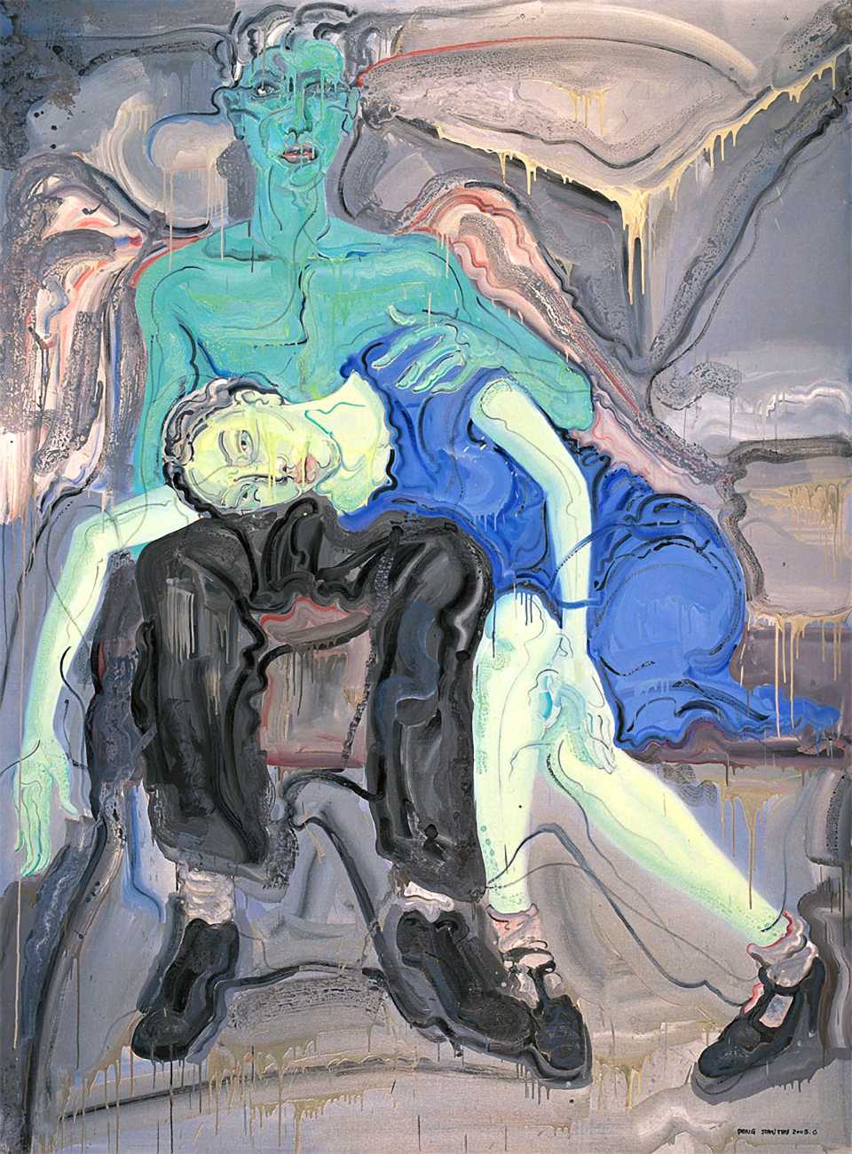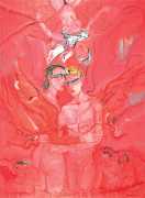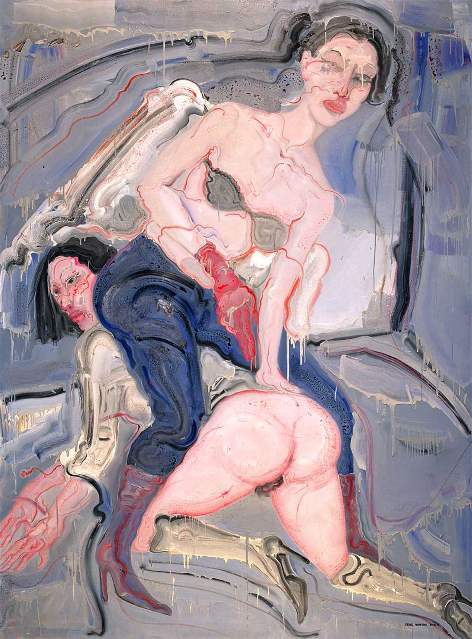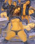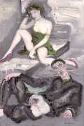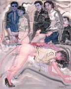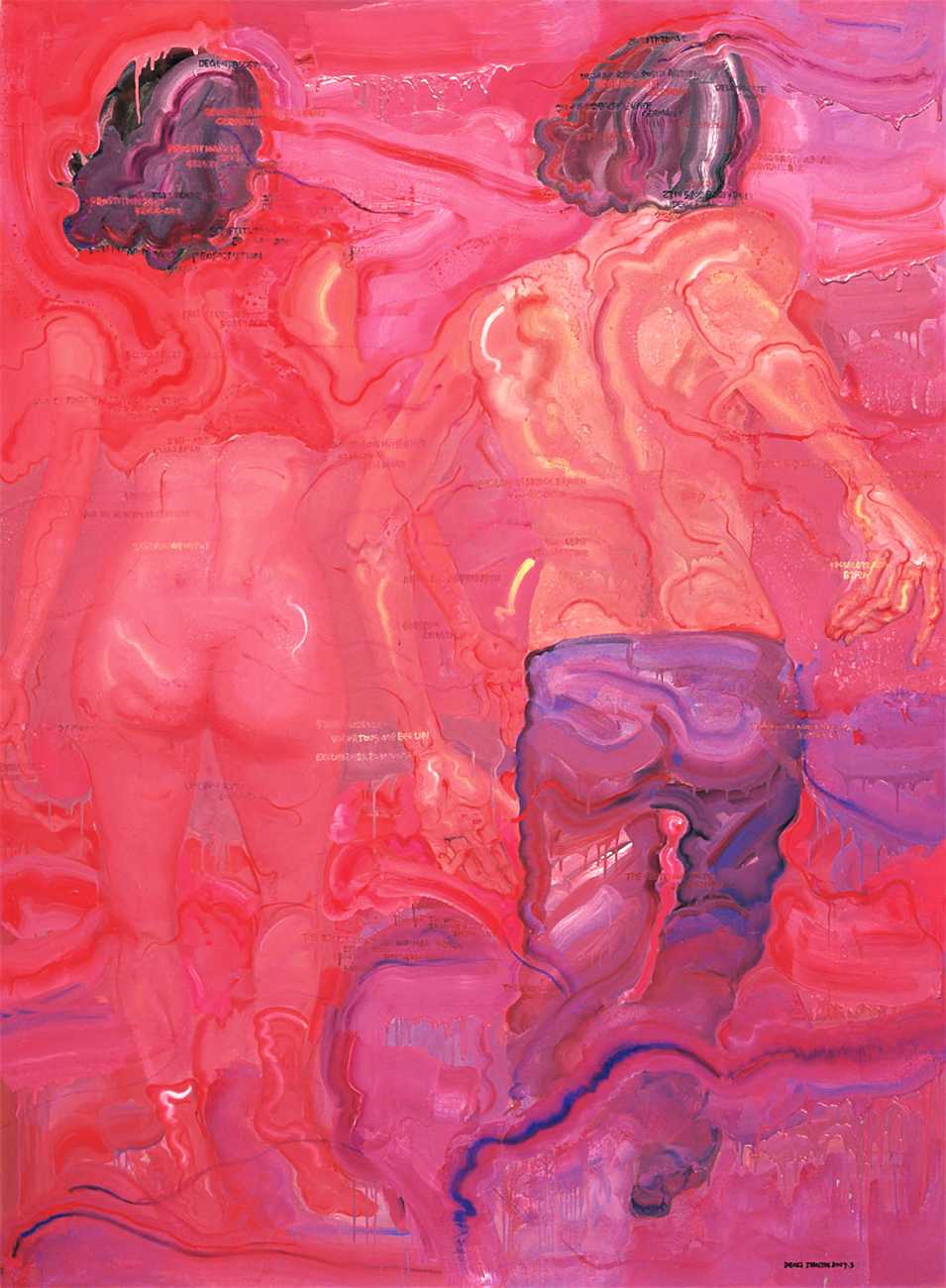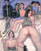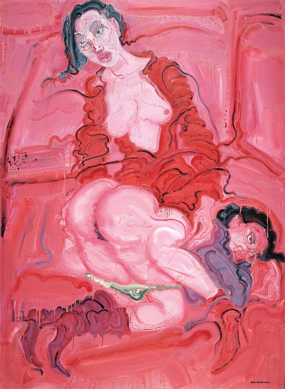 This series of Deng Jianjin’s paintings, made between 2006 and 2008, explores the world of dreams – and nightmares. His colour schemes here are more varied, the fantasies include public humiliation and spanking, and he introduces superimposed text in many of the canvases reflecting what the protagonists might be turning over in their minds. In the second painting, for example, the text near the man’s head includes ‘The Calculus of Desire’ – whose pleasure is whose?