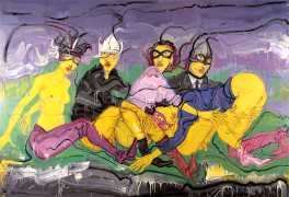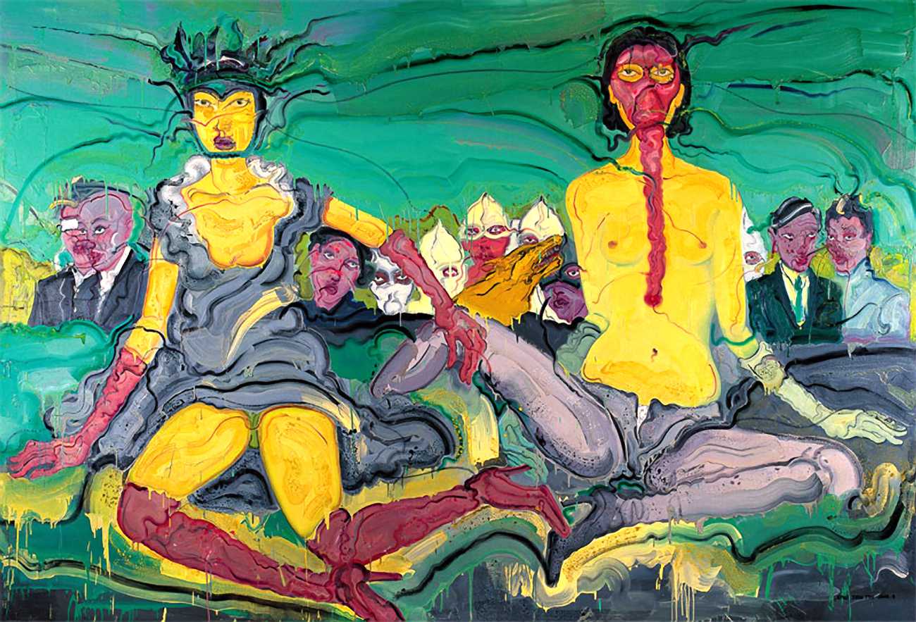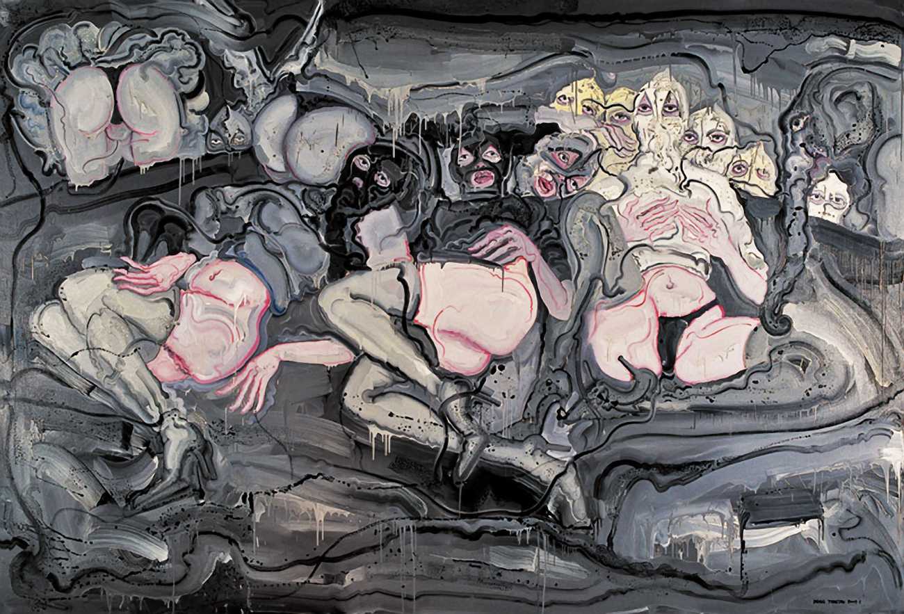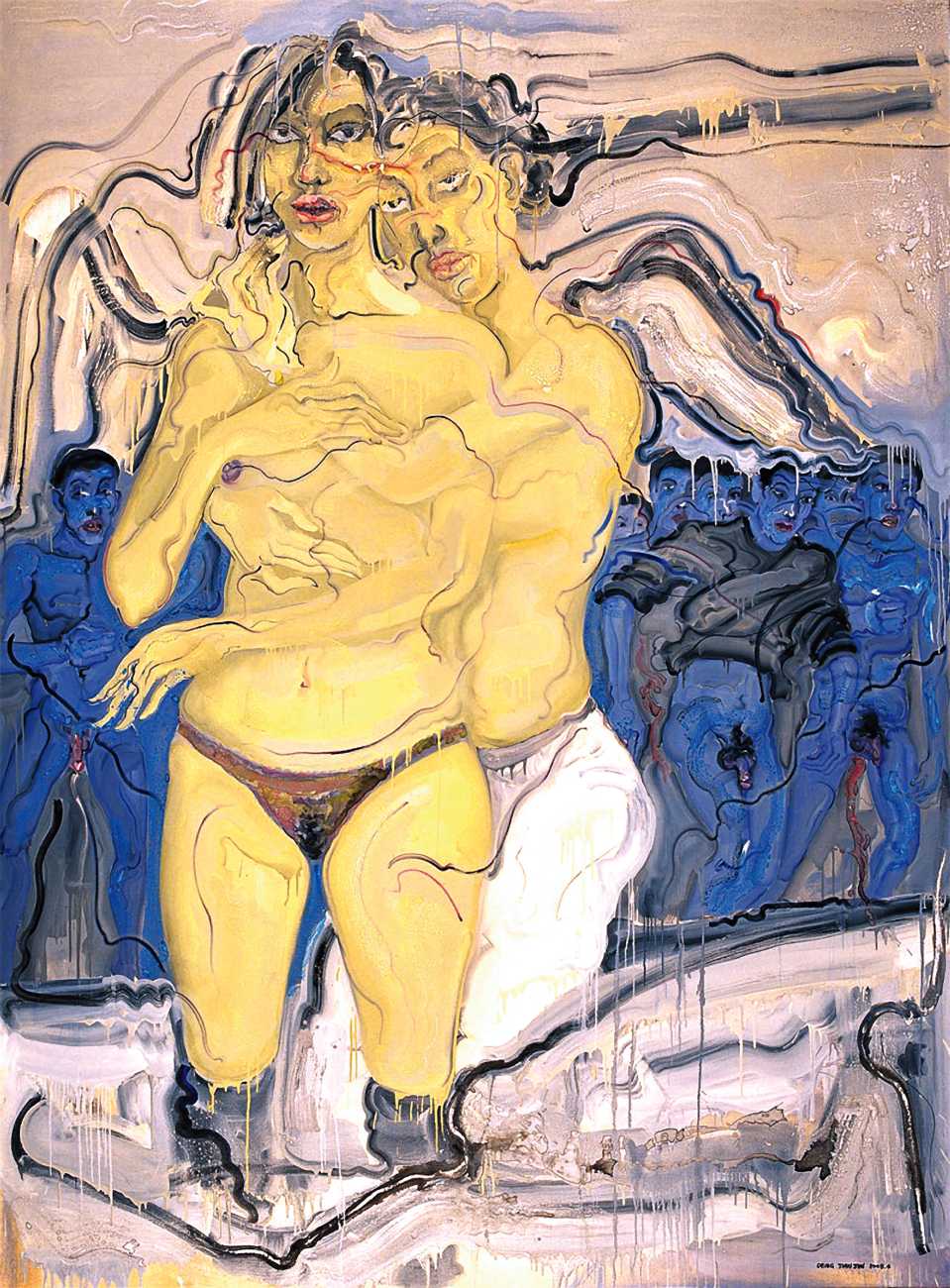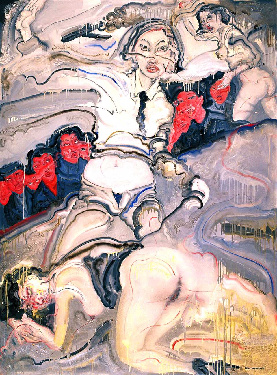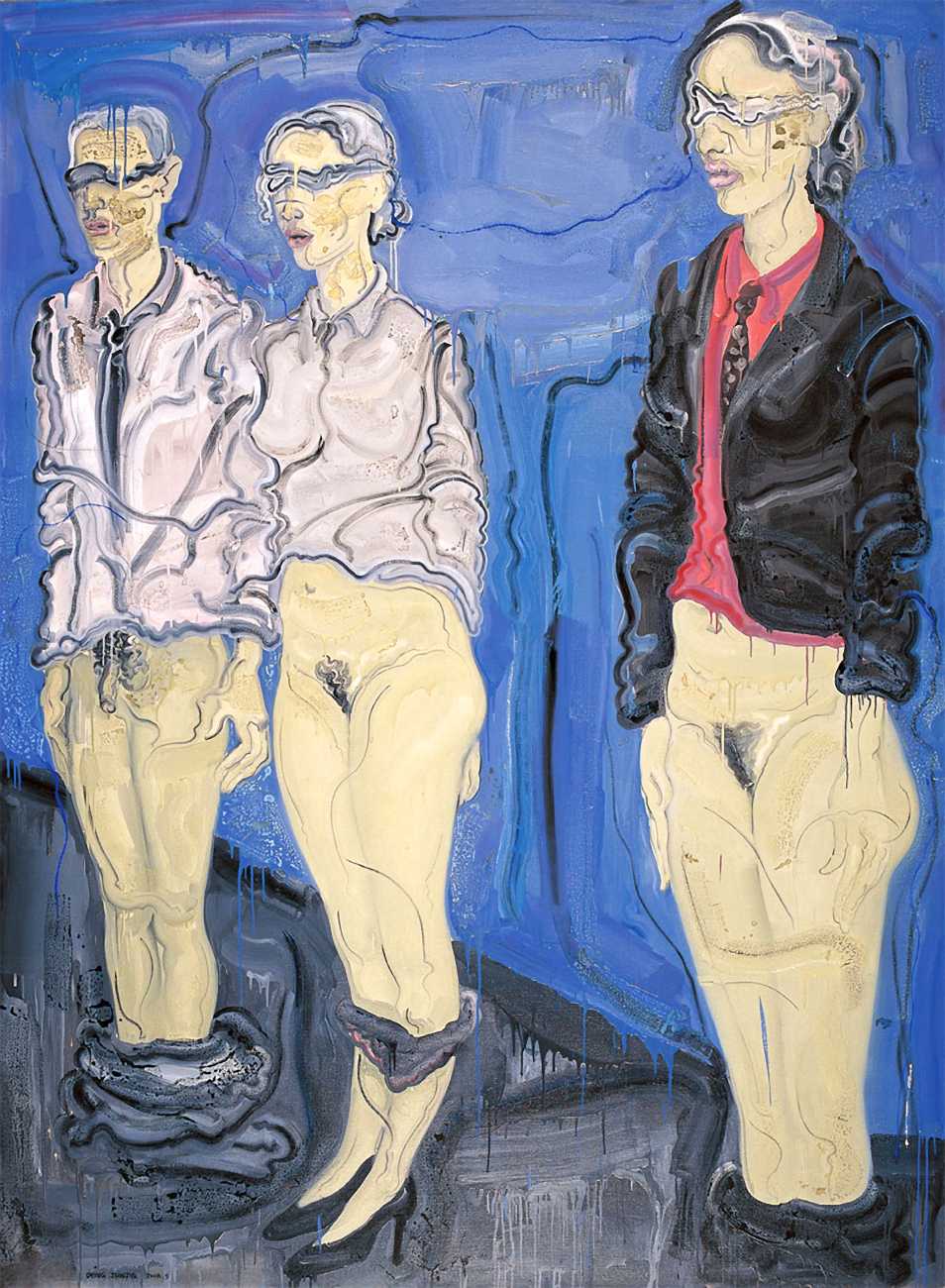 In his later work, Deng Jainjin starts to move towards scenes involving multiple characters, and in this 2008–9 sequence he explores the imagined erotic happenings behind the scenes, in the back yard of a generic upmarket Chinese house. It’s party time, and the guests are experimenting with group sex and dressing up. It doesn’t all look like unalloyed fun though.