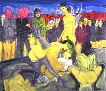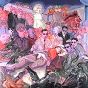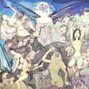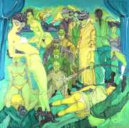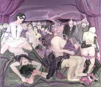 Is that strange headgear a condom, a gasmask, something from a Venetian carnival, or part of a latex BDSM kit? Confusion and chaos reign in these orgiastic canvases, and it seems that Deng’s imagination has nowhere further to go.