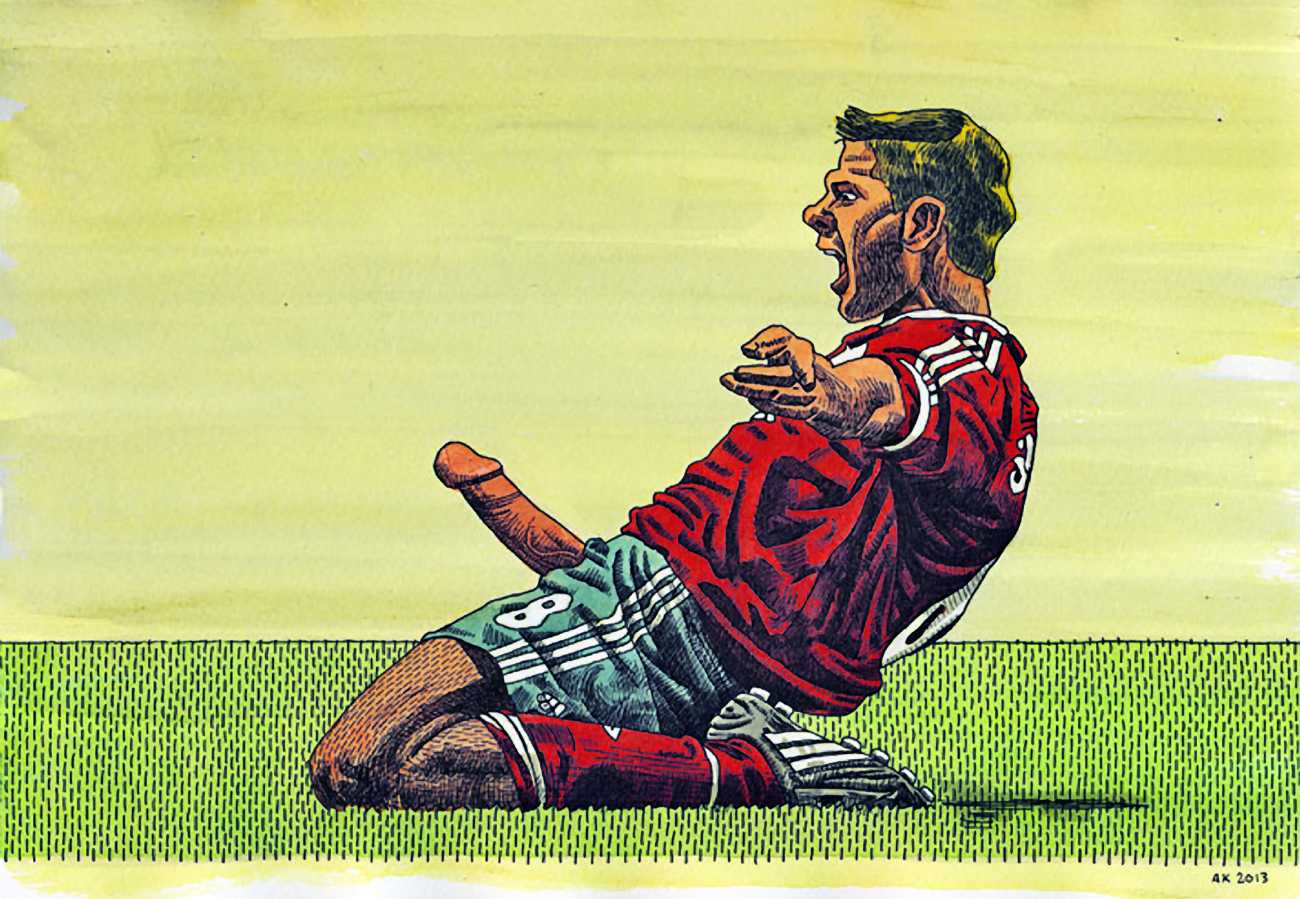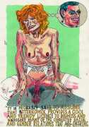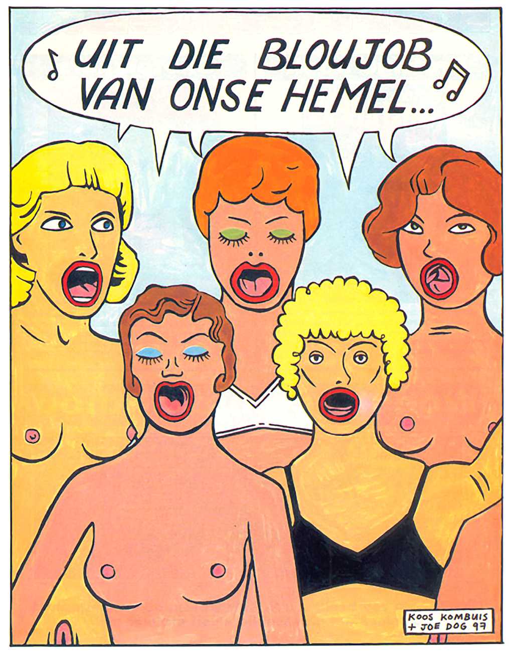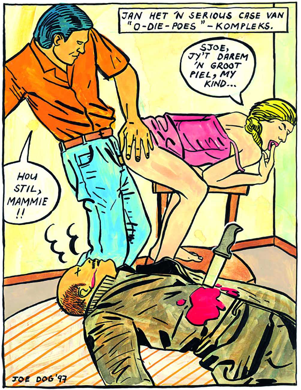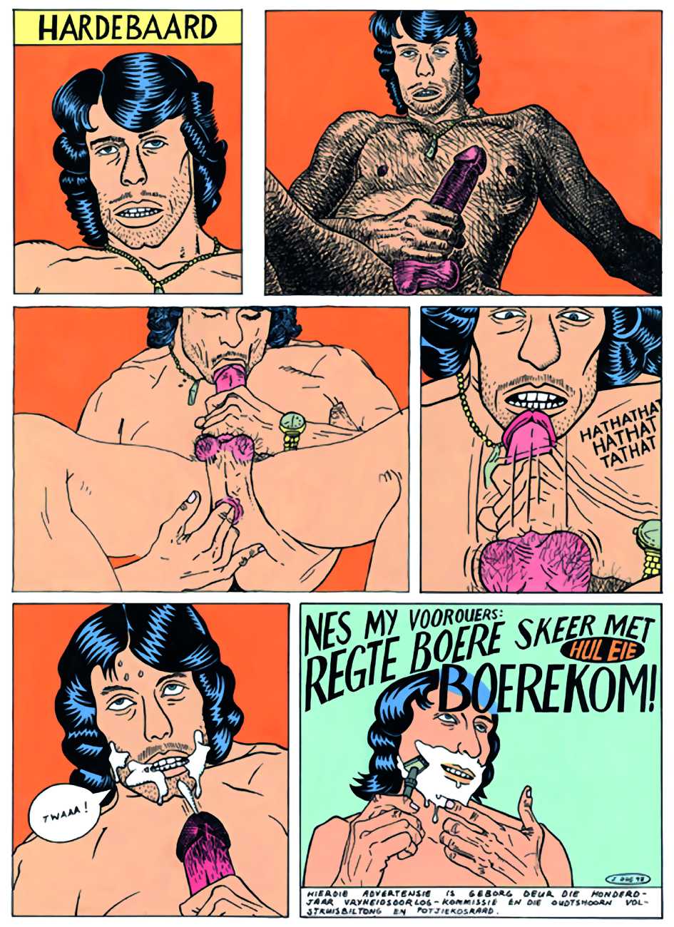 Here we share a selection of these ‘erotic’ works, drawn from Kannemeyer’s journals and sketchbooks, and the commercial work that he did for Loslyf, an Afrikaans version of Hustler, in the late 1990s. The iconoclastic assault in Kannemeyer’s work is often both erotic and confrontational towards the values surrounding sex and nudity in the ‘new’ South Africa. Even though these values have changed radically in recent years, Kannemeyer continues to use such imagery because it allows for raw conceptual debates about the country’s values and double standards. As in Kannemeyer’s Bitterkomix work, the target here is mostly the white Afrikaner male.