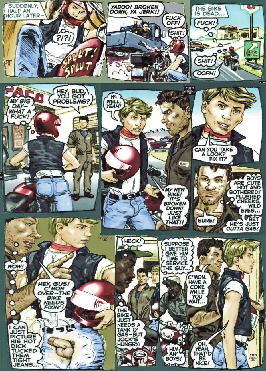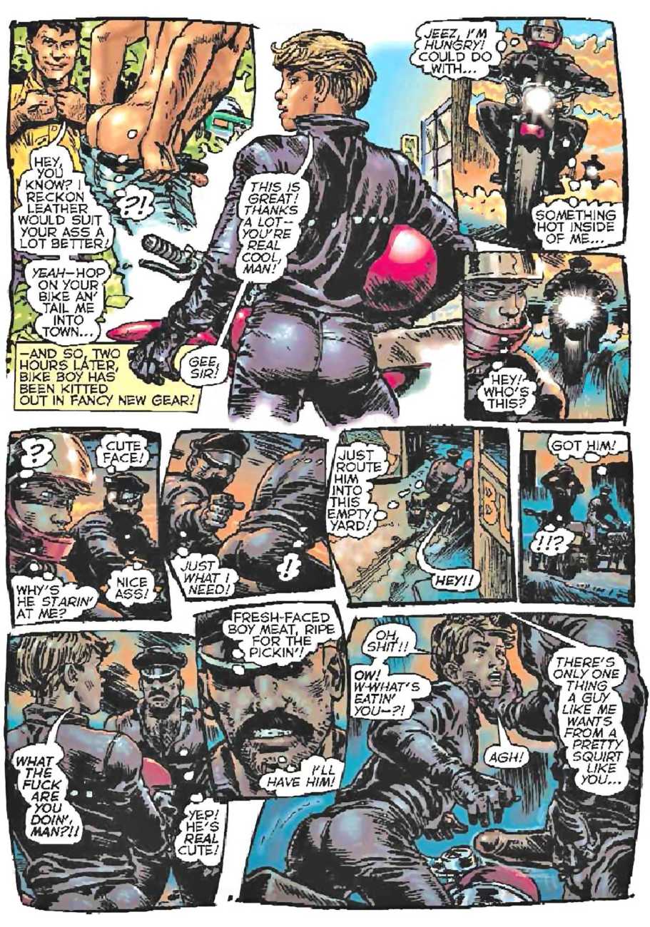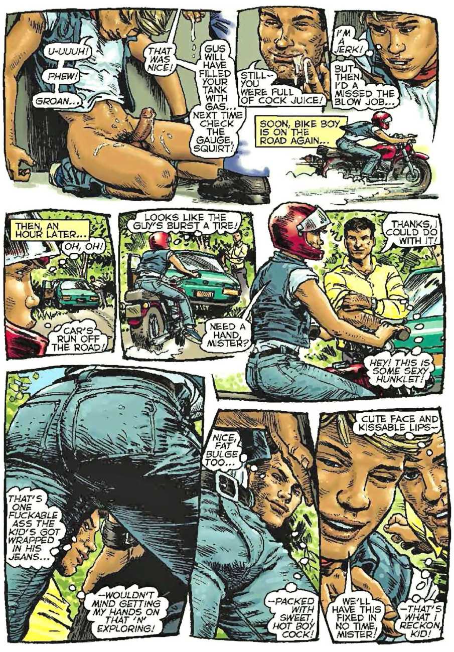 The Bike Boy storyline is a straightforward coming-of-age: ‘It’s my birthday, eighteen! And what a hot gift I got waitin’ for me.’ Bike Boy wastes no time exploring his new gift, being taken advantage of until he works out the best ways of taking advantage himself.