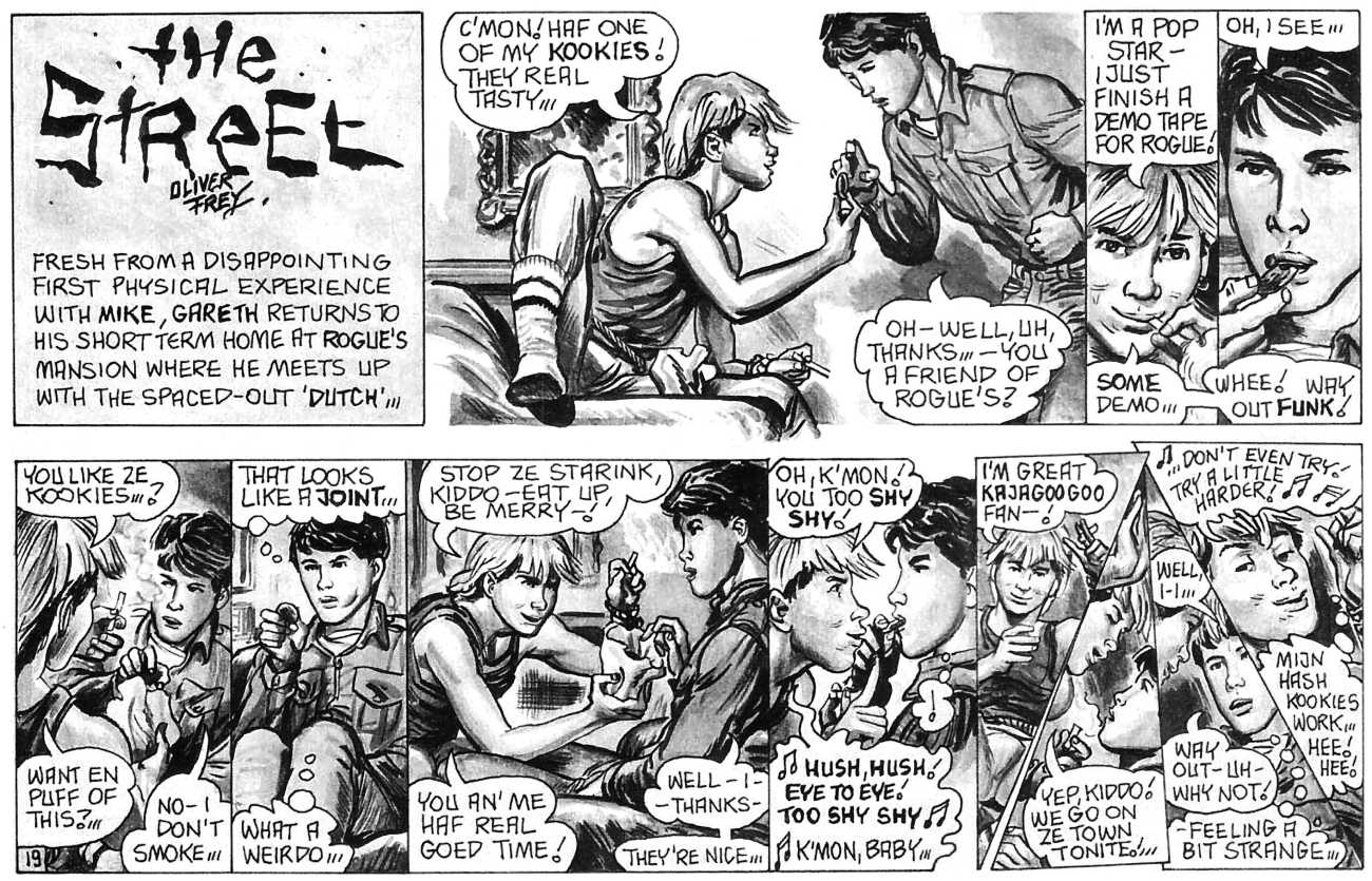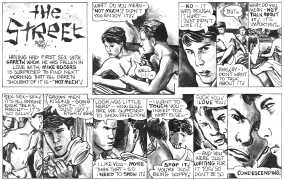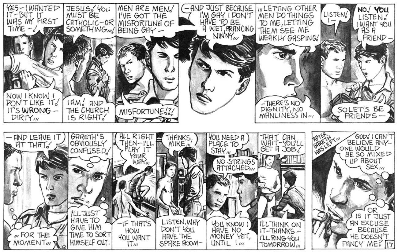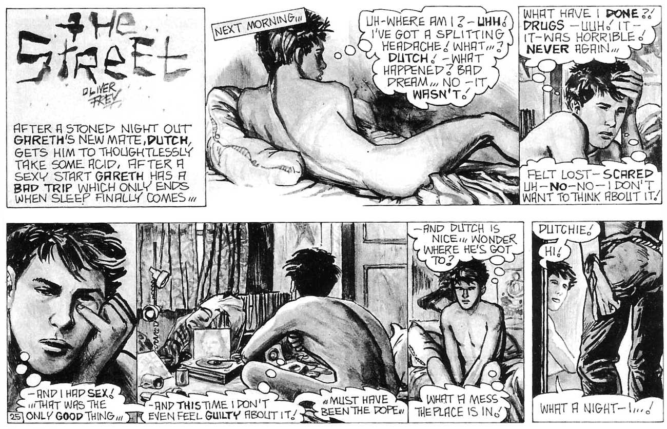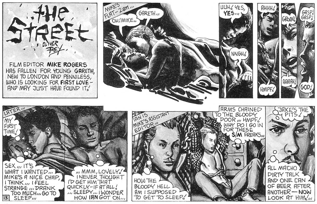 ‘The Street’ is Oliver Frey’s semi-autobiographical black and white strip which appeared in the early issues of HIM magazine. The comic appeared as panels spread across three pages of the magazine. Sadly, due to the changes made when Millivres took the magazine over, Frey only drew the strip for nine months, so we were left with just 27 artwork boards.
