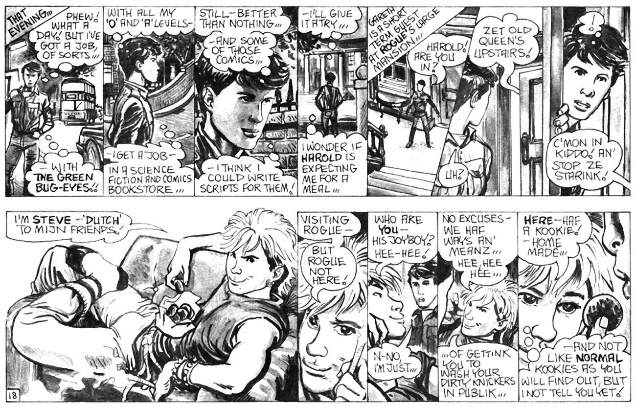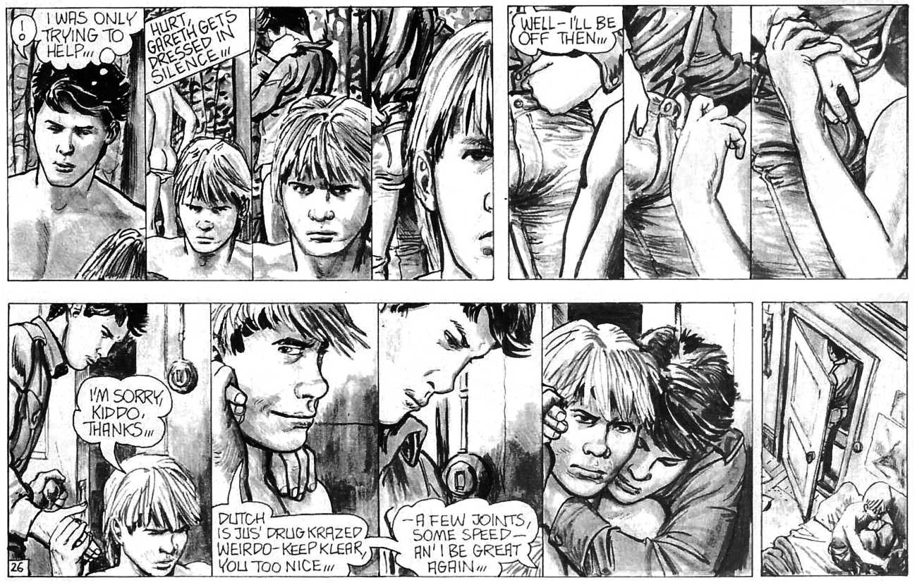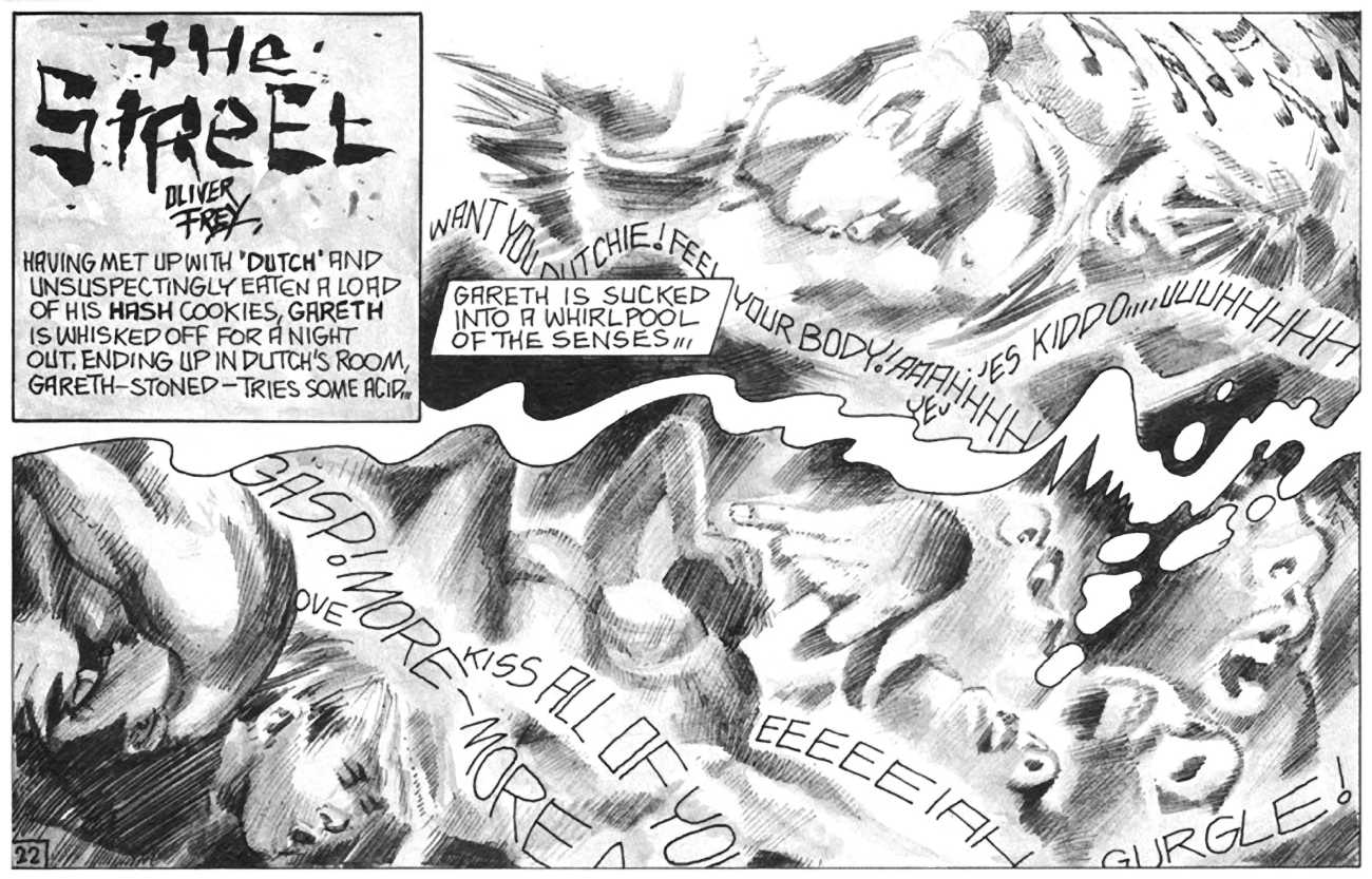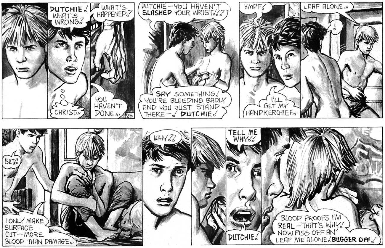 ‘The Street’ is Oliver Frey’s semi-autobiographical black and white strip which appeared in the early issues of HIM magazine. The comic appeared as panels spread across three pages of the magazine. Sadly, due to the changes made when Millivres took the magazine over, Frey only drew the strip for nine months, so we were left with just 27 artwork boards.