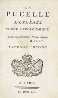 François-Marie Arouet, better known by his pen name Voltaire, was one of the most controversial writers and philosophers of the French Enlightenment, and the satirical poem La Pucelle d’Orléans (The Maid of Orleans) was one of his more contentious works. An epic and scandalous satire concerning the life of the not-yet-canonised Joan of Arc, the poem was outlawed, burned and banned throughout a great portion of Europe during the eighteenth and nineteenth centuries. Containing mockery and satirical commentary on the life and antics of its subject, the poem was regularly described as bawdy and licentious. Though he started writing the text in 1730, Voltaire never completed it.