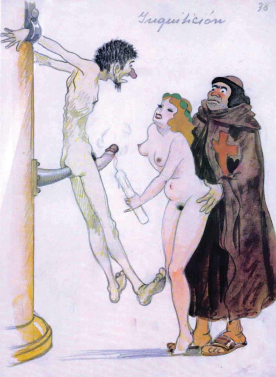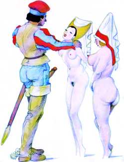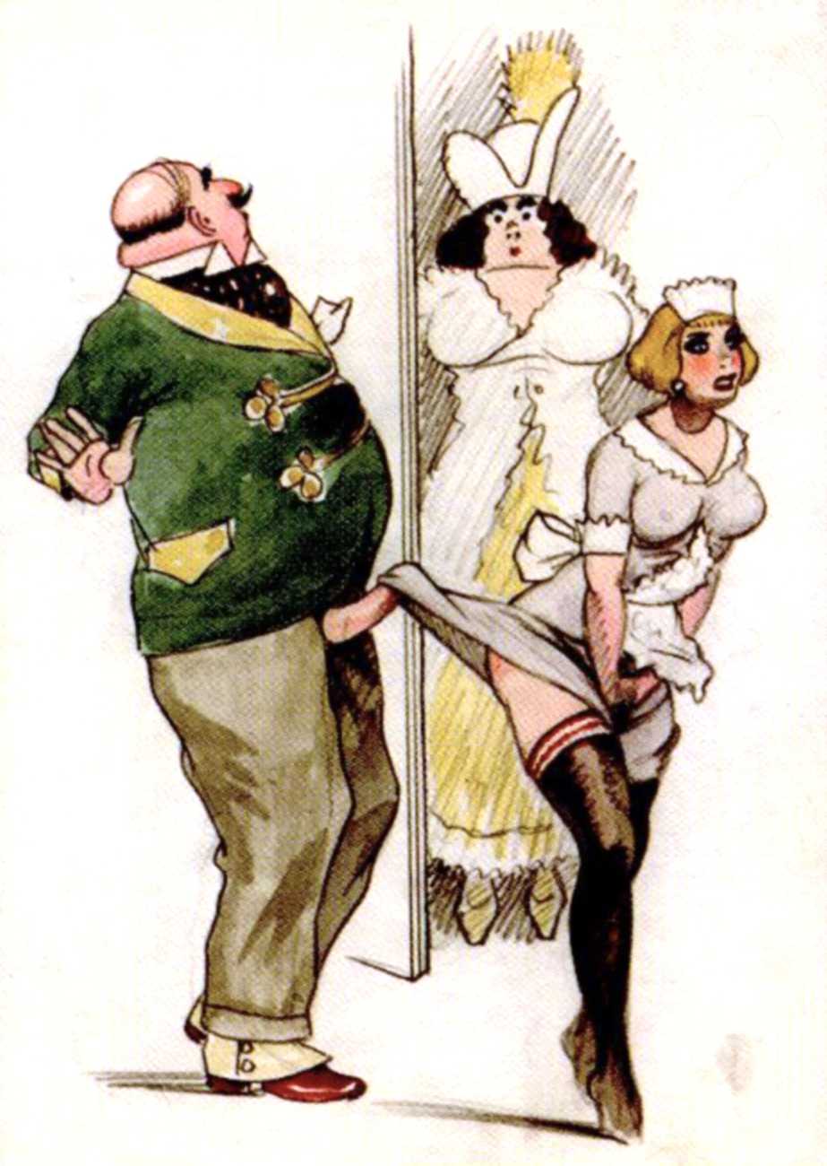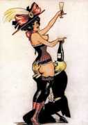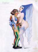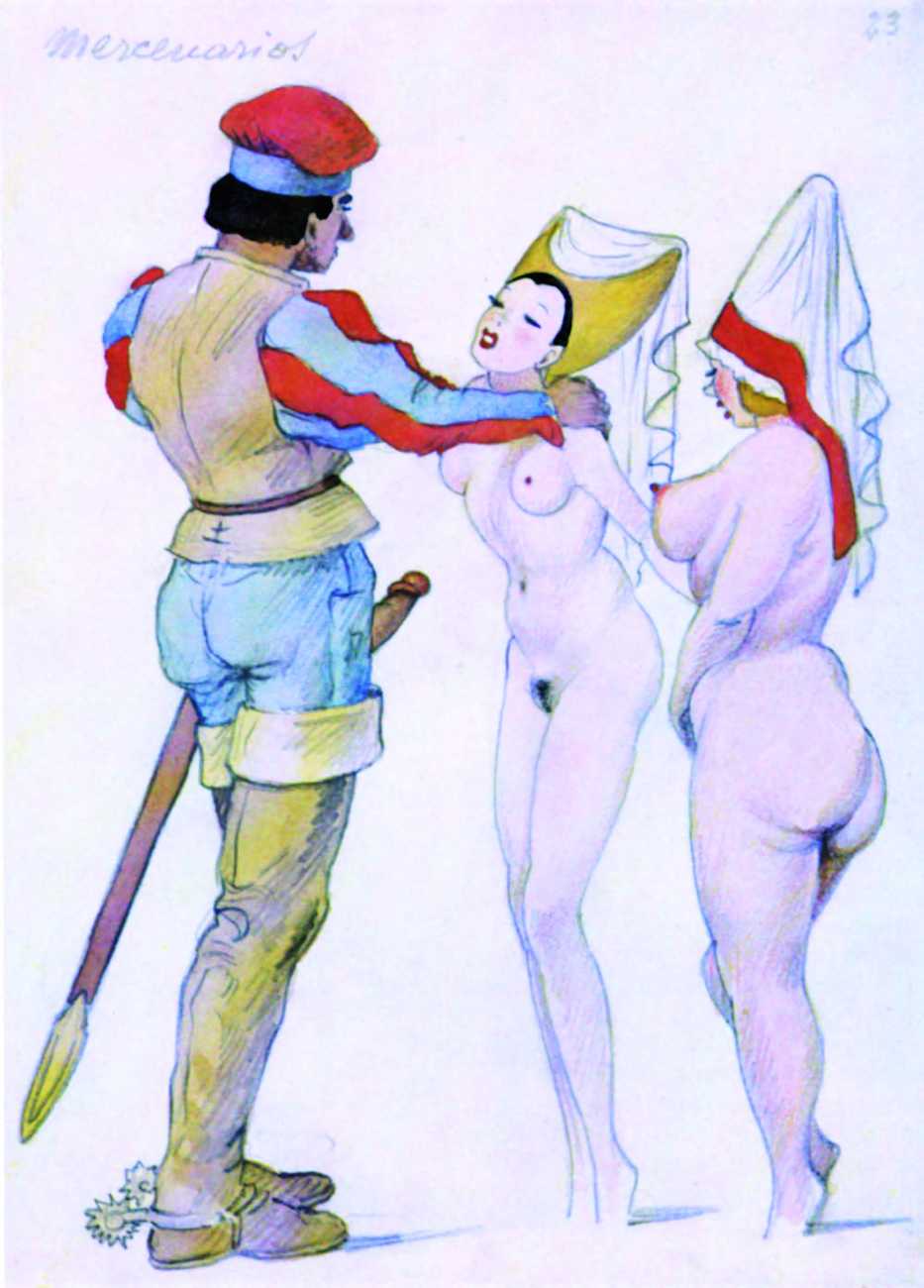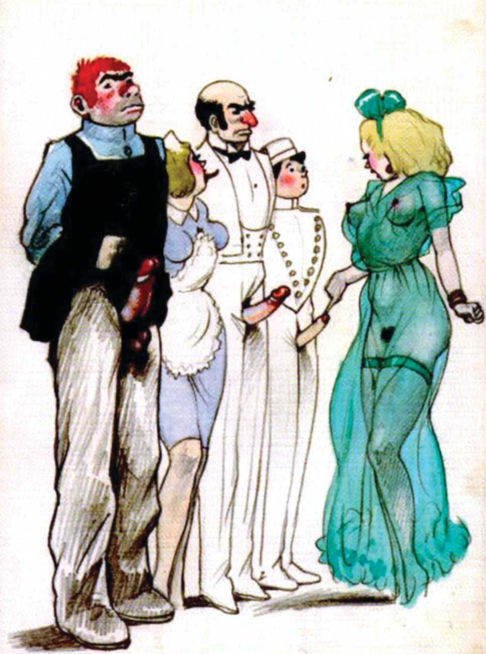 The prints you’re looking at are, in their own way, real collector’s pieces. Although we don’t know much about them or Gigi Amaldi, the artist who created them, we’ll try to briefly relate their stories and the circumstances in which they were created. We’re in Argentina, at some point during the 1930s, maybe during the 1940s. During that time, it was common that wealthy landowners and gentlemen of leisure got together for huge parties that frequently turned into orgies. Amaldi, a personal friend of one of the aforementioned gentlemen, drew the scenes on a whim and gave them to the parties’ attendees. One thing after another led to these drawings winding up in our editor’s hands. Despite their purpose being simple playfulness, it only takes one look to see the skill of the unknown hands that crafted them. That’s why we wanted to resurrect them for you to enjoy here. We hope the background information has been a good introduction, but we’ll leave you be now to enjoy this little morsel of erotic art history, presented exclusively for French Kiss readers!