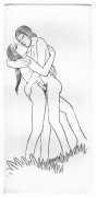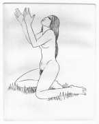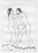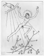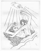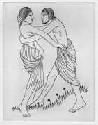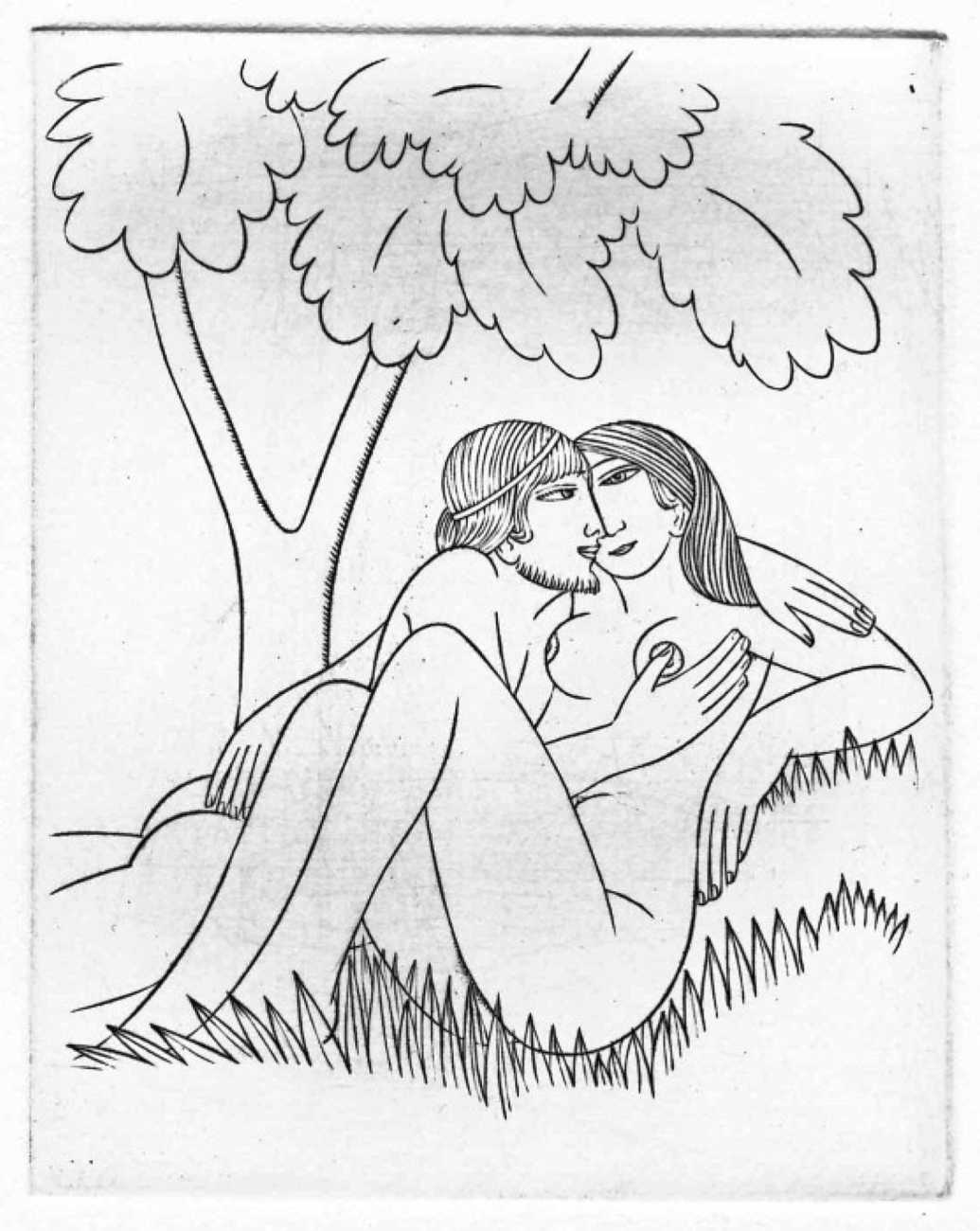 In 1926 he wrote Procreant Hymn, a semi-erotic celebration of the union of God and humankind, heaven and earth, and man and woman; his friend Robert Gibbings at The Golden Cockerel Press agreed to publish it in a limited edition, and asked Eric Gill to produce a set of engravings. In the book as published there are five images, known to be titled ‘God Sending’, ‘Earth Waiting’, ‘Earth Inviting’, ‘Dalliance’ and ‘Earth Receiving’, though the titles are not printed in the book. 175 numbered copies were printed for sale with a further 25 copies for presentation. There was also a notice, loosely inserted at the end of the book, which stated ‘Subscribers may be interested to know that three alternative designs have been engraved for this book and may be obtained separately from the artist’. As advertised in the notice, Gill made alternative plates, although there were actually four of these rather than three, with the addition of ‘Earth Wrestling’. They follow the composition of the published versions, but the male and female figures, already naked, are presented in a state of realistic arousal which would have been unexpected (and in many quarters unacceptable) at the time. Eric Gill also created a fifth additional engraving, entitled ‘Yahoo’, which was printed at the same time as Procreant Hymn; whether or not this was ever intended for inclusion is not known, but it is one of his best depictions of a woman’s body.