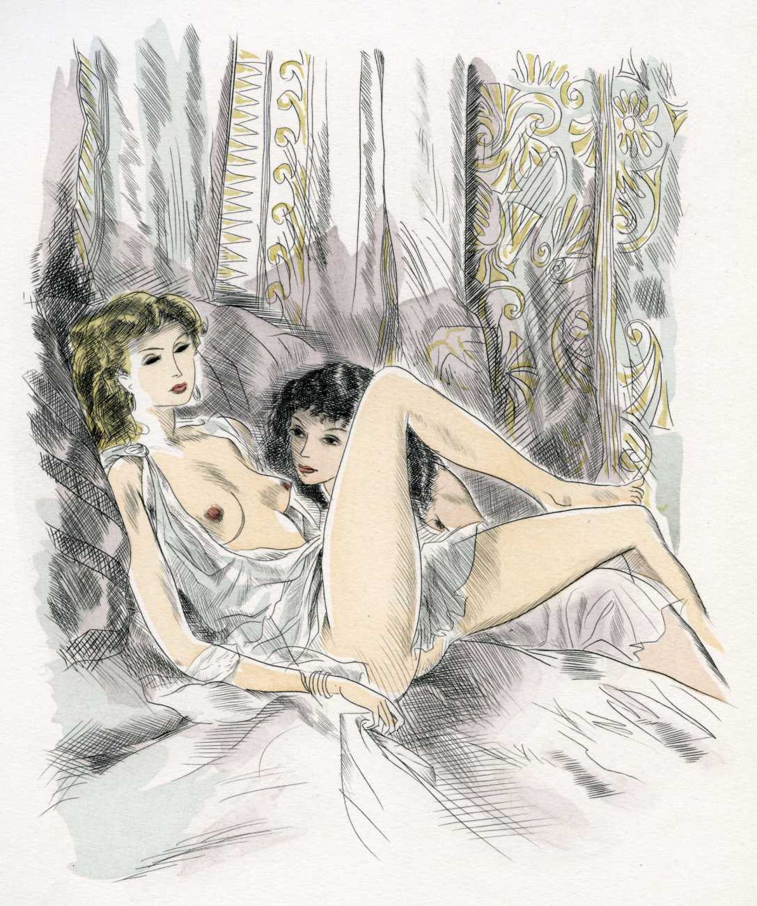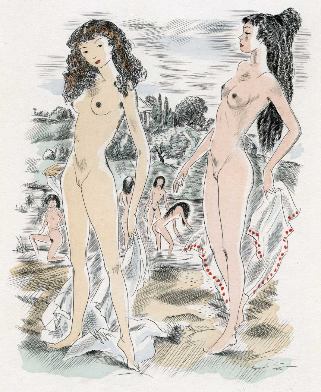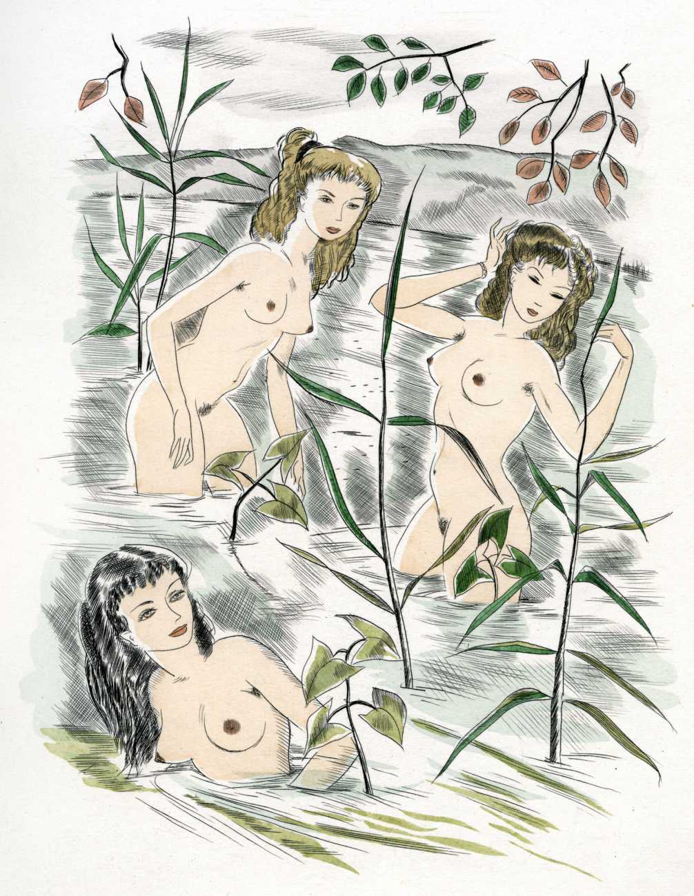 By the time Gaston Barret was commissioned to illustrate this edition, Les chansons de Bilitis had already attracted artists of the calibre of Sylvain Sauvage, Amandine Doré, Paul-Émile Bécat and Alméry Lobel-Riche, but until Barret nobody had included quite so much nubile pink flesh and quite so many young vulvas.
