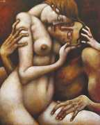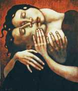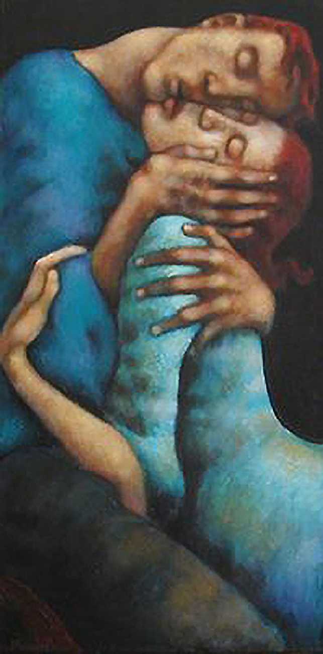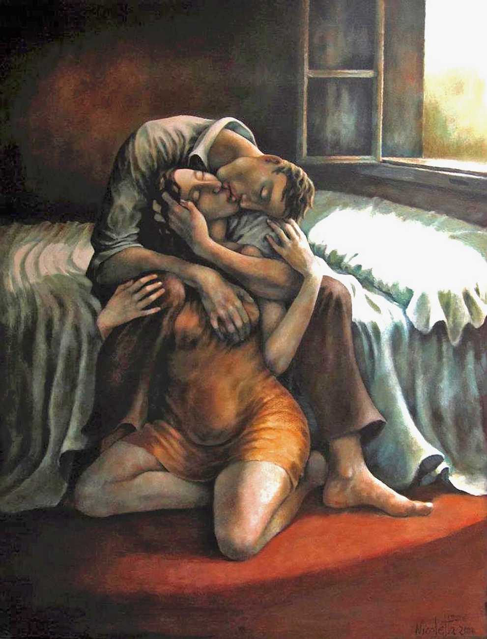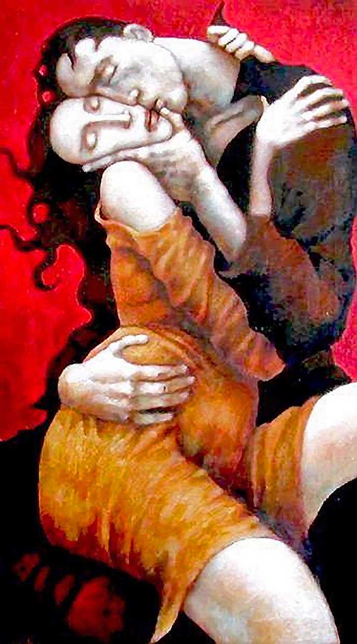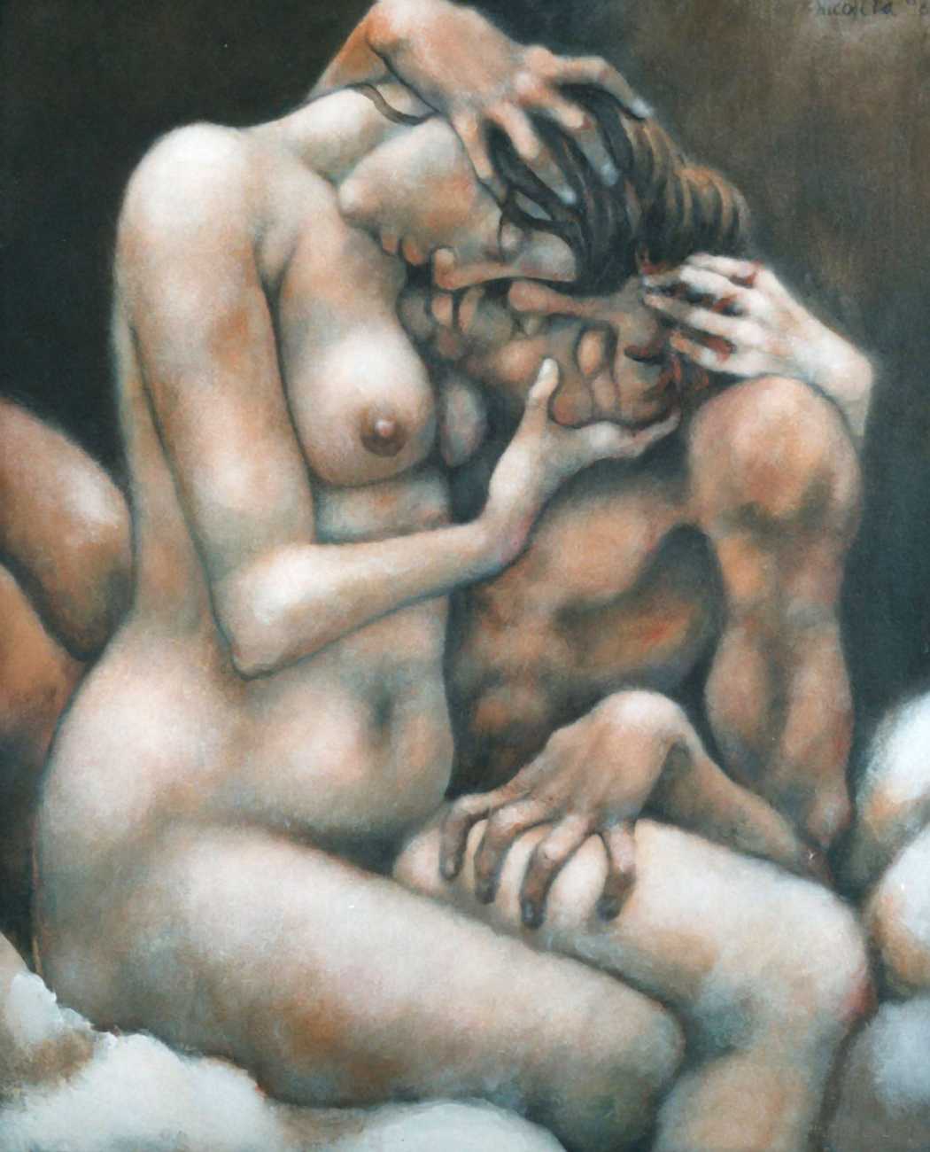 Between 2000 and 2004 Nicoletta worked on a series of paintings called Amantes (Lovers), a semi-autobiographical sequence illustrating a passionate, sensual liaison set against an Italianate background. Worked in rich colours, the lovers’ closed eyes and tight embraces suggest a world in which only the relationship exists, to the exclusion of everything else.
