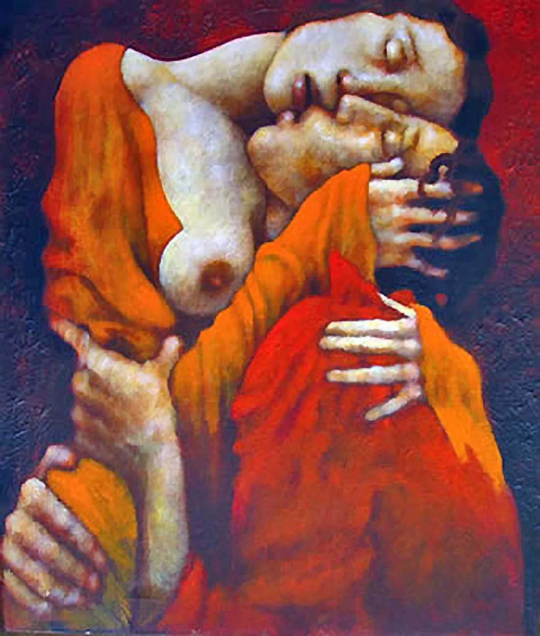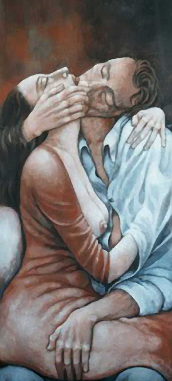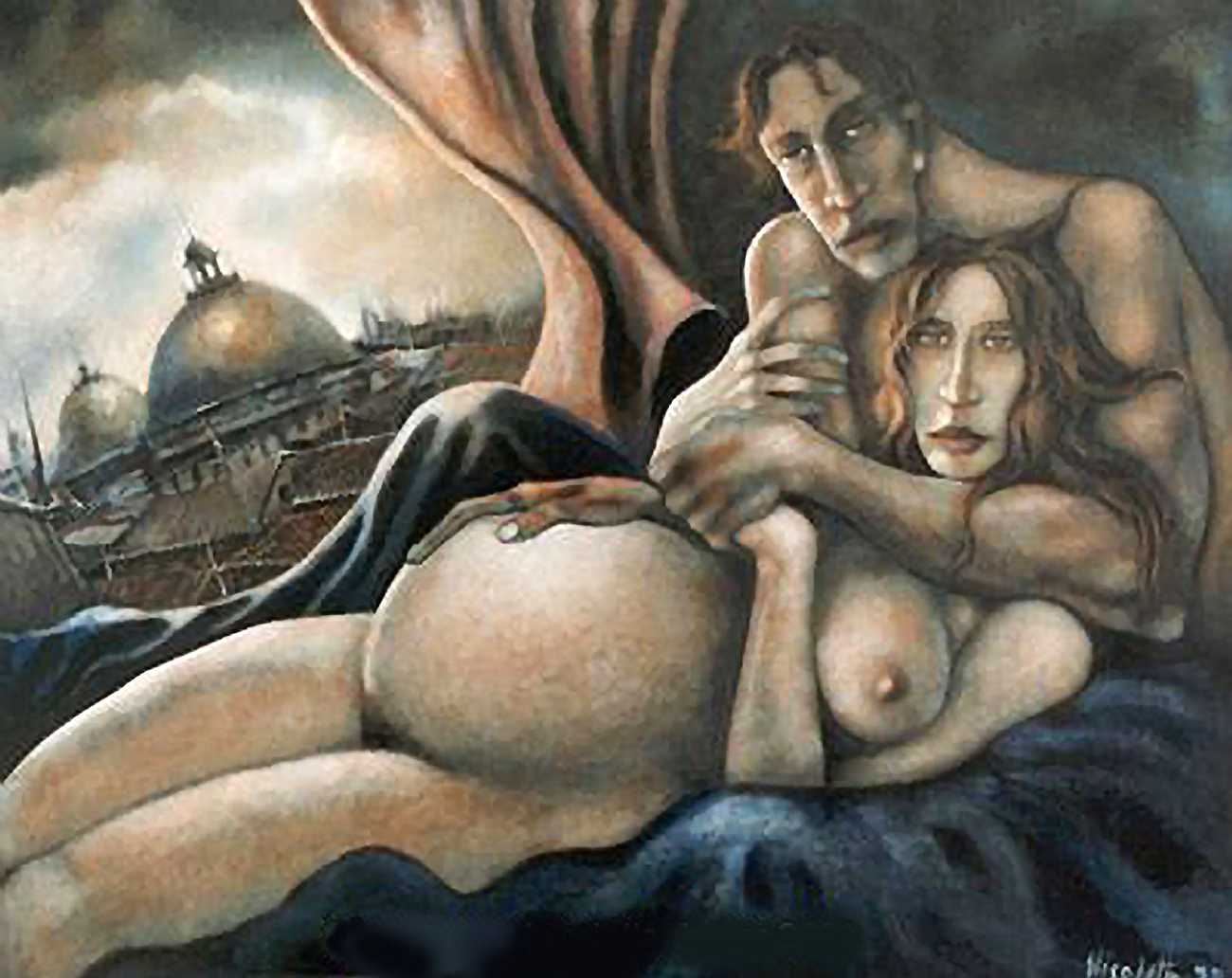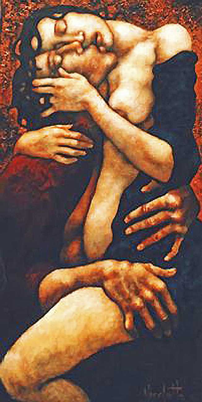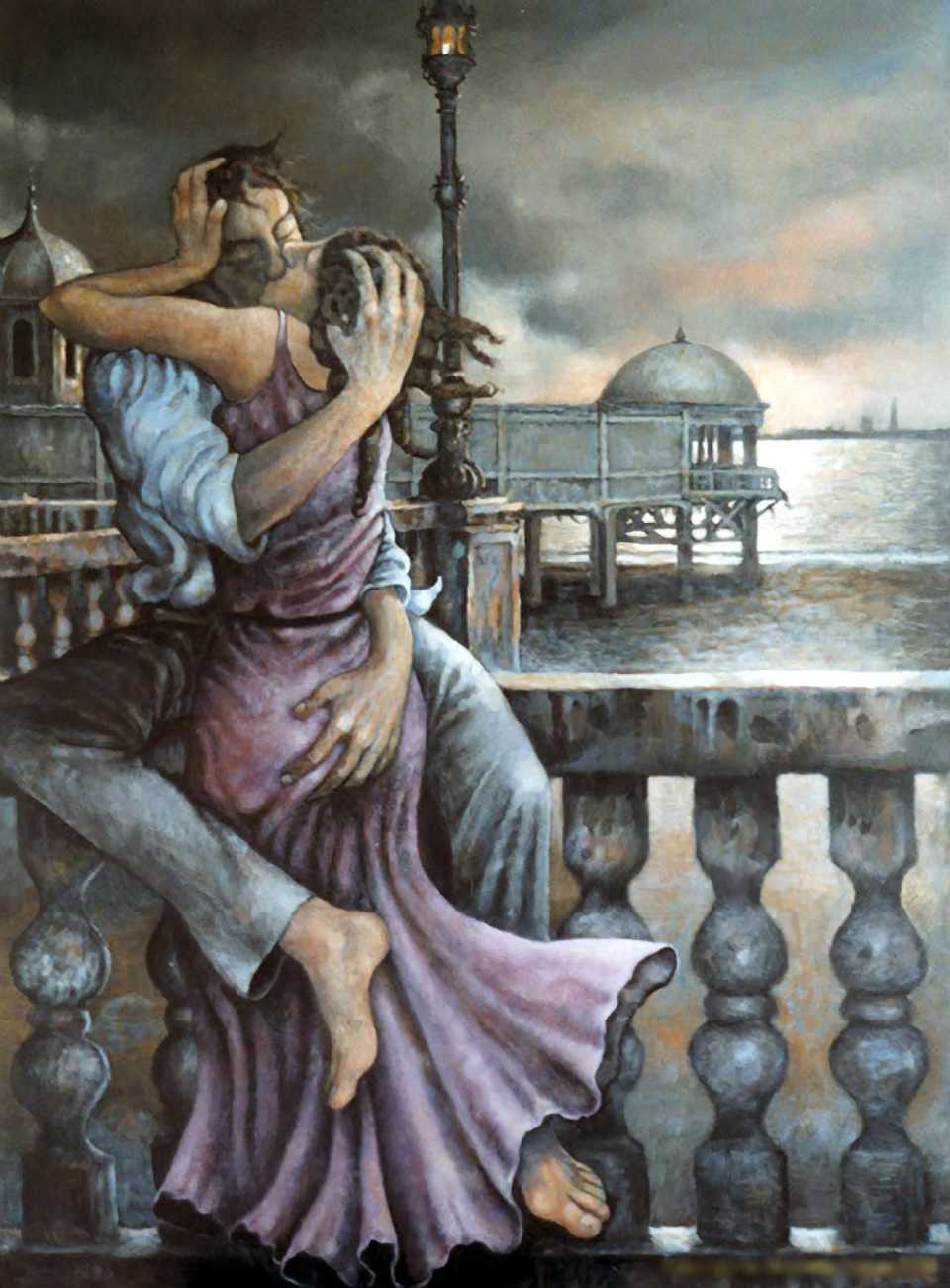 Between 2000 and 2004 Nicoletta worked on a series of paintings called Amantes (Lovers), a semi-autobiographical sequence illustrating a passionate, sensual liaison set against an Italianate background. Worked in rich colours, the lovers’ closed eyes and tight embraces suggest a world in which only the relationship exists, to the exclusion of everything else.