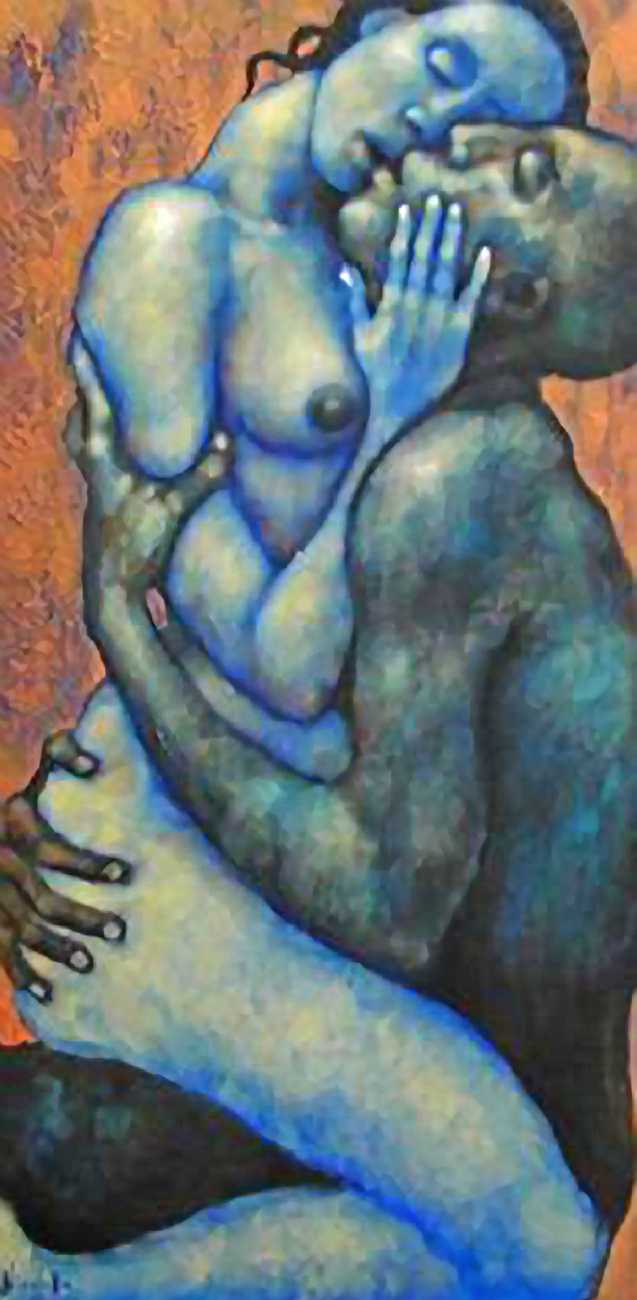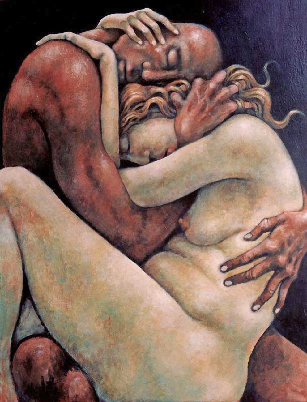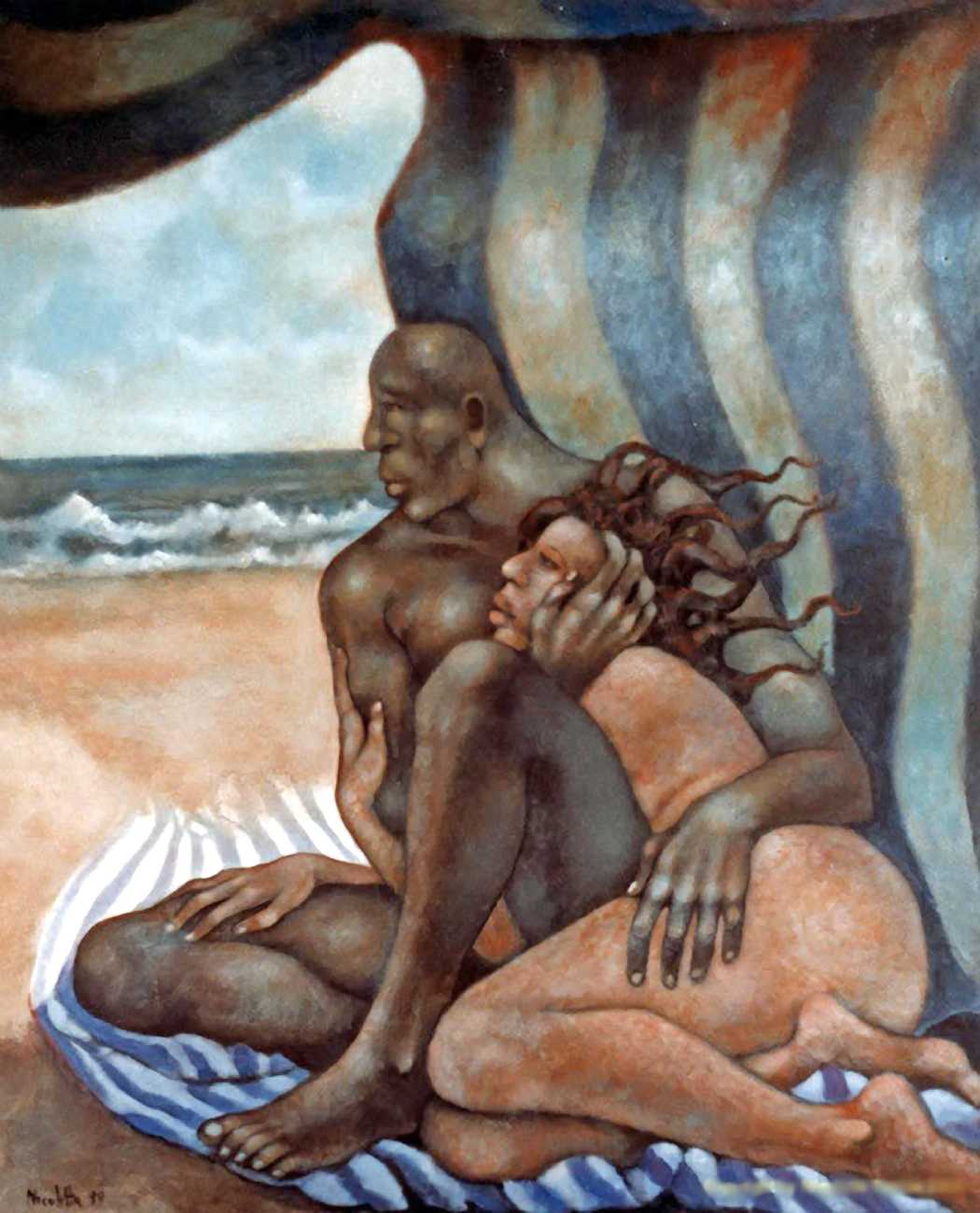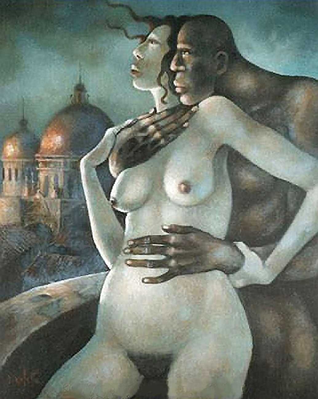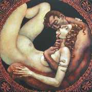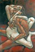 Between 2000 and 2004 Nicoletta worked on a series of paintings called Amantes (Lovers), a semi-autobiographical sequence illustrating a passionate, sensual liaison set against an Italianate background. Worked in rich colours, the lovers’ closed eyes and tight embraces suggest a world in which only the relationship exists, to the exclusion of everything else.