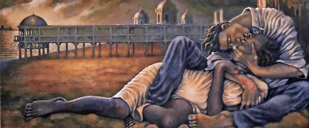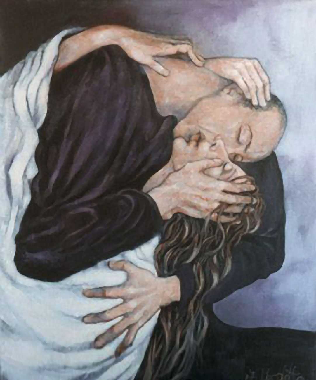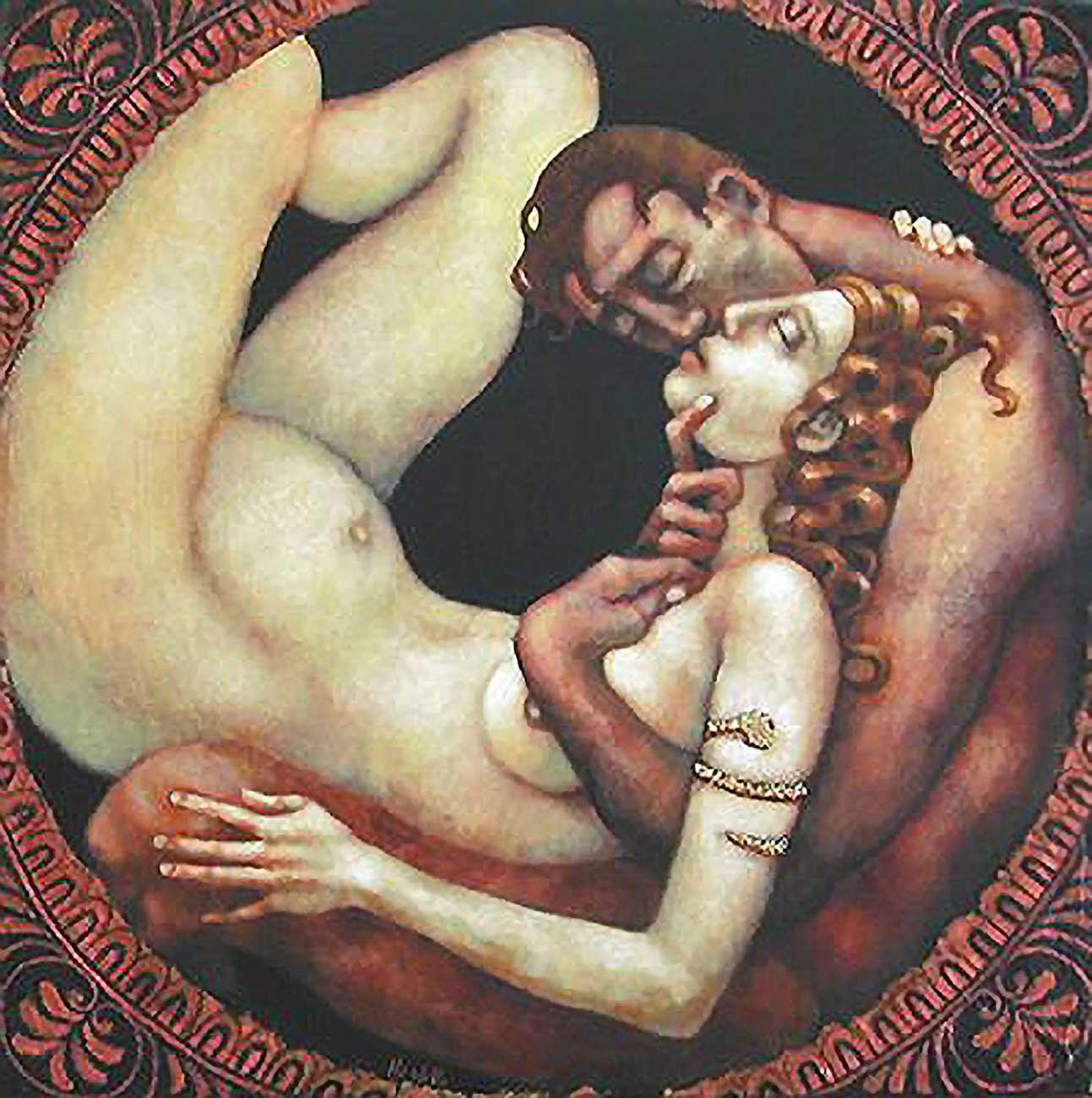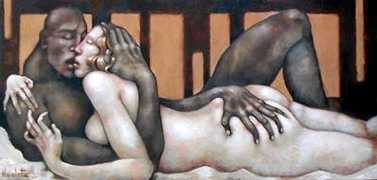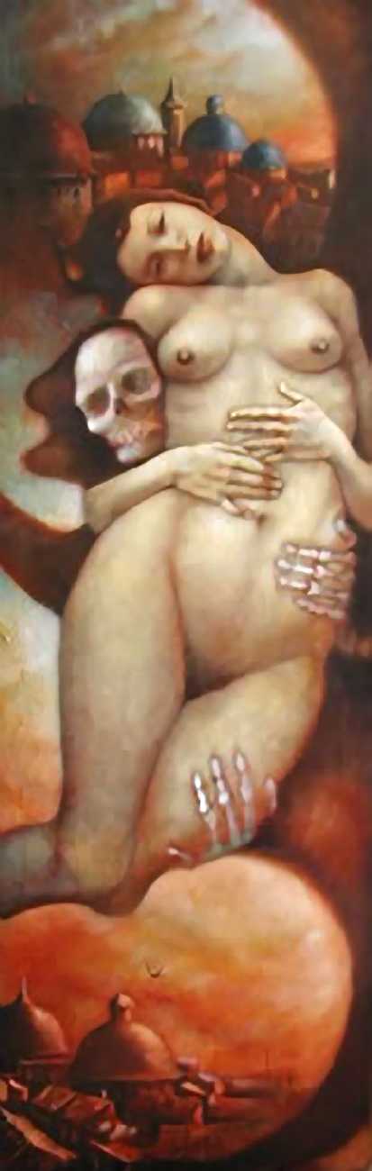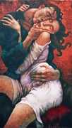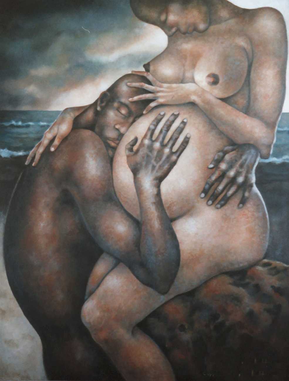 Between 2000 and 2004 Nicoletta worked on a series of paintings called Amantes (Lovers), a semi-autobiographical sequence illustrating a passionate, sensual liaison set against an Italianate background. Worked in rich colours, the lovers’ closed eyes and tight embraces suggest a world in which only the relationship exists, to the exclusion of everything else.