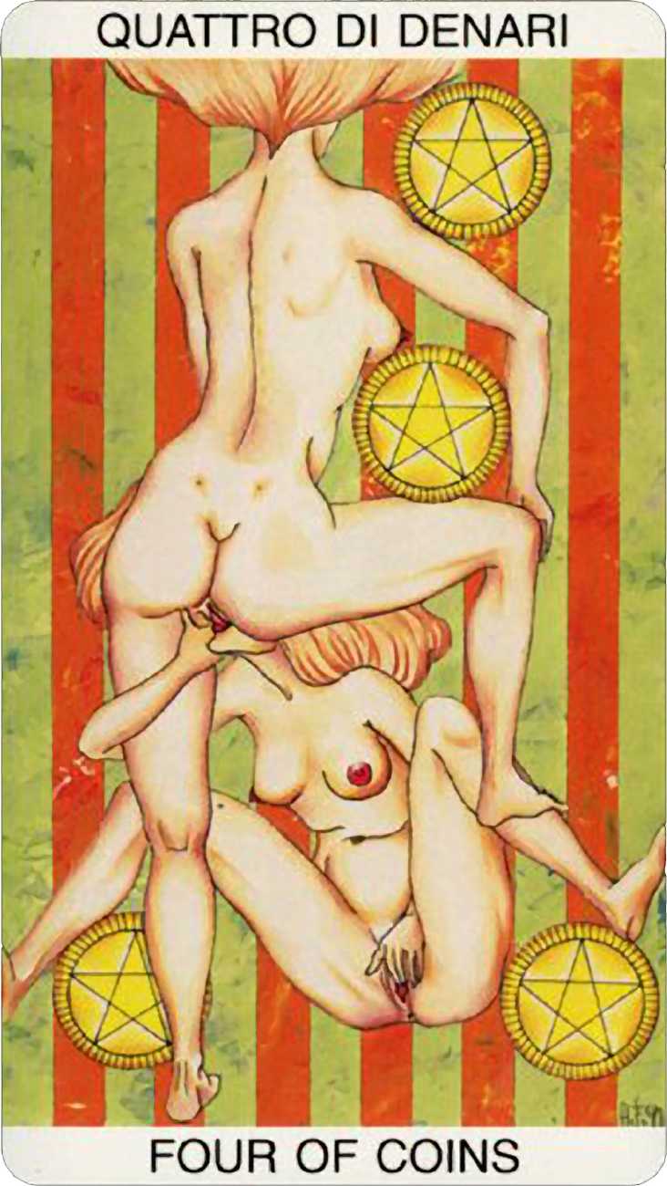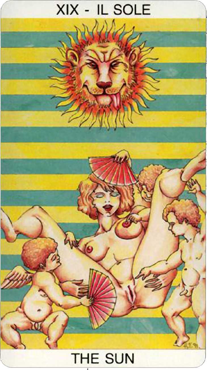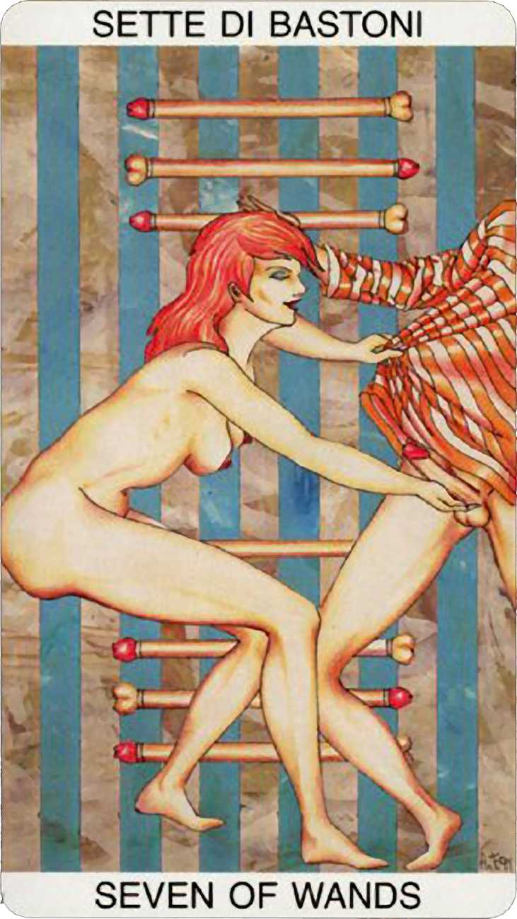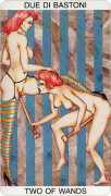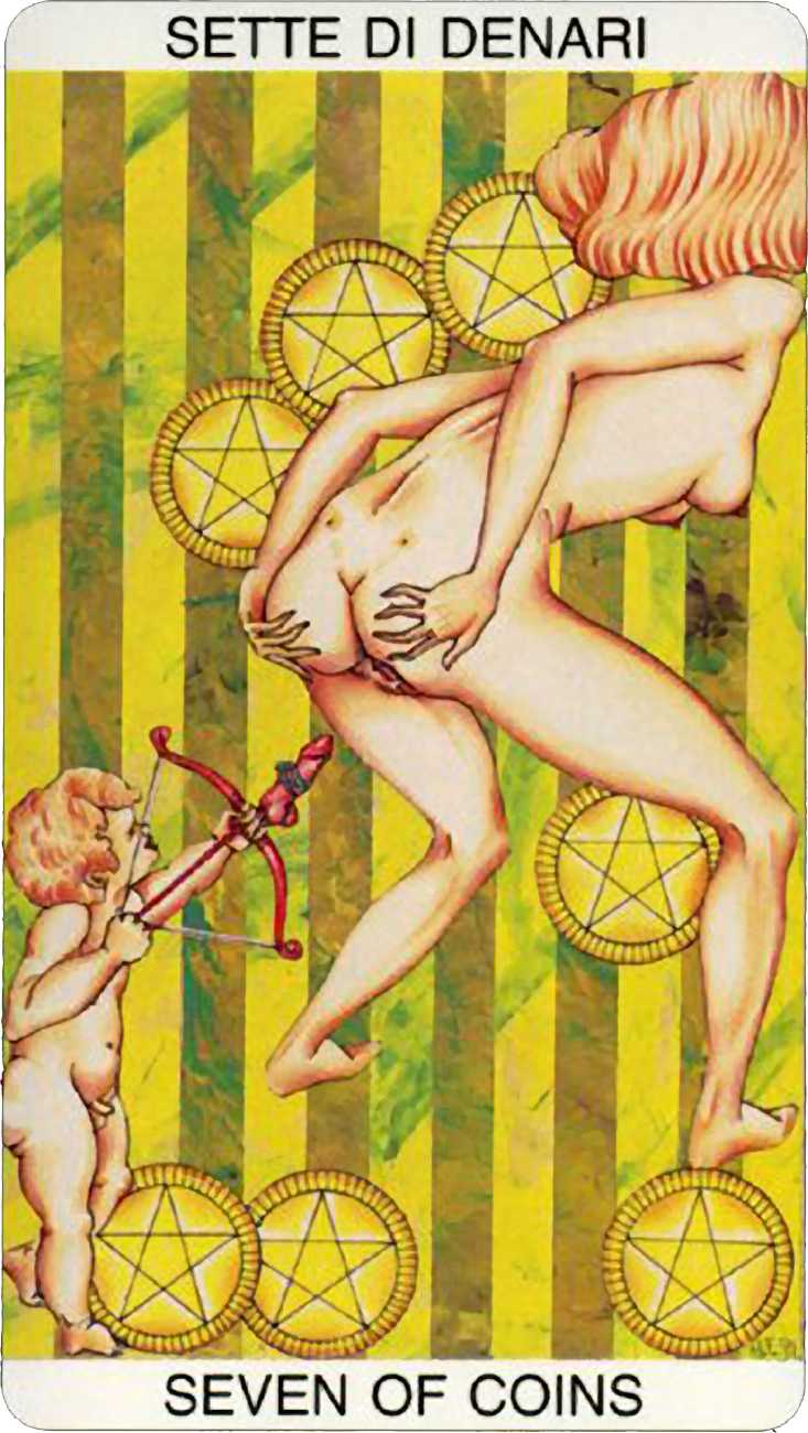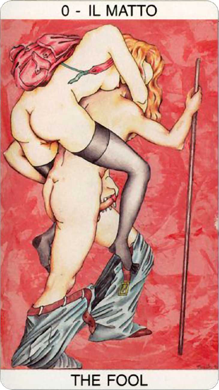 The Tarocco Erotico dei Giardini di Priapo (Erotic Tarot of the Gardens of Priapus) is by quite some way the most explicitly sexual of all the many tarot packs created by Amerigo Folchi.