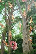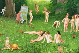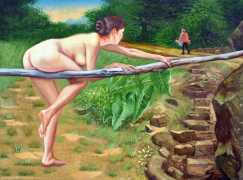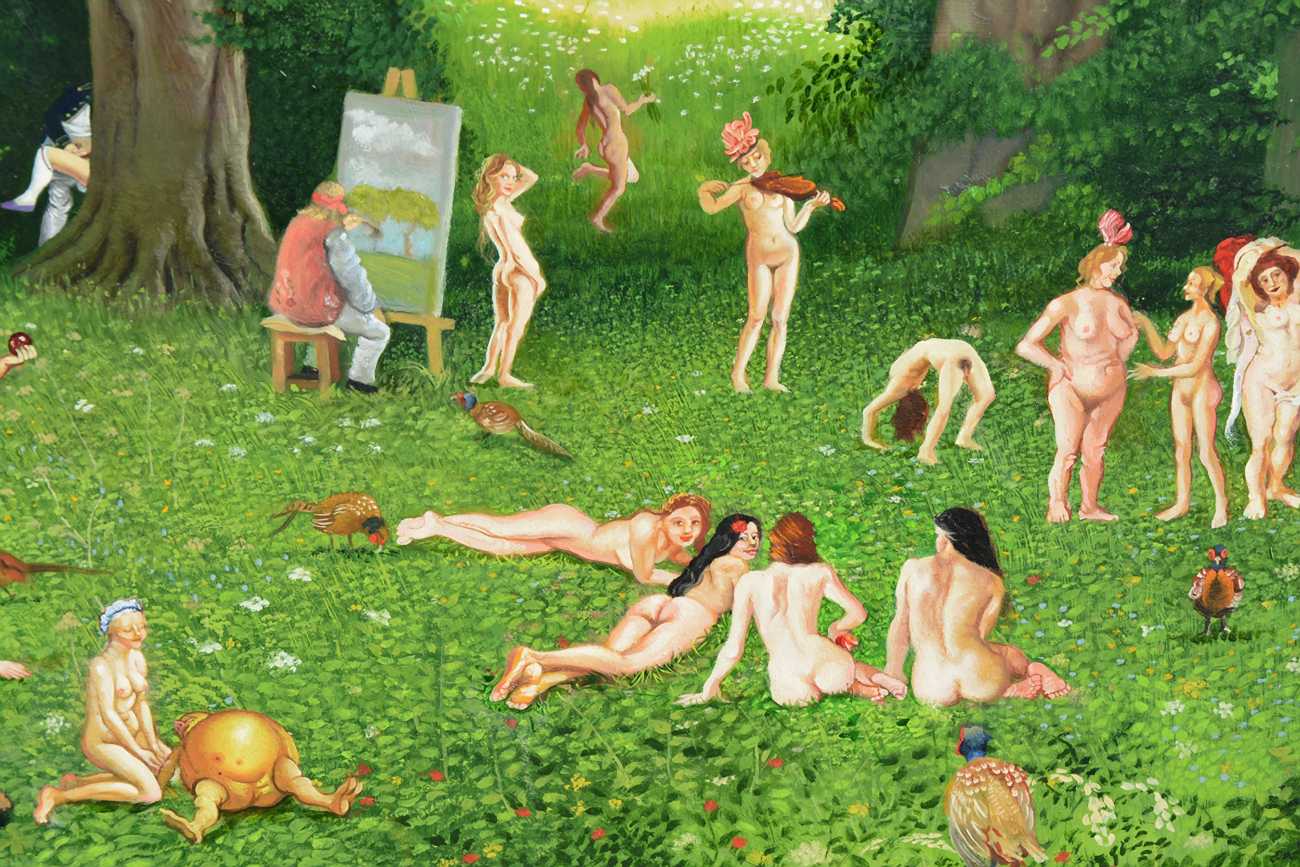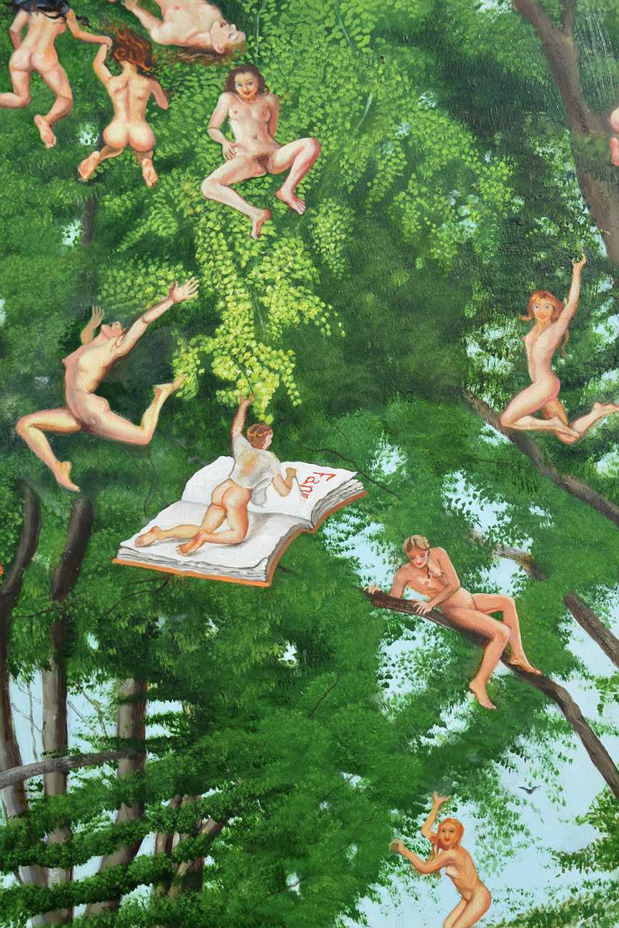 The large canvas ‘An Artist’s Thoughts Imploding’, shown here in its entirety and in detailed sections, is the most telling, in which a diminutive artist is surrounded by a woodland dripping with naked women. Maybe the last two paintings, ‘Self-portrait leaving my Model at the End of the Day’ and ‘Lost in Thought’, are more honest reflections on the relationship between artist, model, and reality.
